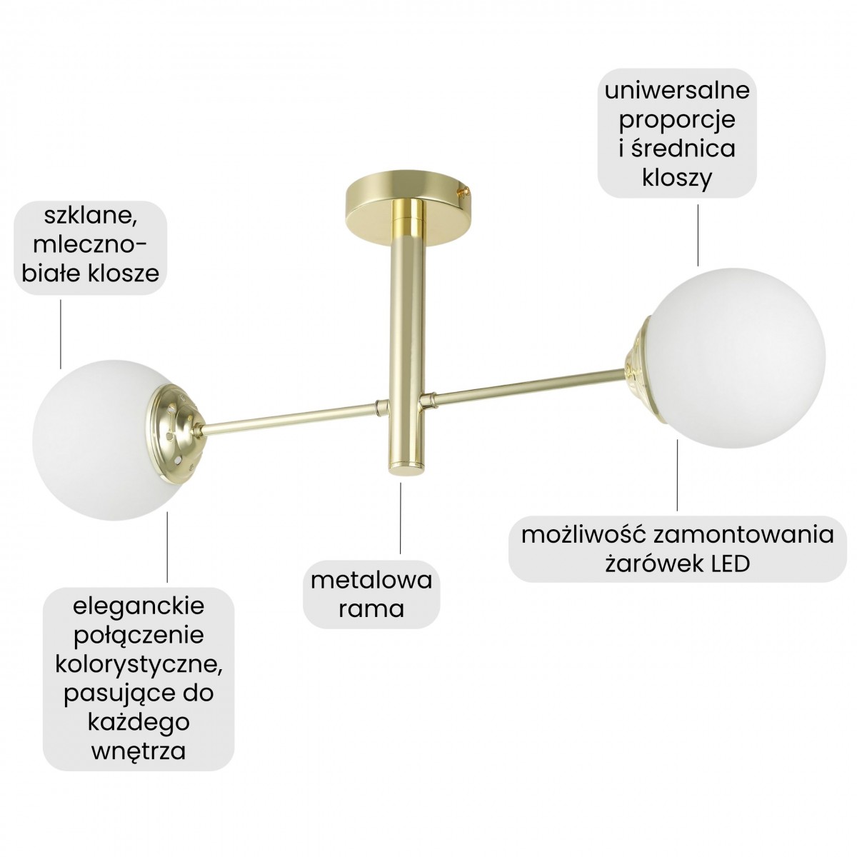 Lampa sufitowa FINO 2 LED w wykończeniu klasycznego złota to minimalistyczny model z dwoma kulistymi kloszami z mlecznego szkła. Konstrukcja jest zwarta i elegancka, co czyni ją dobrym wyborem wszędzie, gdzie przestrzeń nie pozwala na większe oprawy i bogate żyrandole. Złota rama dodaje akcentu luksusu w prostym wydaniu, który pasuje do wnętrz w różnych stylach.