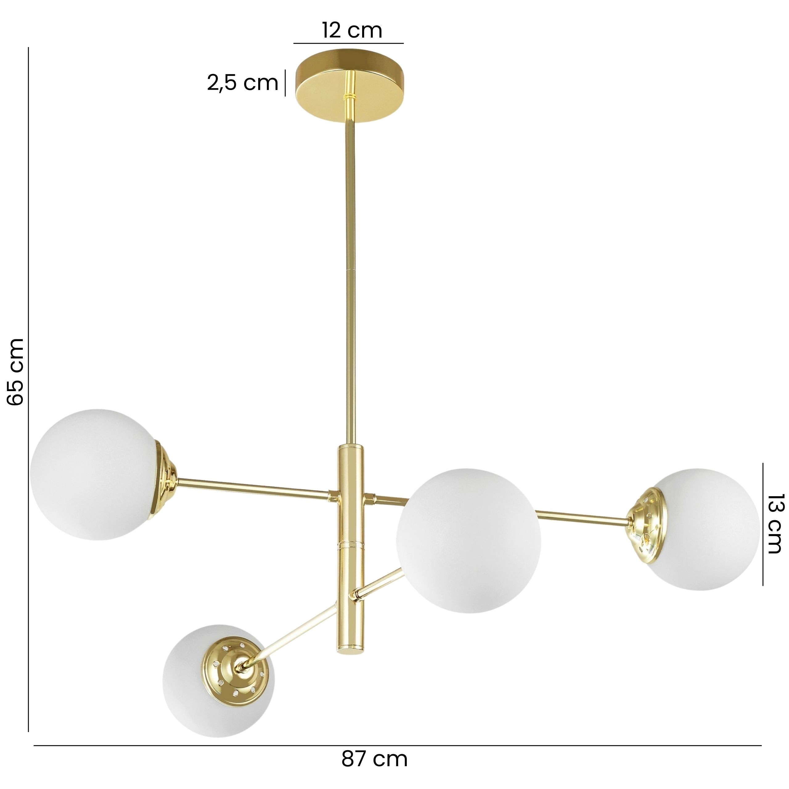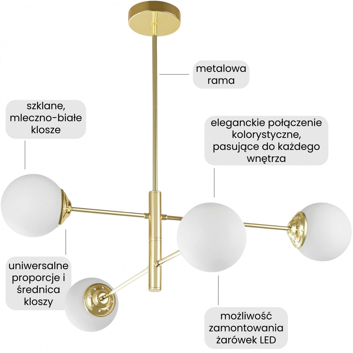 Nowoczesna lampa wisząca FINO W4 w klasycznym złocie łączy elegancki wygląd z funkcjonalnością. Cztery mleczne kule rozmieszczono równomiernie na złotej ramie, tworząc spójną i dekoracyjną formę, idealną do wnętrz w różnych stylach. Delikatny połysk metalu dodaje wnętrzu charakteru i wprowadza odrobinę luksusu w wyważony sposób.
