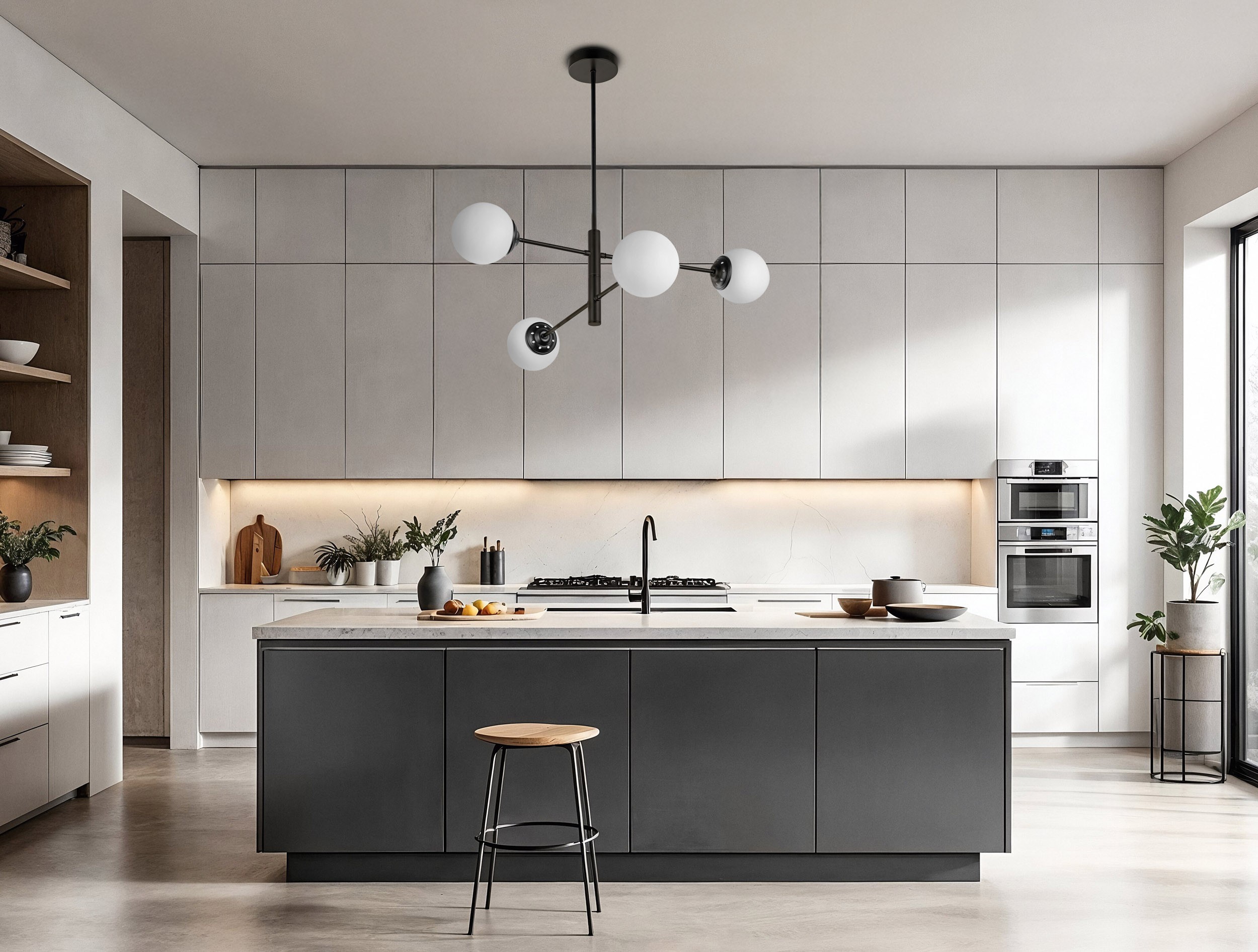 Czarna lampa wisząca FINO W4 to elegancka oprawa z czterema kulistymi kloszami z mlecznego szkła, rozmieszczonymi symetrycznie na prostej, metalowej konstrukcji. Nowoczesny układ i kontrast czerni z bielą nadają jej nowoczesny, elegancki charakter, który pasuje zarówno do wnętrz minimalistycznych, jak i tych bardziej awangardowych.