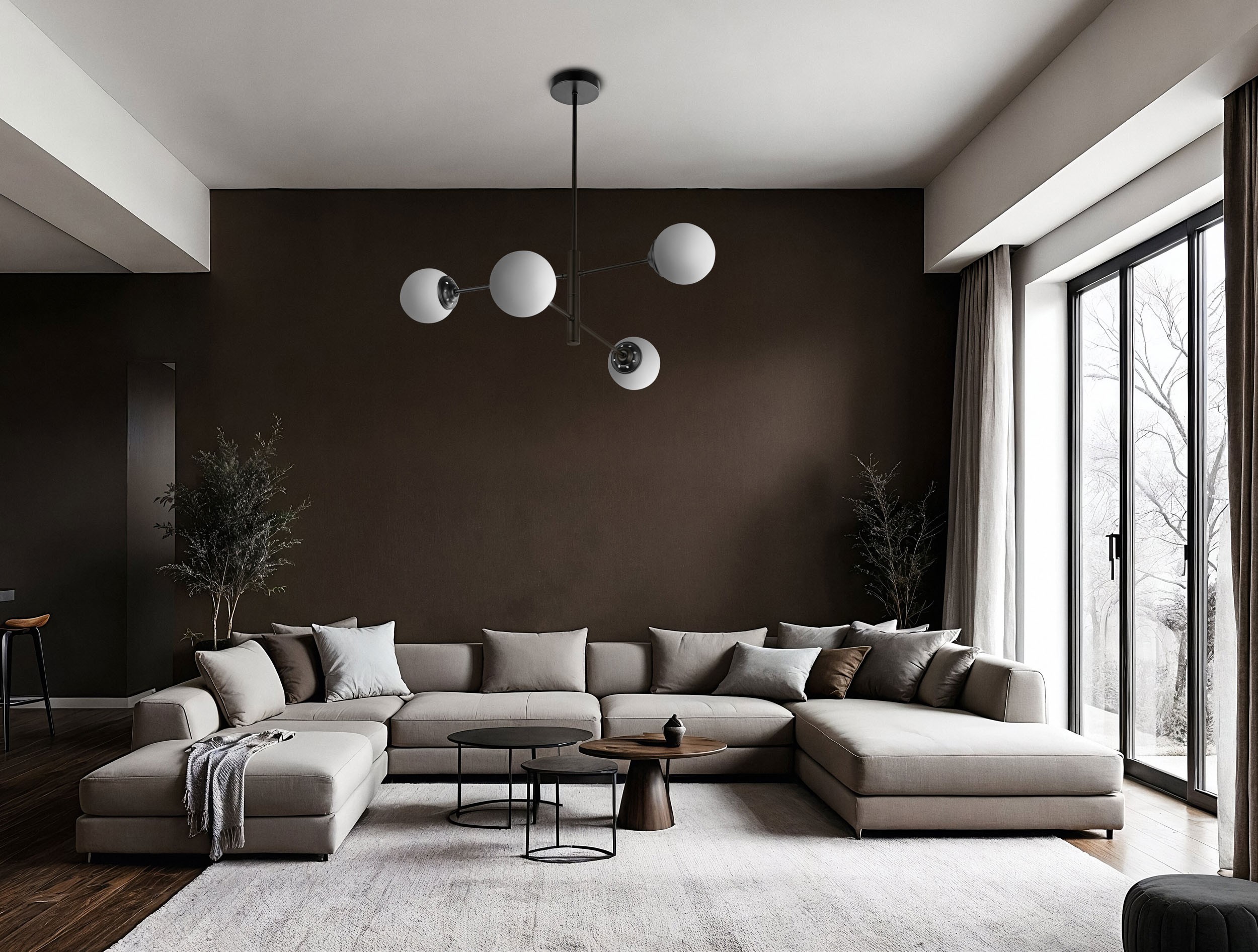 Głęboka czerń oprawy w matowym wykończeniu kontrastuje z jasnymi wnętrzami i współgra z ciemniejszymi aranżacjami, tworząc spójny efekt. Ten model wyjątkowo podkreśla charakter pomieszczenia, nie odciągając uwagi od jego detali. Lampa wisząca idealnie pasuje do wnętrz w różnym stylu, łącząc się z metalem, szkłem, betonem architektonicznym, marmurem, drewnem i tekstyliami.