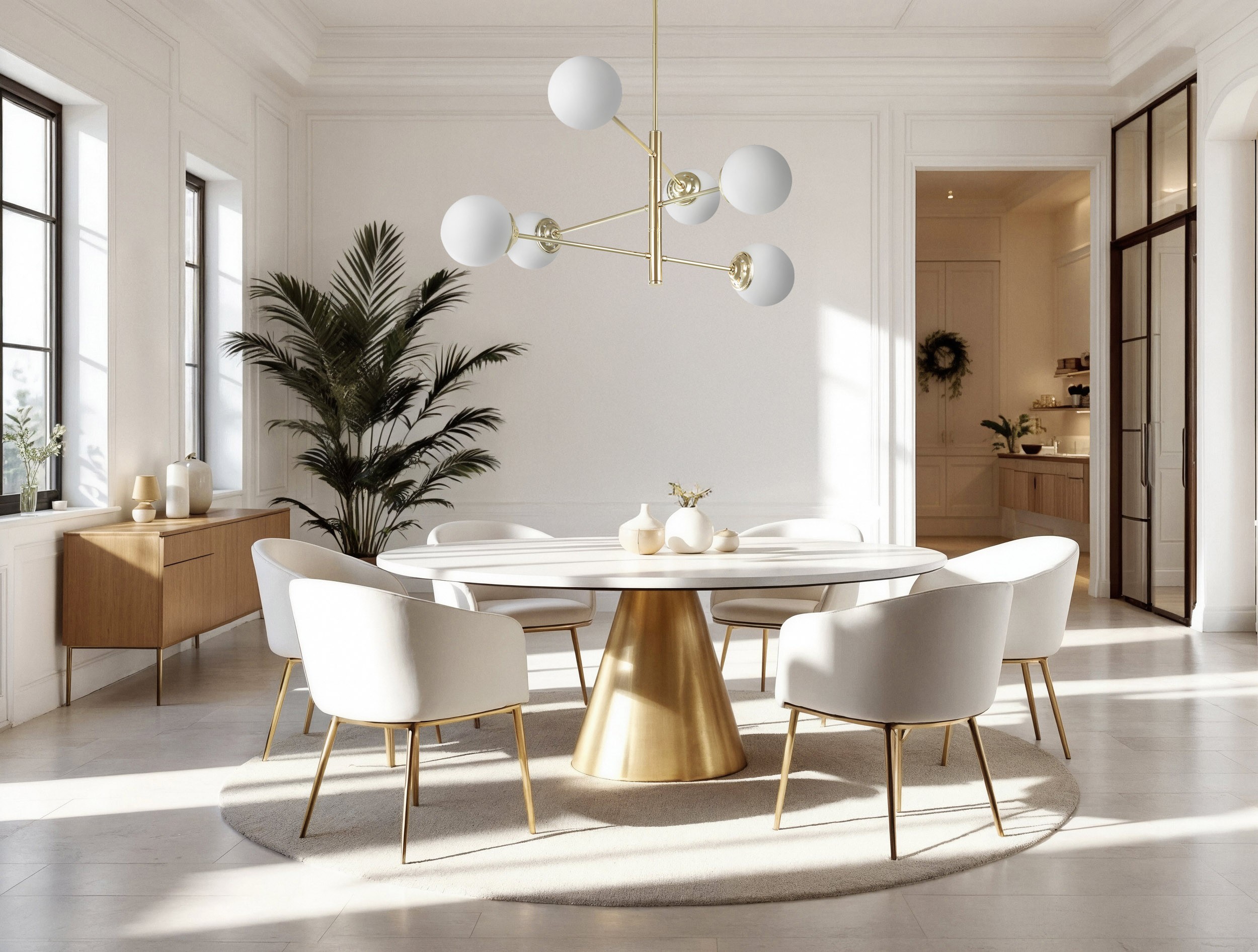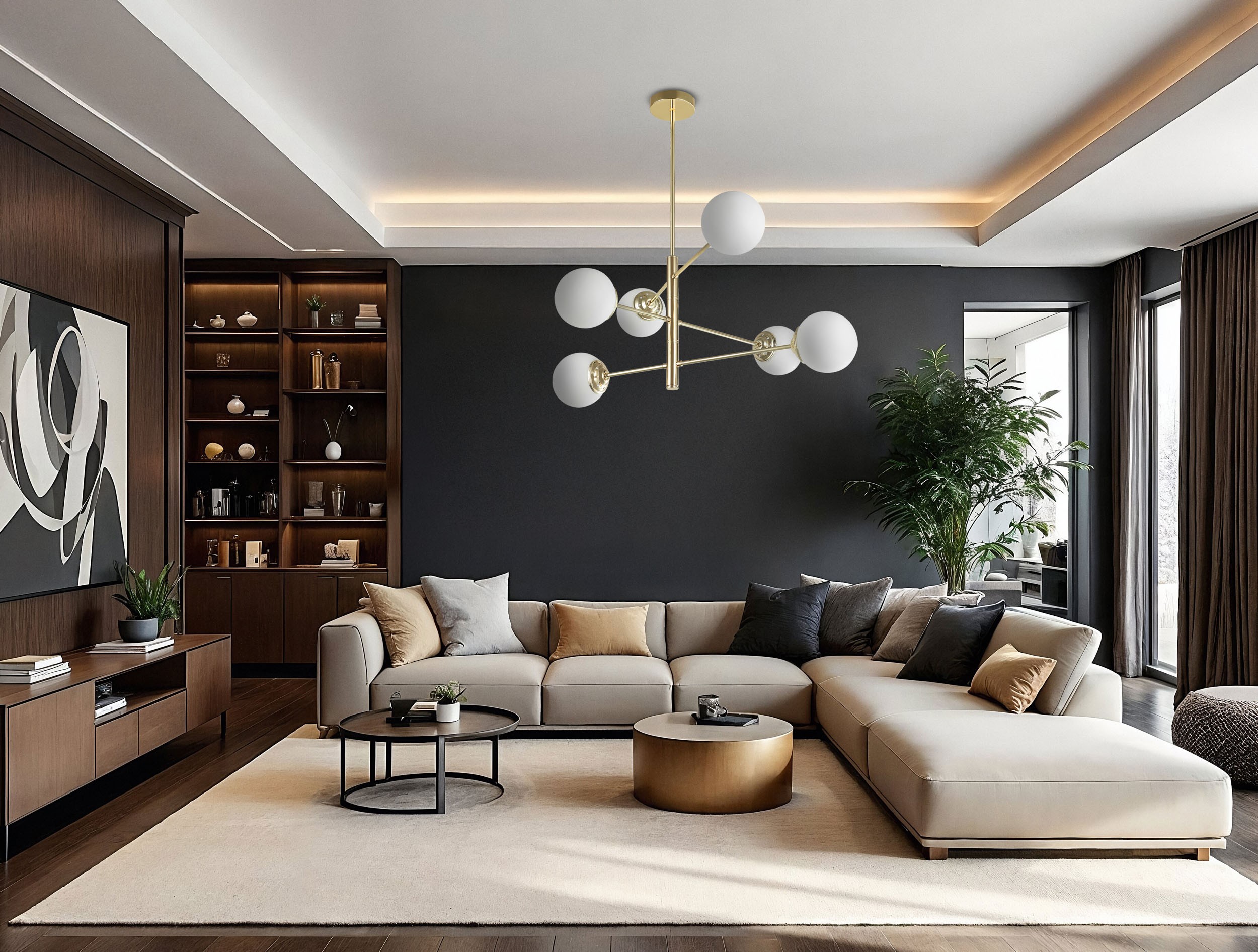 W lampie FINO 6 sześć białych kul z mlecznego szkła rozmieszczono na złotym stelażu, tworząc harmonijną kompozycję o subtelnym charakterze. Ten nowoczesny żyrandol to rozwiązanie, które subtelnie podkreśla elegancję wnętrza, jednocześnie zapewniając funkcjonalność — światło rozprasza się łagodnie i równomiernie dzięki wielu punktom świetlnym.