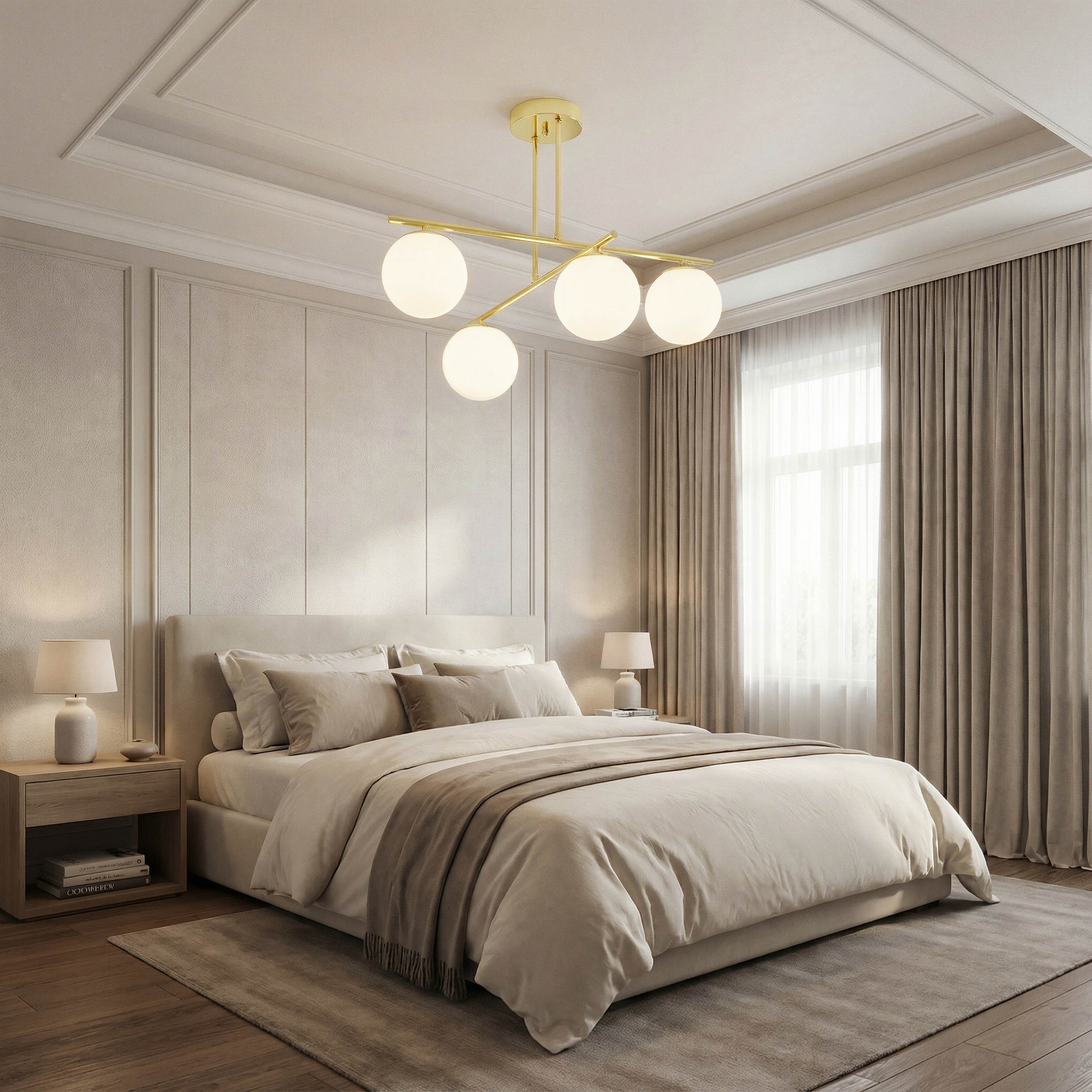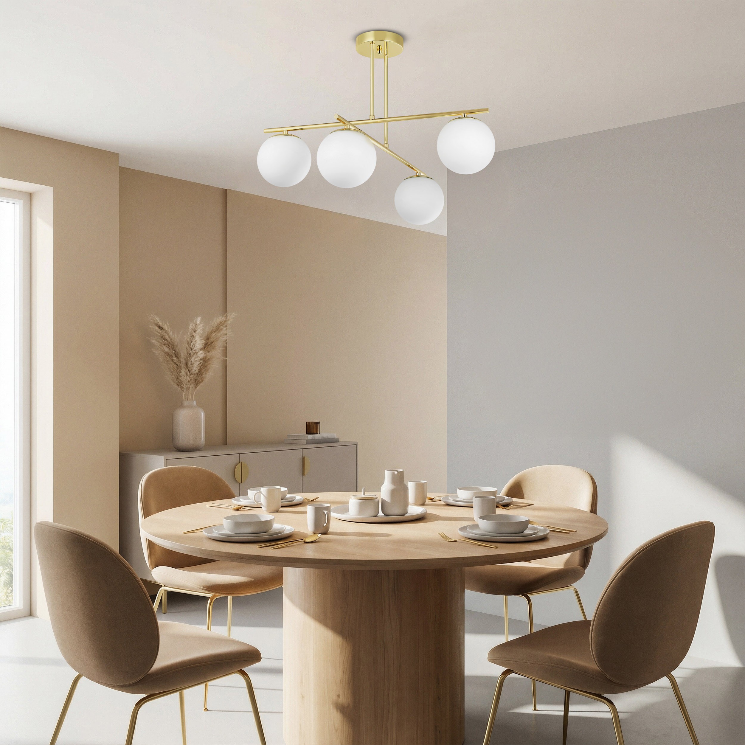 Lampa sufitowa LEDO pasuje zarówno do kuchni, gdzie podkreśla stół, jak i do salonu, gdzie staje się elementem dekoracyjnym i praktycznym. Jako lampa do przedpokoju pełni funkcję reprezentacyjną, witając gości ciepłym światłem, w sypialni zapewnia nastrojowe oświetlenie, a w gabinecie dodaje profesjonalnego, eleganckiego charakteru. Złoto w tym wydaniu nie jest krzykliwe – to detal, który łączy się z nowoczesnymi materiałami, jak szkło i beton, tworząc luksusowy efekt, ale też pięknie współgra z drewnem i pastelami.