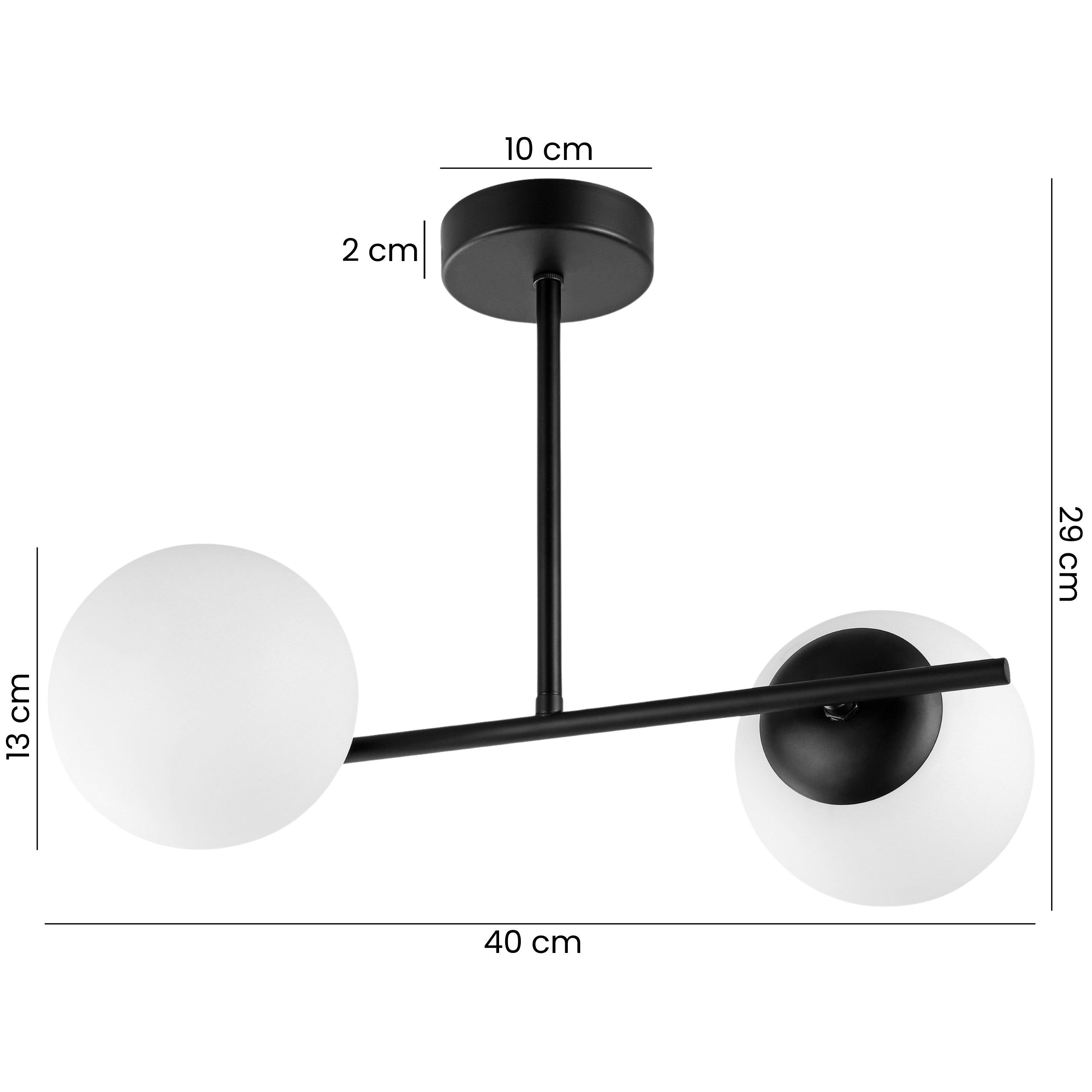 Czarna lampa wisząca LEDO to nowoczesna oprawa świetlna z dwoma kulistymi kloszami z mlecznego szkła osadzonymi na prostej, czarnej konstrukcji. Minimalistyczna forma w połączeniu z kontrastem czerni i bieli wprowadza spójny, stonowany charakter, który pasuje zarówno do pomieszczeń dziennych, jak i bardziej kameralnych zakątków.