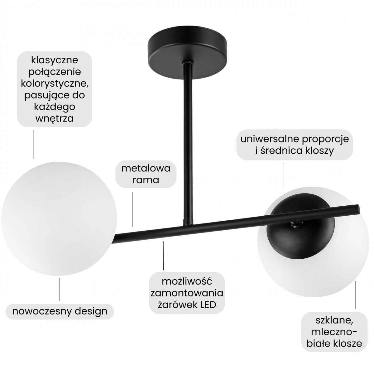 Nowoczesna lampa wisząca LEDO to dwie mlecznobiałe kule, które zostały umieszczone symetrycznie na czarnej konstrukcji. Tworzą subtelny rytm, który sprzyja wyciszeniu i równowadze w domowych warunkach.