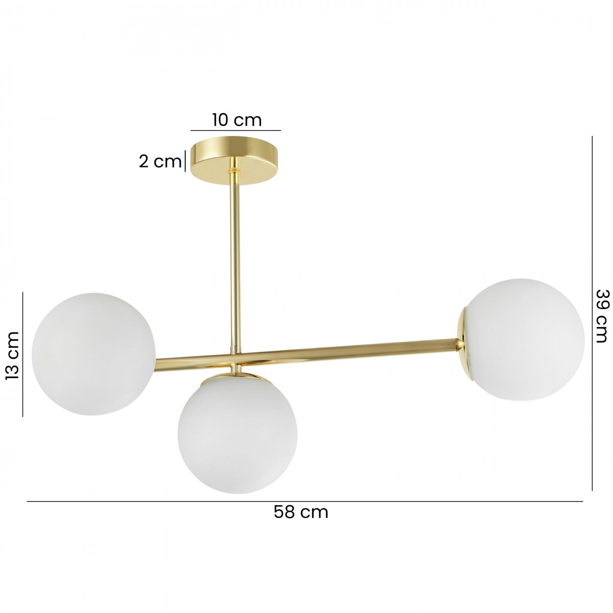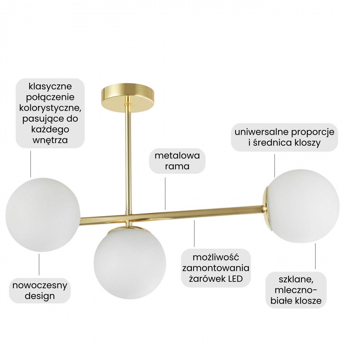 Trzy mleczne kule rozpraszają światło w sposób, który nie męczy wzroku – oświetlają wnętrze równomiernie, tworząc atmosferę spokoju i przyjemności. Złota konstrukcja stanowi subtelny, ale wyrazisty akcent, który dodaje wnętrzu elegancji, zachowując przy tym jego codzienną wygodę. Plafon idealnie dopełnia wnętrza w różnym stylu, zwłaszcza wykończone w duchu nowoczesnym, glamour, skandynawskim czy minimalistycznym.