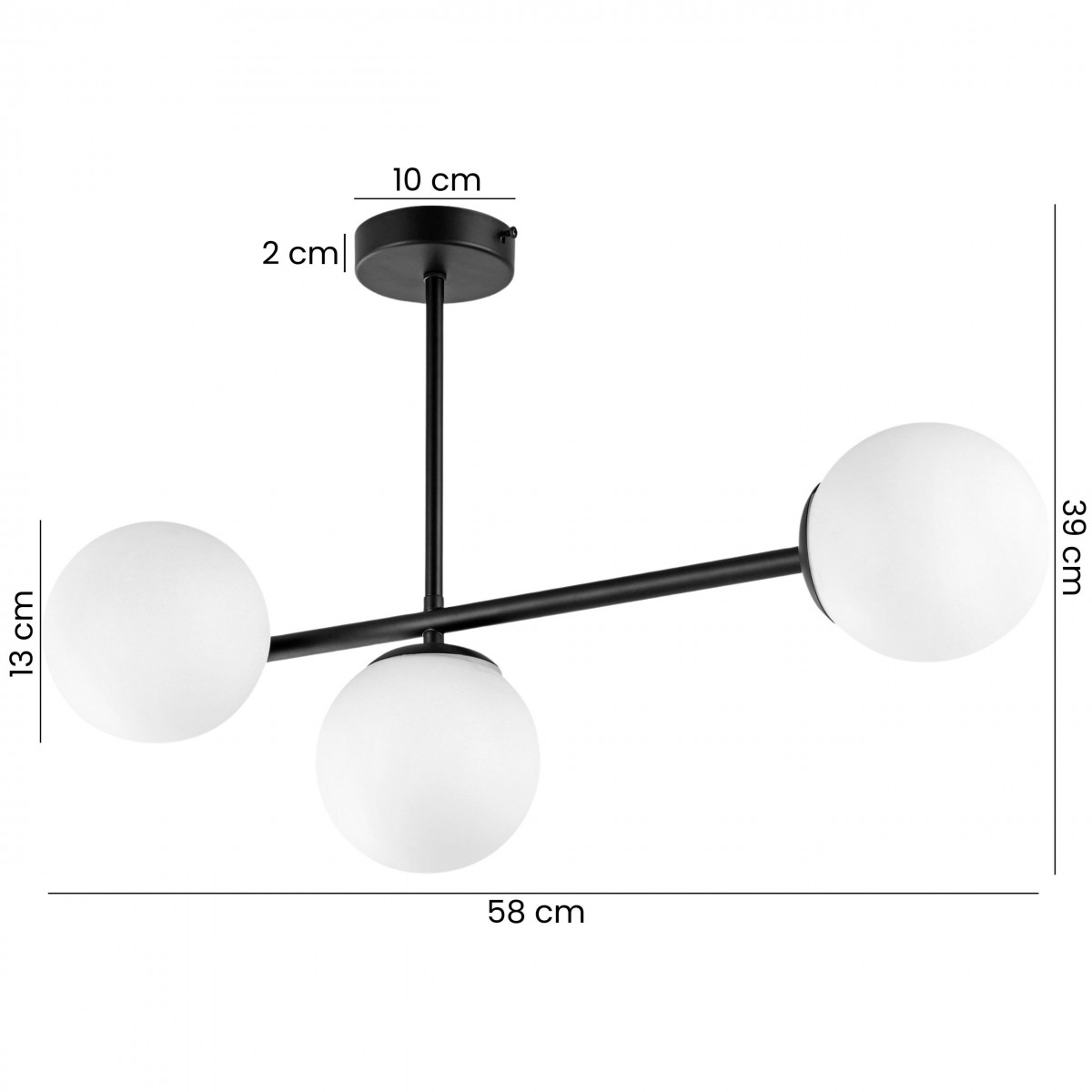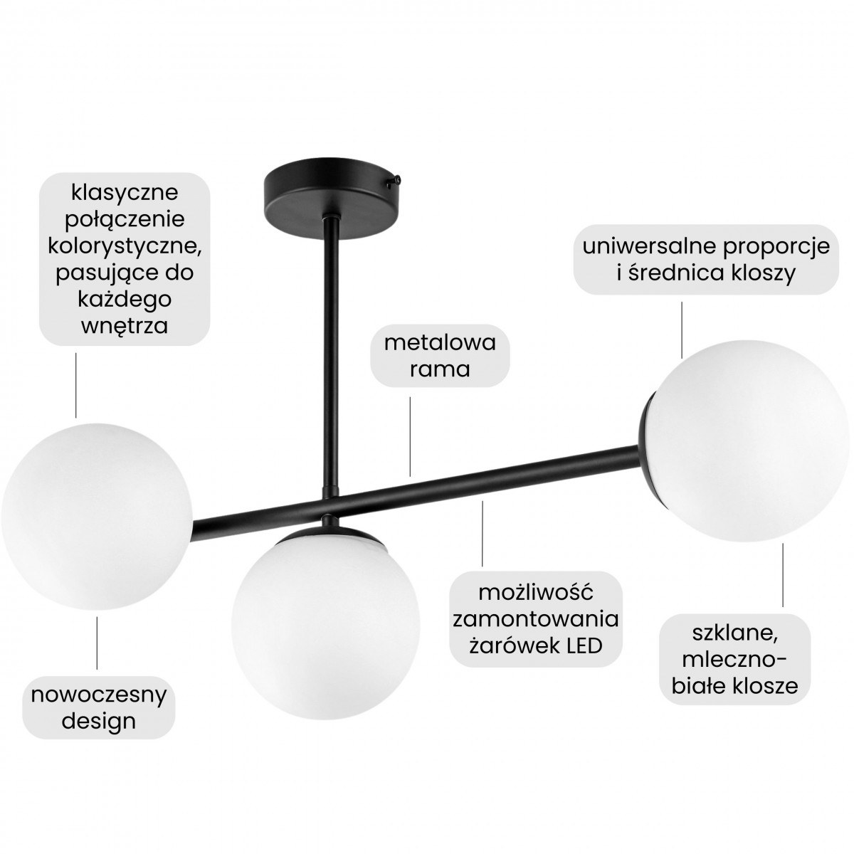 Czarna lampa wisząca LEDO 3 to elegancka oprawa składająca się z trzech kulistych kloszy z mlecznego szkła, zamocowanych na prostej, metalowej konstrukcji. Ten model łączy stylowy charakter z wyrazistością, a jego design idealnie wpisuje się w wiele nurtów aranżacyjnych.