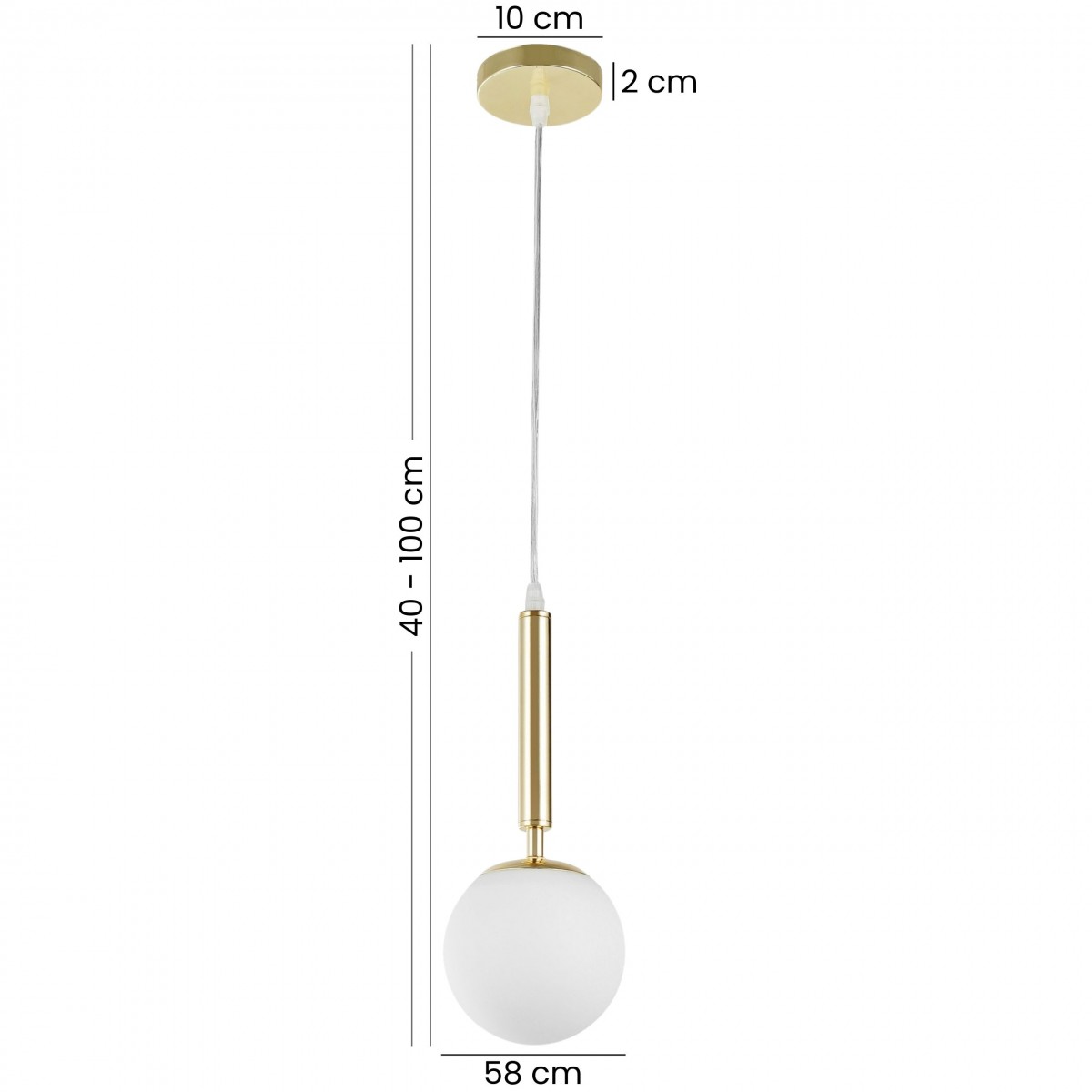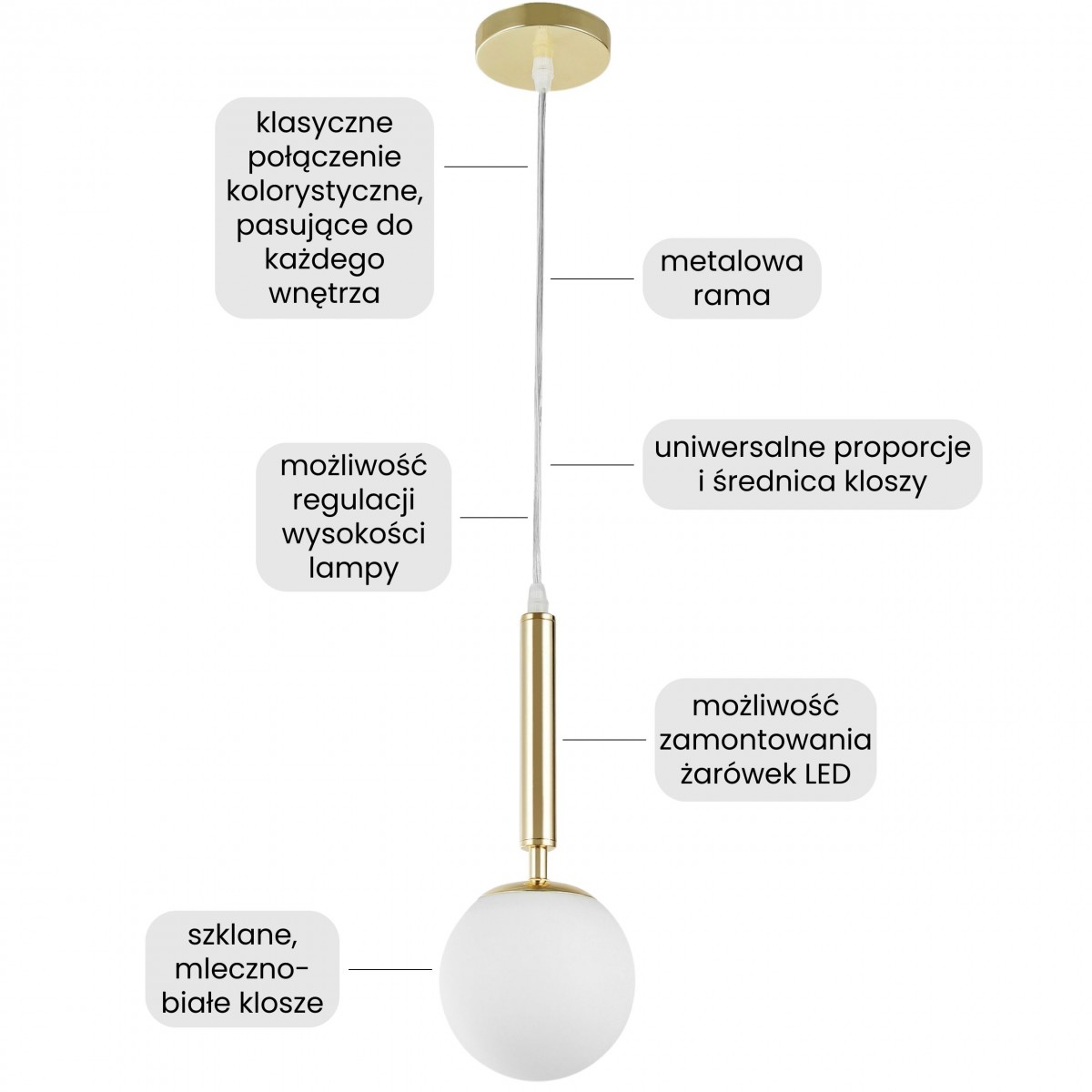 LEDO W1 to nowoczesna lampa wisząca z jedną kulą z mlecznego szkła zawieszoną na cienkiej konstrukcji w kolorze złota. Forma łączy subtelną geometrię z dekoracyjnym akcentem, który nadaje wnętrzu wyrafinowanego charakteru.