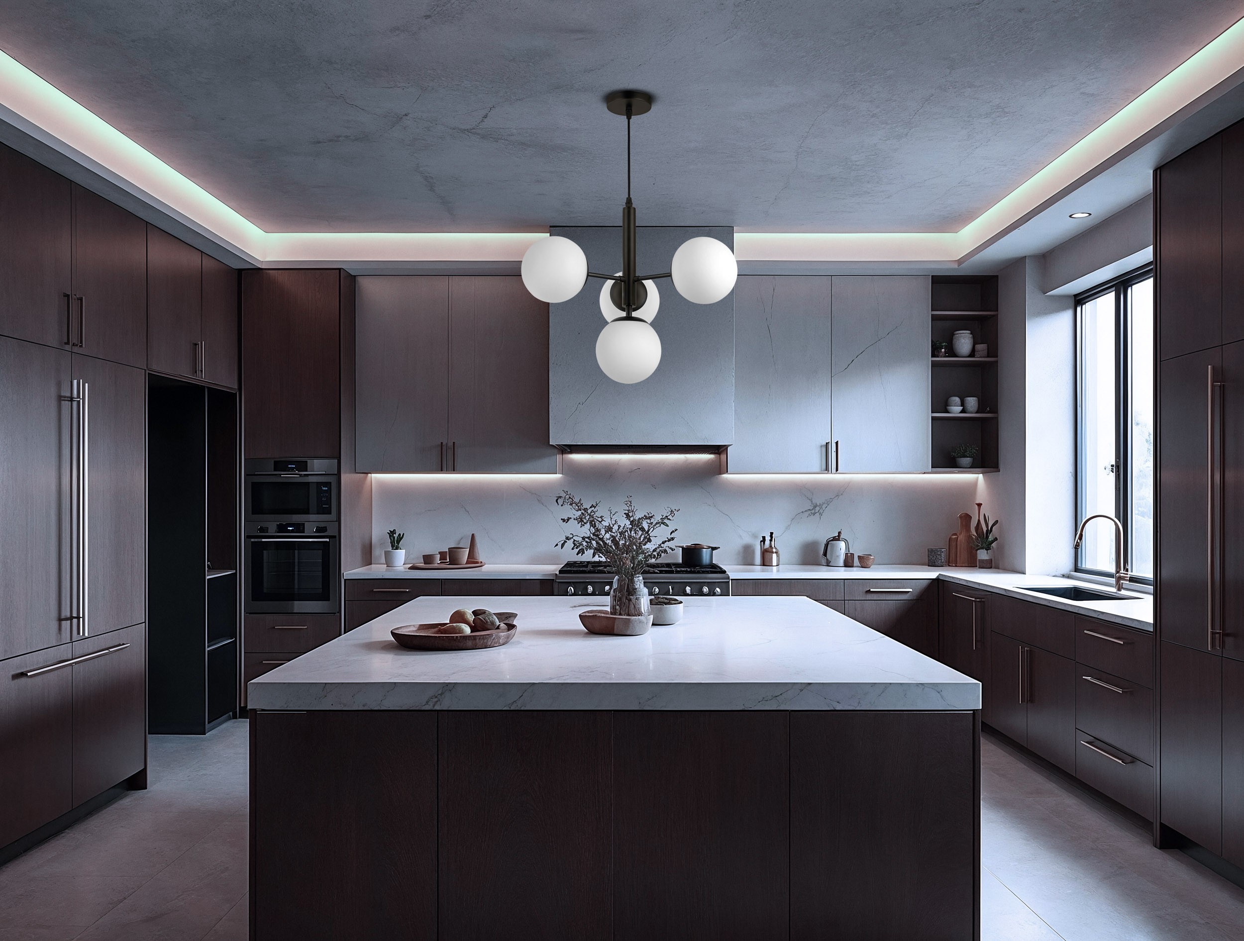 LEDO 4 to nowoczesna lampa wisząca w czarnym wykończeniu, z czterema kulistymi kloszami z mlecznego szkła rozmieszczonymi wokół konstrukcji tak, by równomiernie wypełnić przestrzeń światłem. Jej design łączy dekoracyjny akcent z praktycznym oświetleniem pomieszczenia.