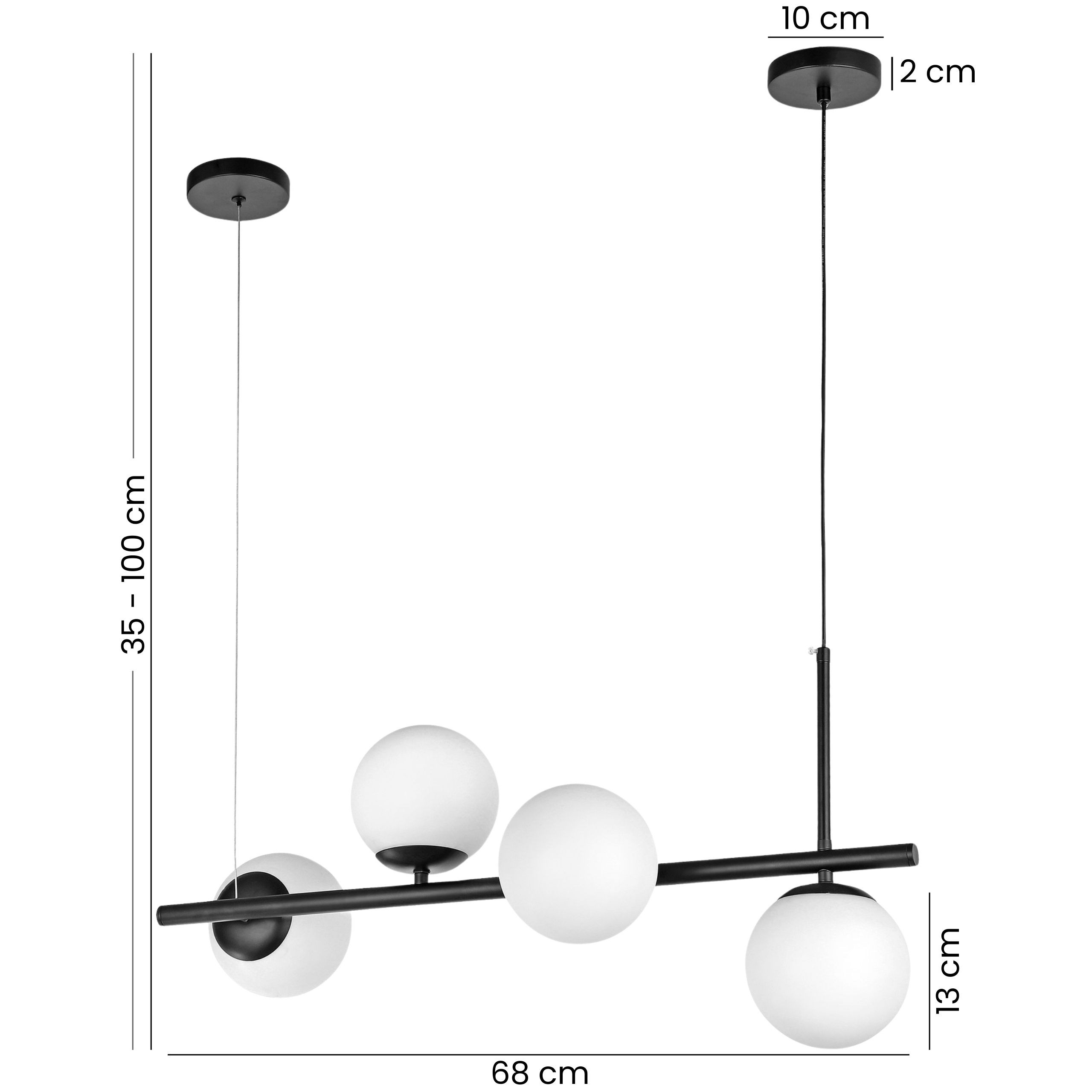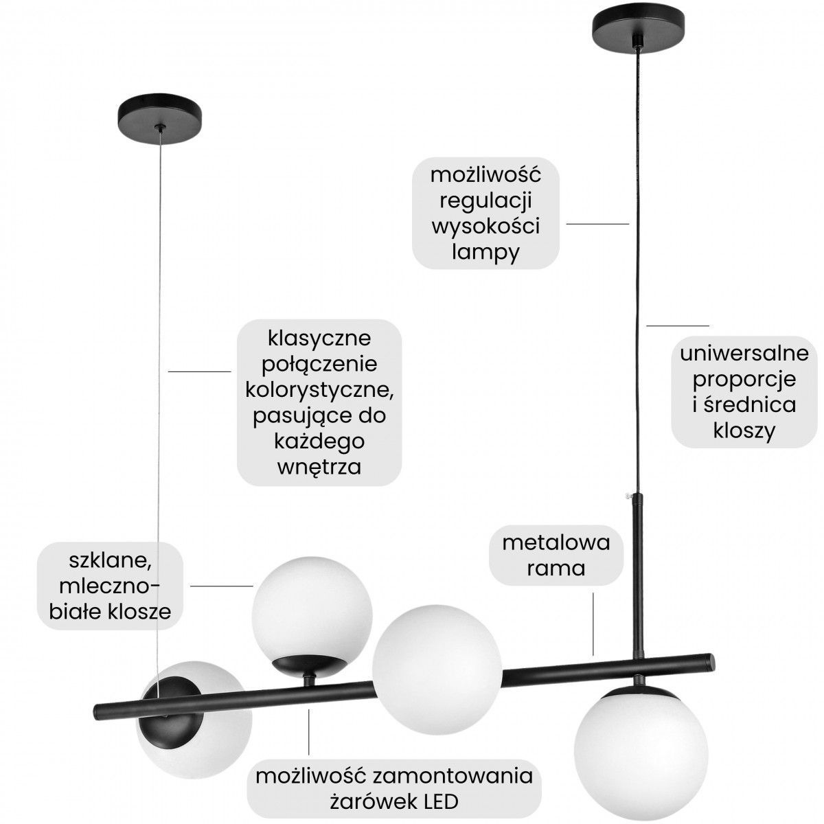 LEDO 4 to nowoczesna lampa wisząca, która przyciąga uwagę nieoczywistym układem kul. Cztery białe klosze z mlecznego szkła rozmieszczono asymetrycznie na czarnej, poziomej belce, tworząc oryginalną, a zarazem harmonijną kompozycję. Dwa punkty zawieszenia równoważą formę i nadają całości lekkości.