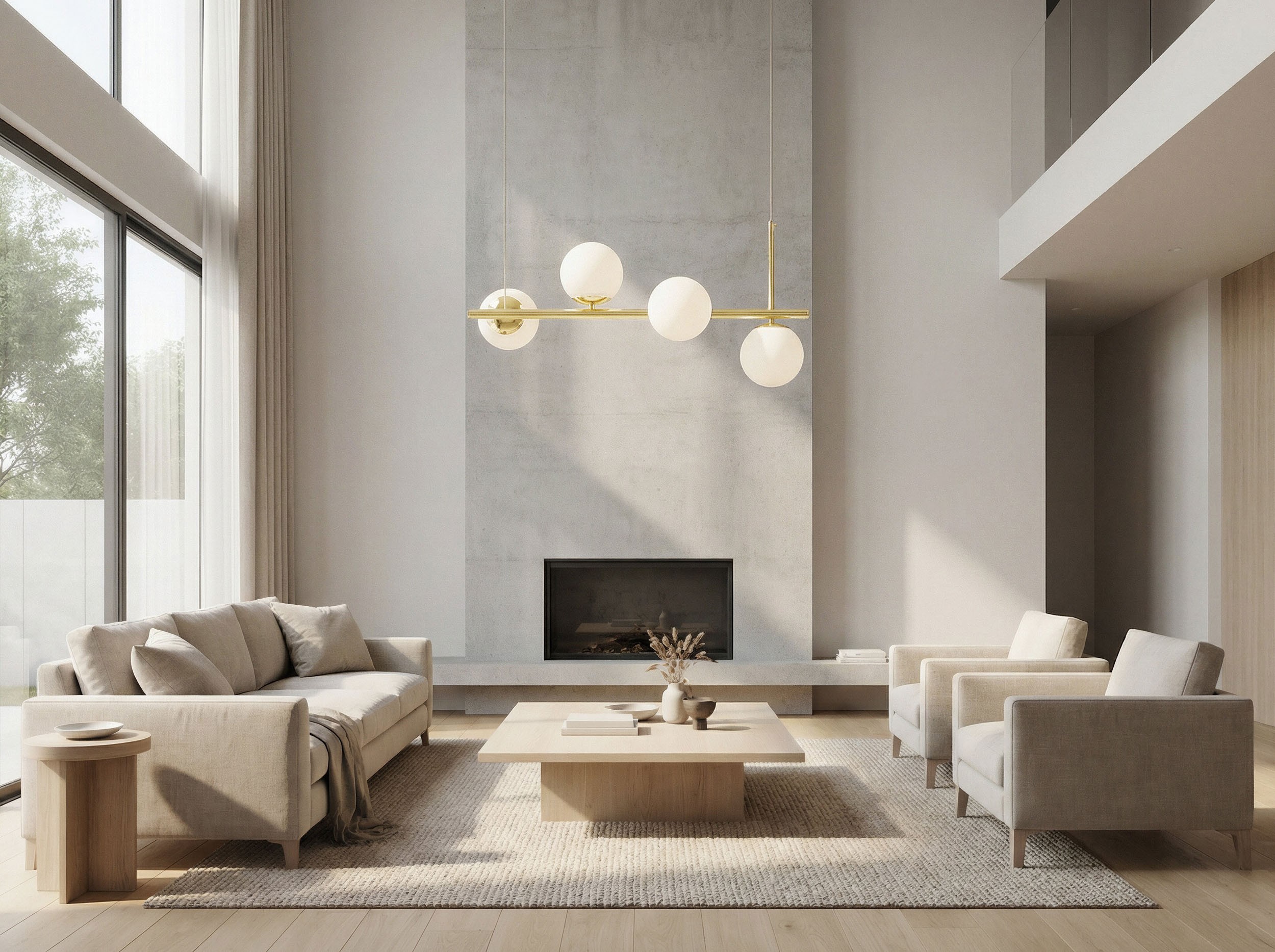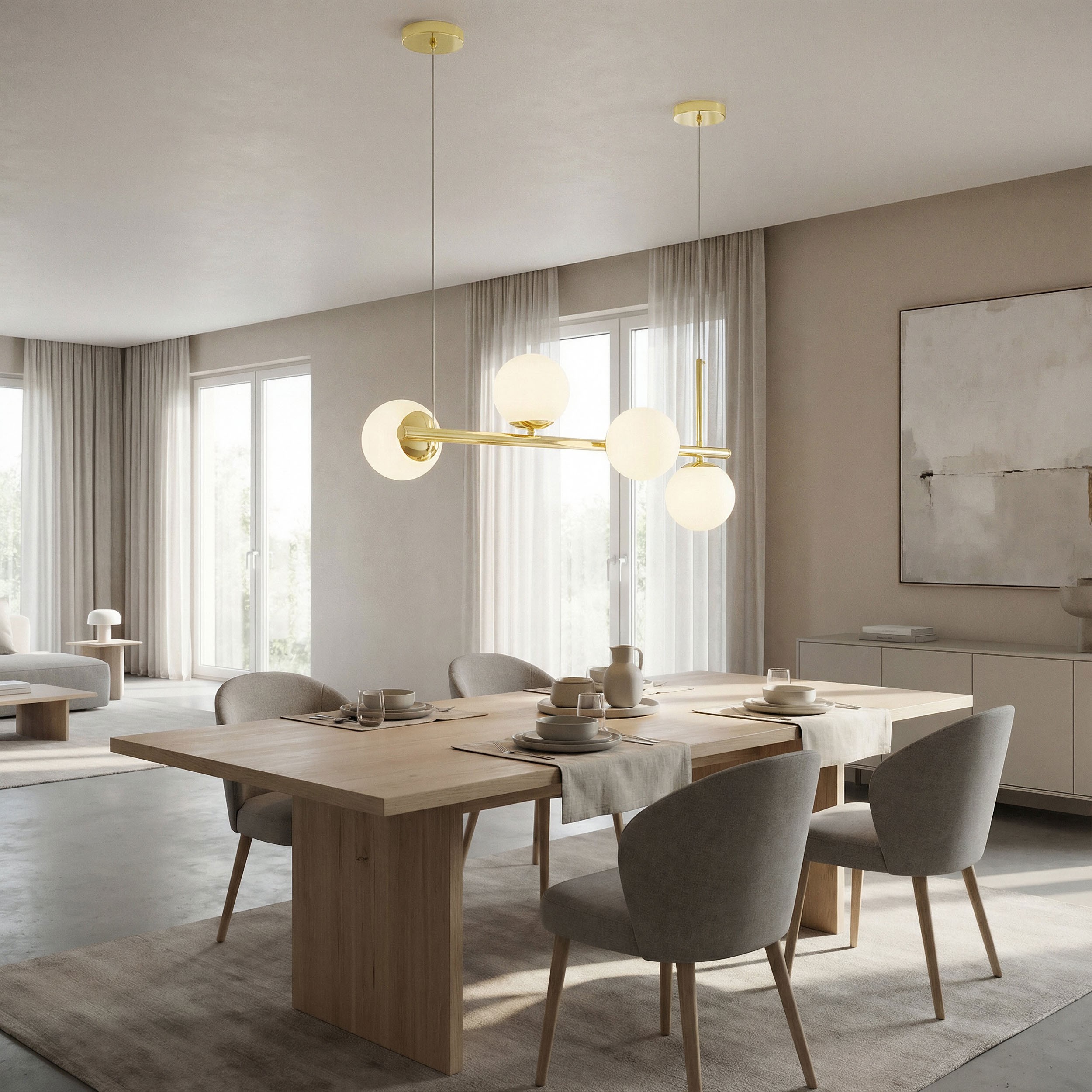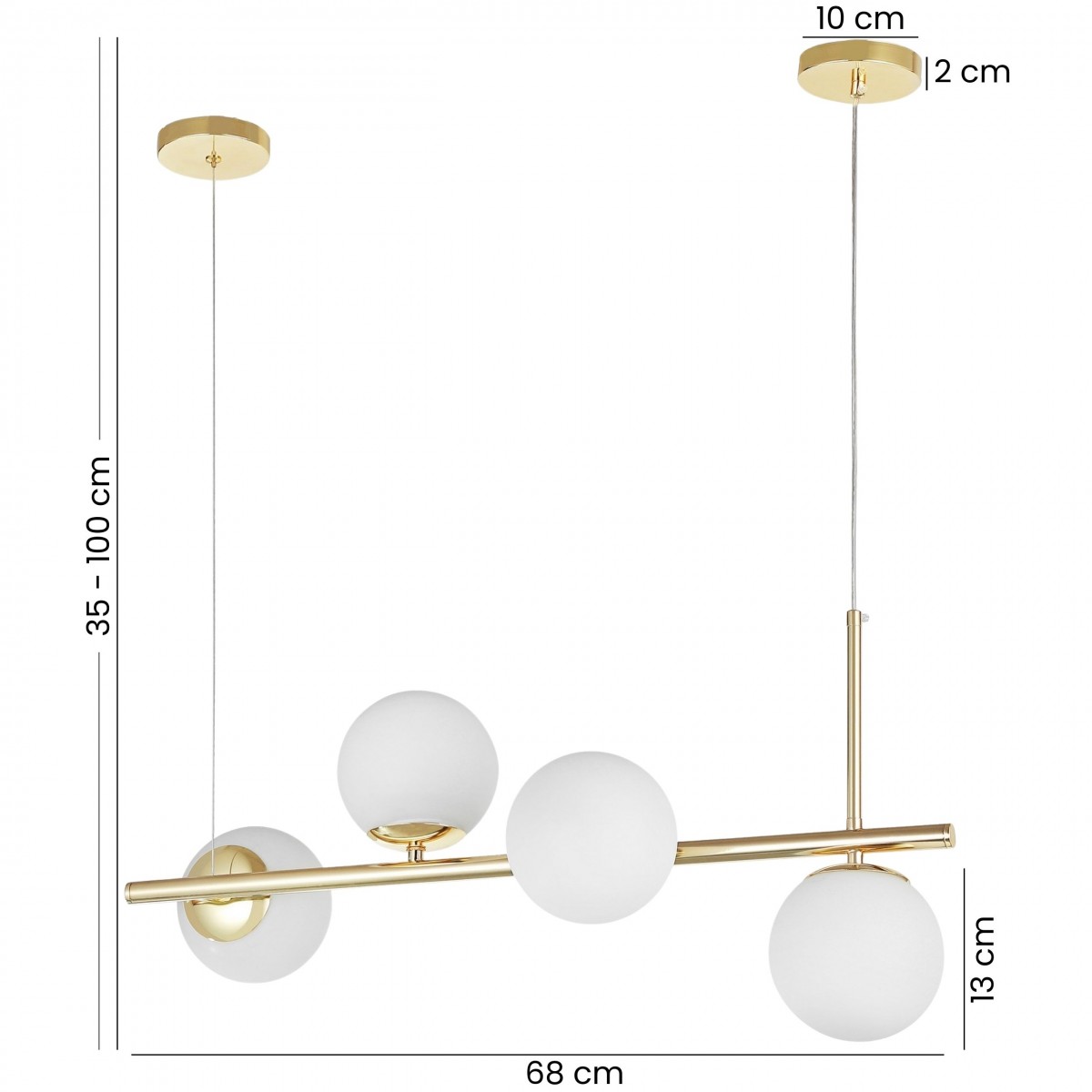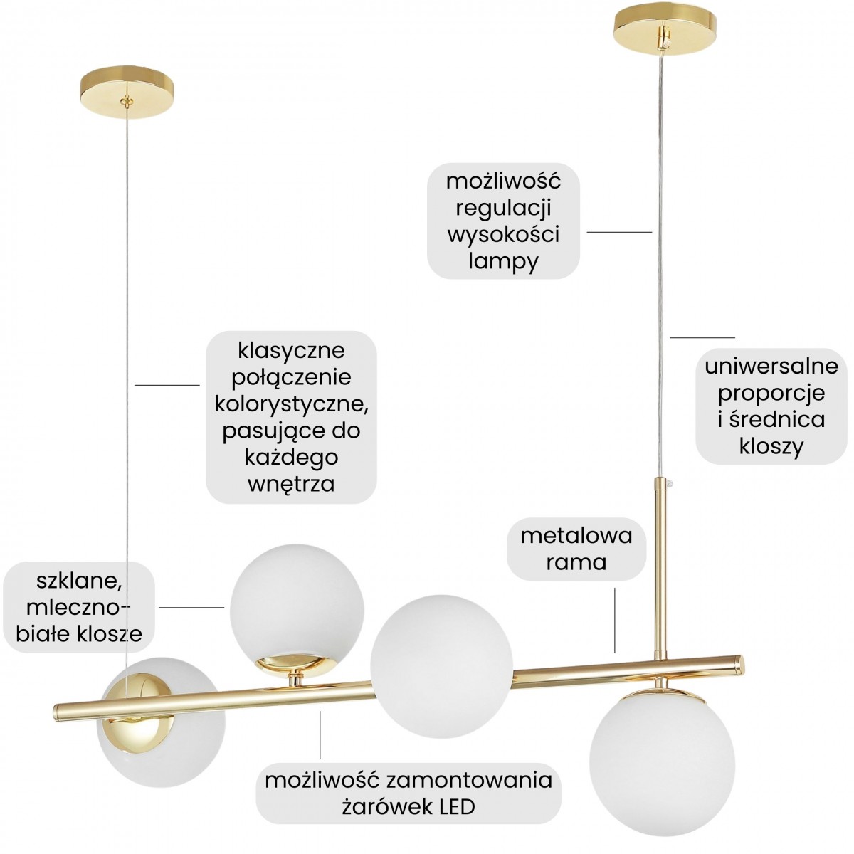 LEDO 4 w klasycznym złocie to nowoczesna lampa wisząca, w której cztery białe kule rozmieszczono na poziomej belce w minimalistycznej, nieregularnej kompozycji. Złote wykończenie konstrukcji nadaje jej subtelny blask i elegancję, wprowadzając do wnętrza przyjemne ciepło, przytulność i luksusowy charakter.