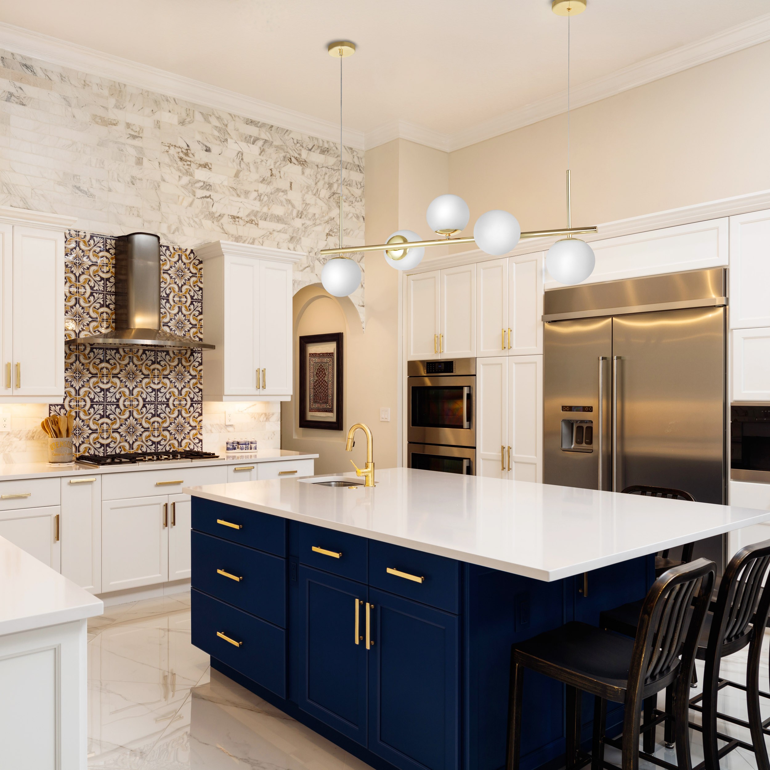 Lampa wisząca kule w wykończeniu klasycznego złota to elegancka oprawa świetlna, która sprawia, że przestrzeń staje się bardziej przyjazna. Doskonale sprawdza się nad stołem w kuchni, gdzie oświetla wspólne posiłki i rozmowy, a także w formie lampy do salonu, w którym dodaje przytulności. Ciepłe światło z pięciu kul rozchodzi się równomiernie, tworząc atmosferę, w której po prostu dobrze się przebywa.
