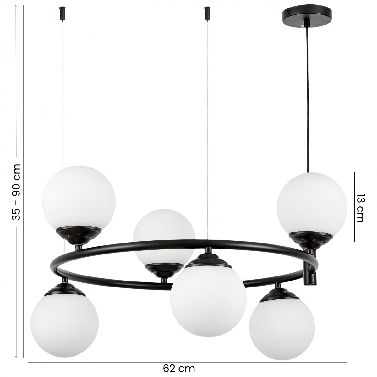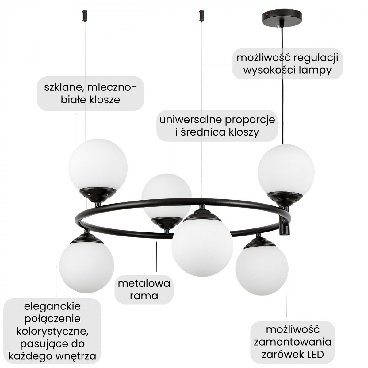 Czarna rama w połączeniu z mlecznymi kulami daje efekt elegancji, który nie przytłacza wnętrza. Ta uniwersalna kolorystyka sprawia, że nowoczesna lampa wisząca idealnie współgra zarówno z jasnymi ścianami i naturalnym drewnem, jak i z ciemniejszymi odcieniami czy surowymi dodatkami. To wybór dla osób, które cenią równowagę między dekoracyjnością a praktycznym zastosowaniem na co dzień.