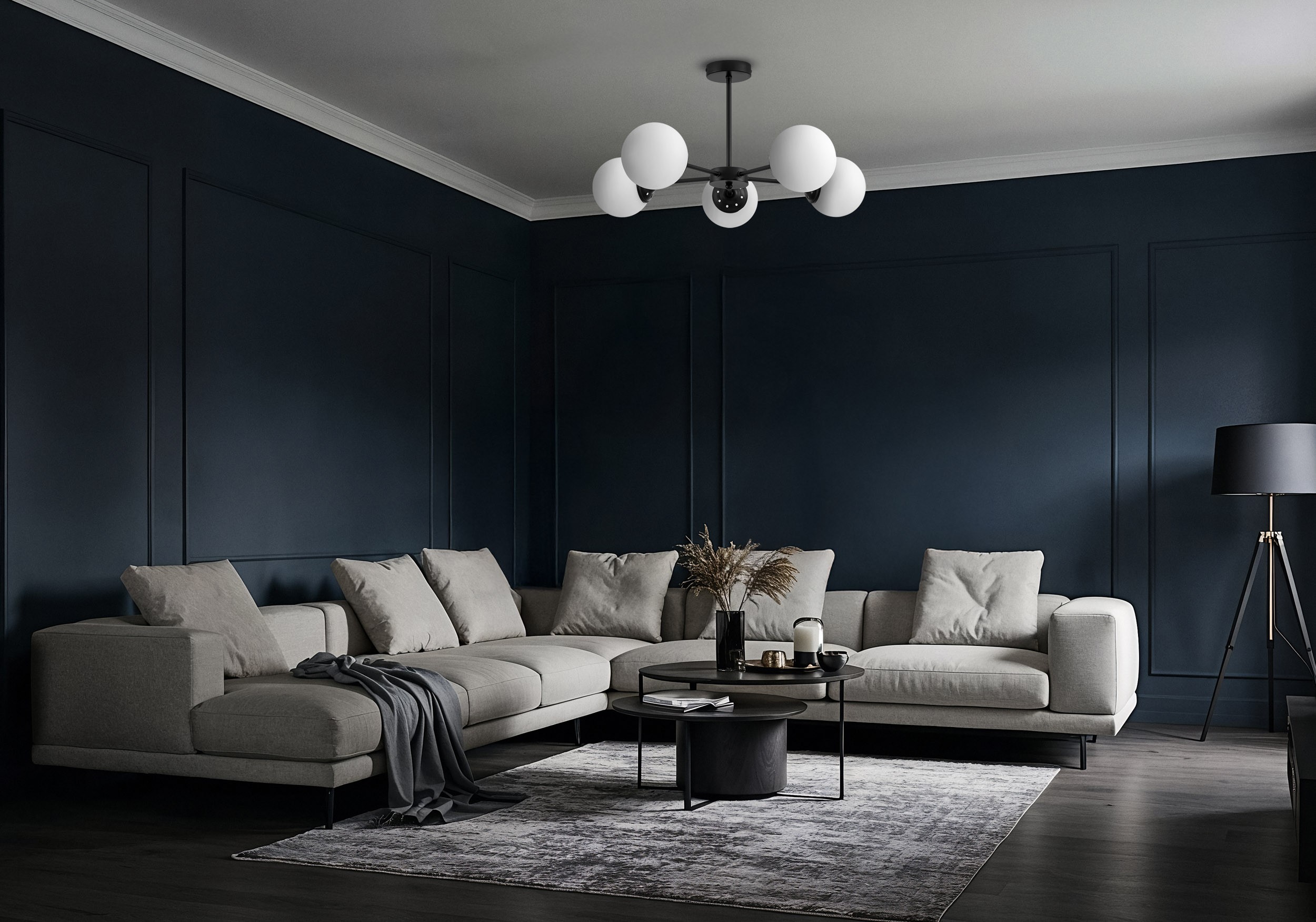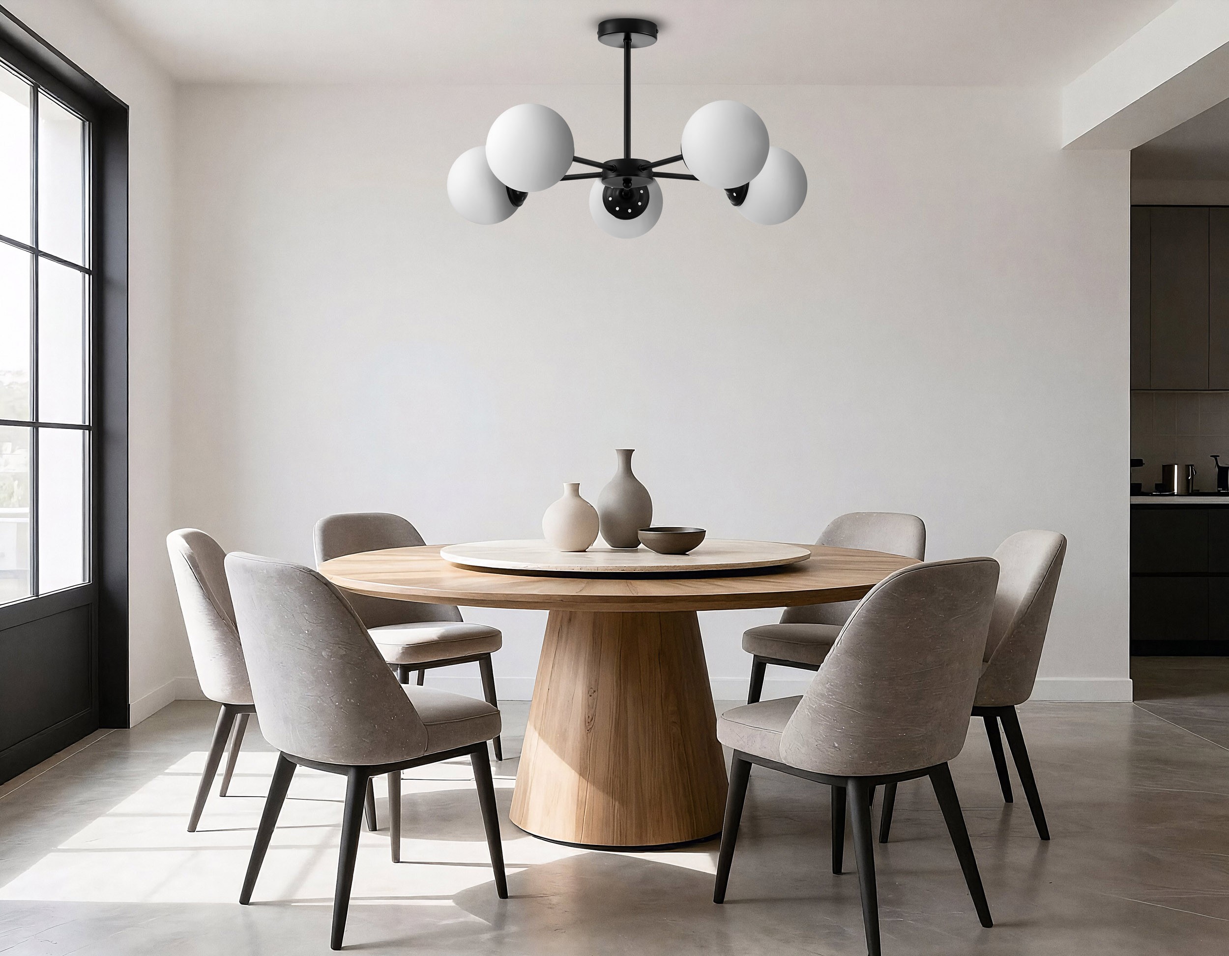 Czarna rama z mlecznymi kulami to połączenie kontrastu i łagodności — harmonizuje z betonem, szkłem, drewnem, marmurem i różnego rodzaju materiałami. W aranżacjach skandynawskich doda głębi, w loftowych podkreśli surowość, minimalistyczne dopełni, a w modern classic wniesie elegancki detal.