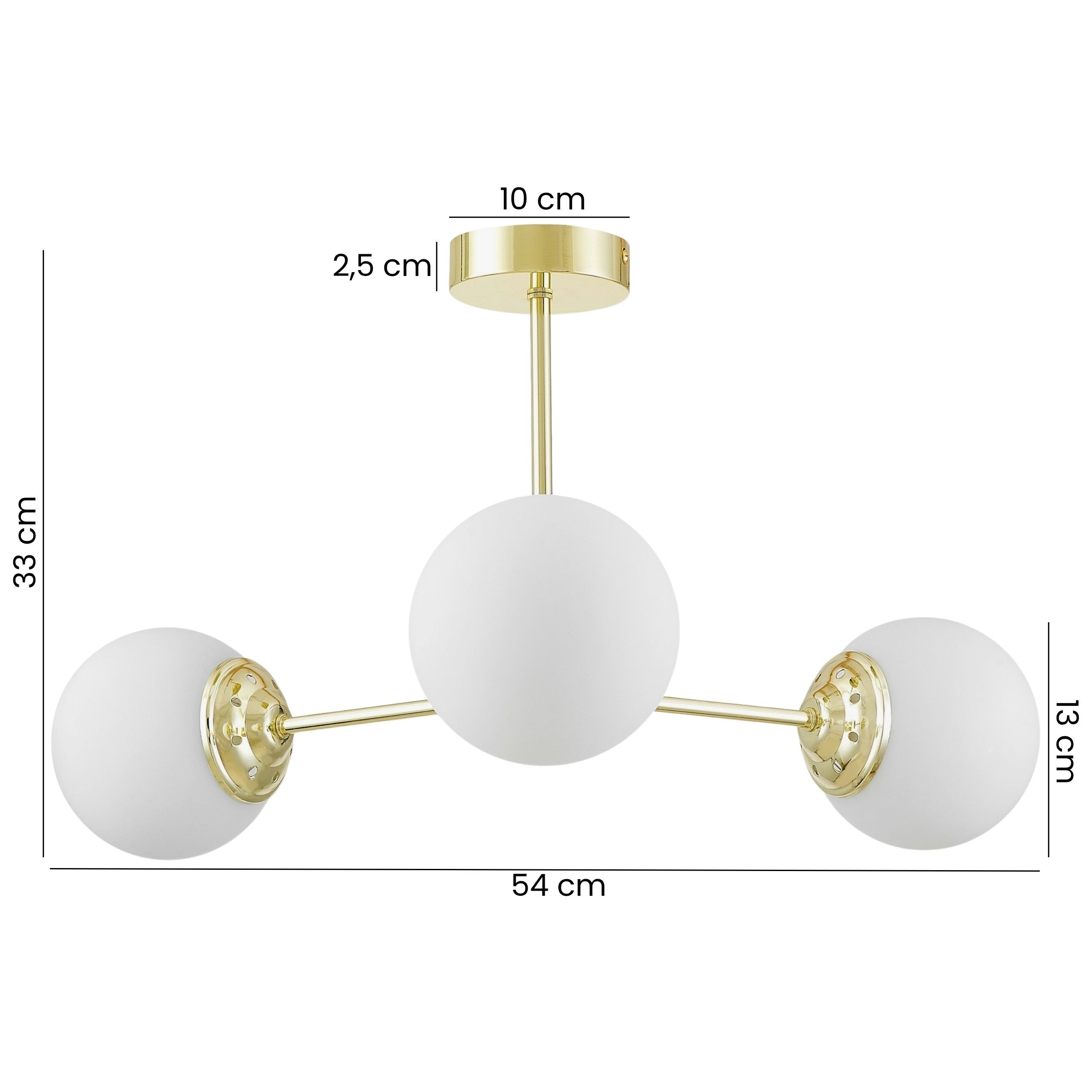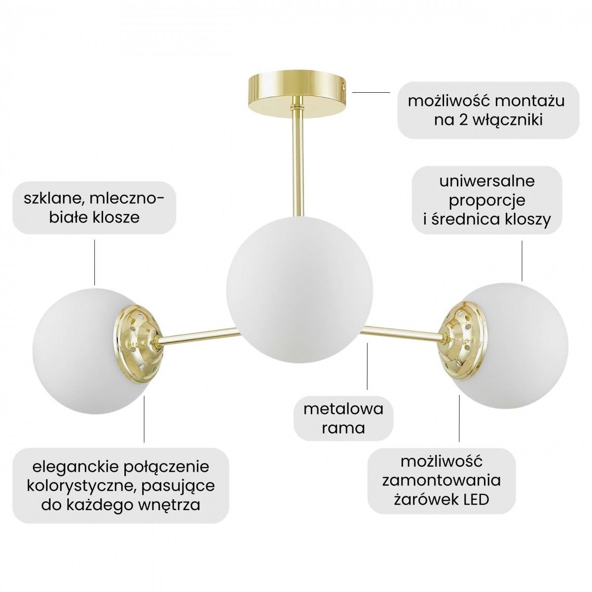 Klasyczne złoto w duecie z trzema mlecznymi kulami tworzy lampę, która od razu przyciąga wzrok. FINO W3 to połączenie prostej formy z ozdobnym złotem – detal, który nadaje wnętrzu elegancki i nowoczesny ton.