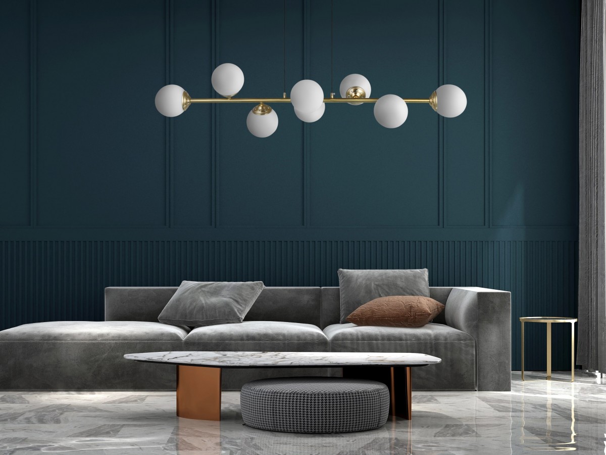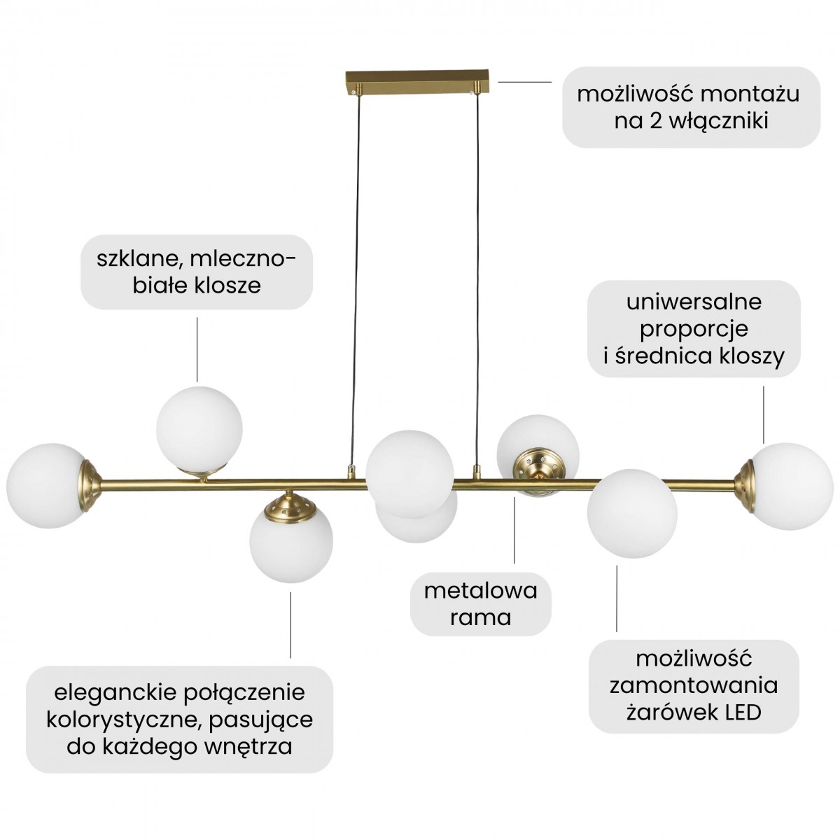 Szczotkowane złoto jest odcieniem ponadczasowym – neutralnym, a zarazem wyjątkowo stylowym. Ta nowoczesna lampa wisząca pasuje do wnętrz o różnym charakterze: od modern classic przez minimalizm, glamour, po styl loftowy, gdzie łagodzi surowość materiałów. FINO W8 w tej wersji kolorystycznej to model, który nie tylko spełnia rolę oświetlenia, ale także staje się ozdobą salonu, jadalni czy przestronnej kuchni.