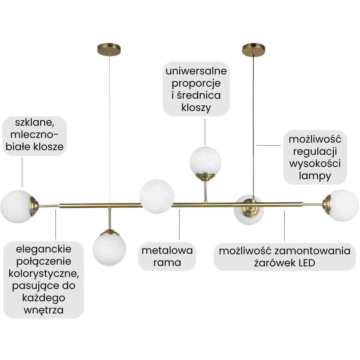 Model FINO W6 w wersji o strukturze szczotkowanego złota stanowi wyważony akcent w przestrzeni. Ta złota lampa wisząca posiada subtelne rozłożenie kloszy, które sprzyja równomiernemu oświetleniu strefy dziennej. Delikatna faktura metalu łagodzi kontrast między złotem a bielą kul.