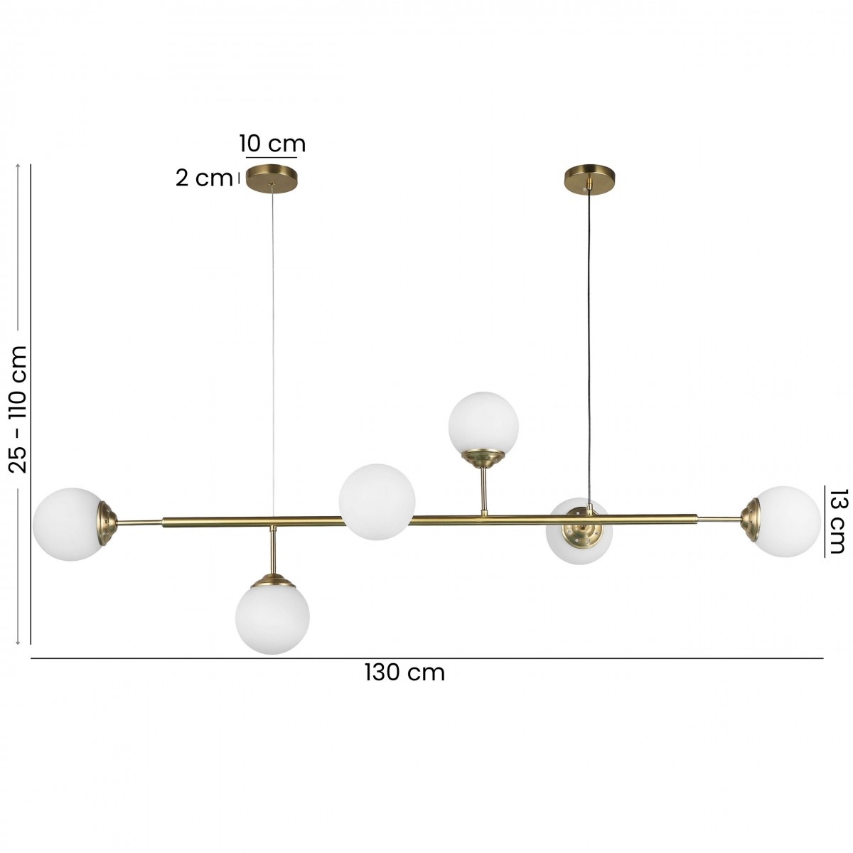 Lampa wisząca FINO W6 w wykończeniu szczotkowanego złota łączy subtelną fakturę metalu z prostą geometrią konstrukcji. Sześć białych kul ustawiono symetrycznie na ramionach, tworząc harmonijną formę, która przyciąga wzrok bez zbędnych ozdób.