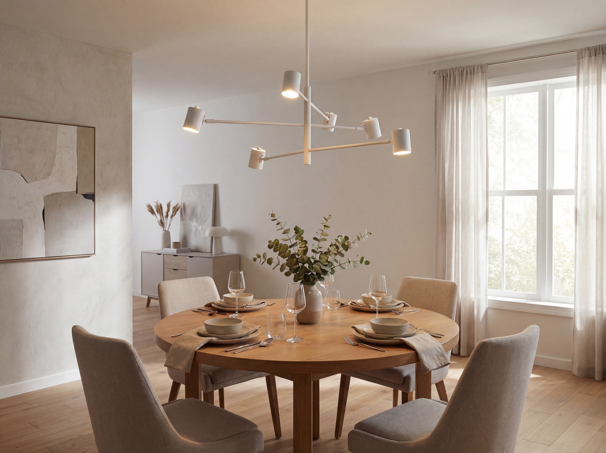 Jasna oprawa świetnie prezentuje się w aranżacjach z drewnem, szkłem, kamieniem i różnymi tkaninami. Ta nowoczesna lampa wisząca doskonale komponuje się z jasnymi i ciemniejszymi ścianami, tworząc wrażenie spójności i stylowego ładu. W salonie podkreśla centralną strefę spotkań, w kuchni zapewnia komfort pracy, a jako lampa do sypialni wprowadza zrównoważone światło sprzyjające odpoczynkowi.