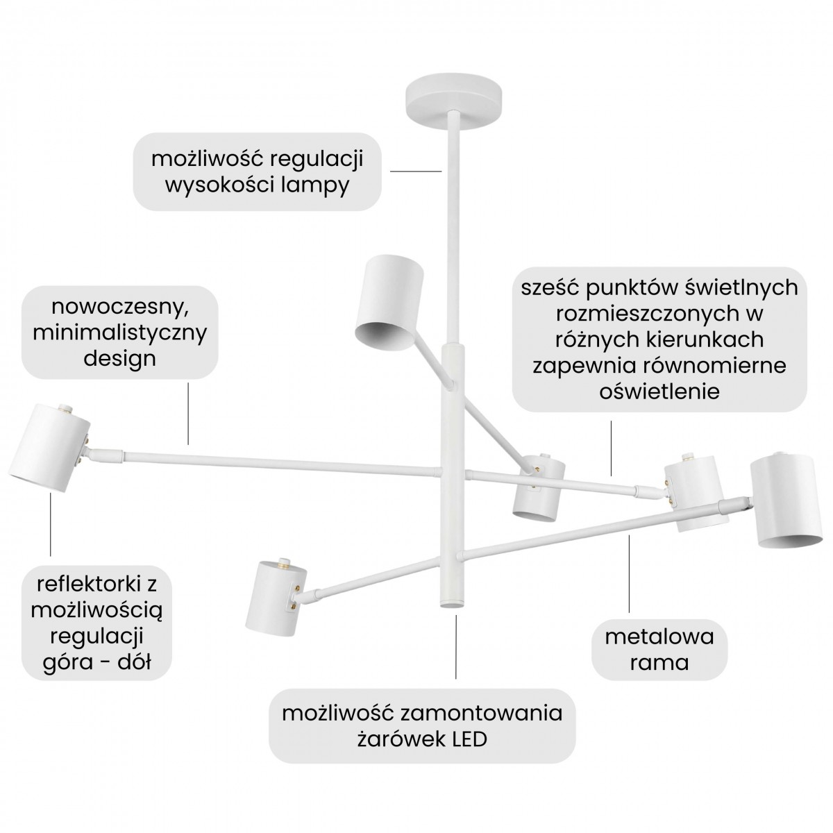 Biała lampa wisząca DORA W6 to model zaprojektowany z myślą o nowoczesnych przestrzeniach, w których oświetlenie odgrywa kluczową rolę w budowaniu nastroju. Sześć reflektorów osadzonych na metalowych ramionach tworzy efektowną kompozycję świetlną idealną nad stół, wyspę kuchenną czy w strefie wypoczynku jako lampa do salonu. Taka konstrukcja zapewnia elastyczność i funkcjonalność, niezależnie od wielkości pomieszczenia.
