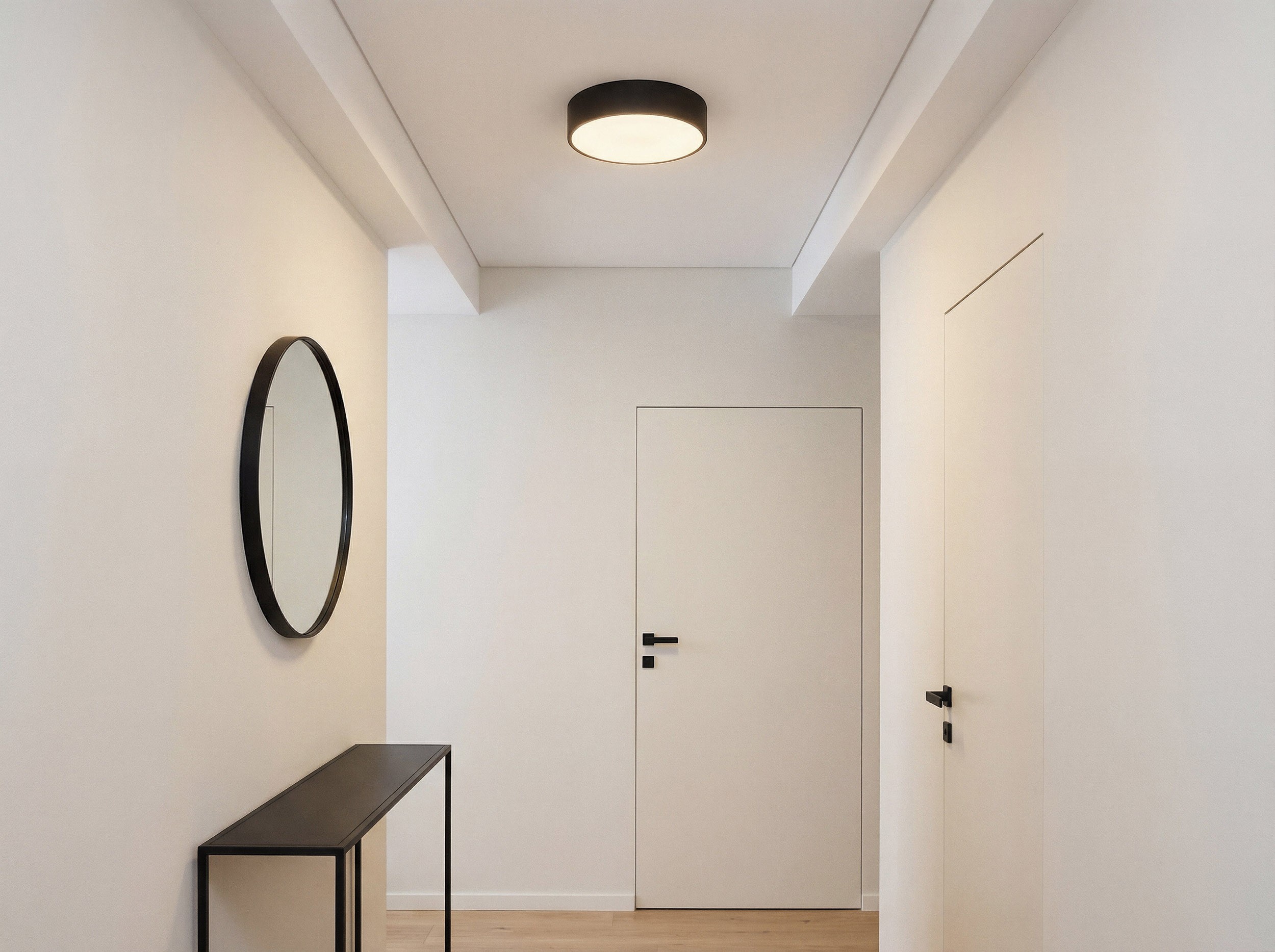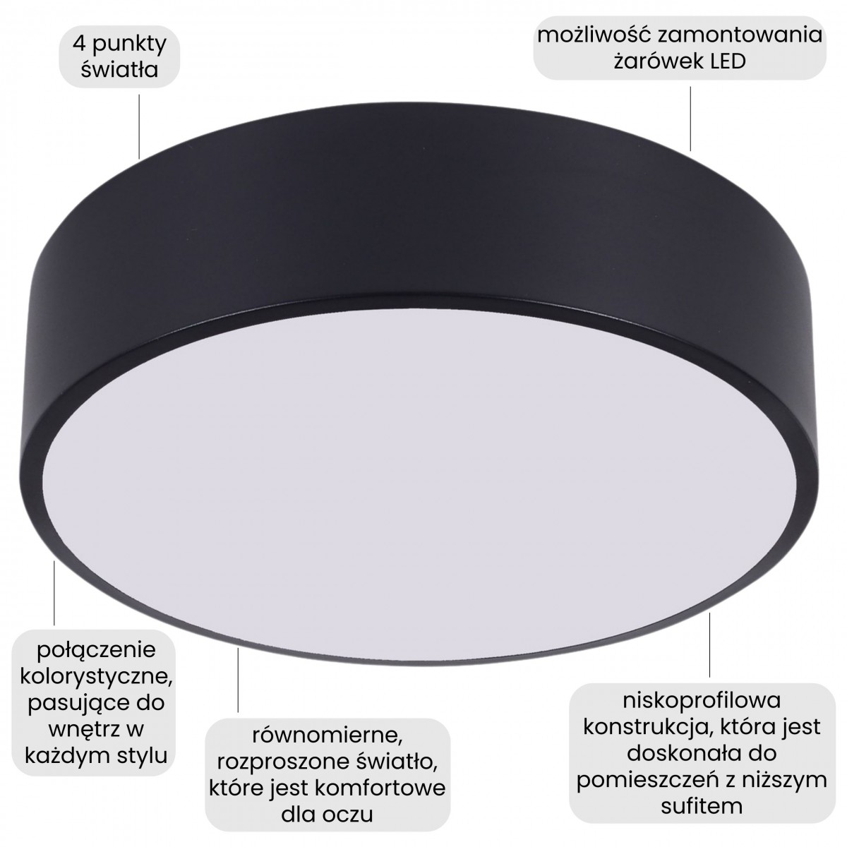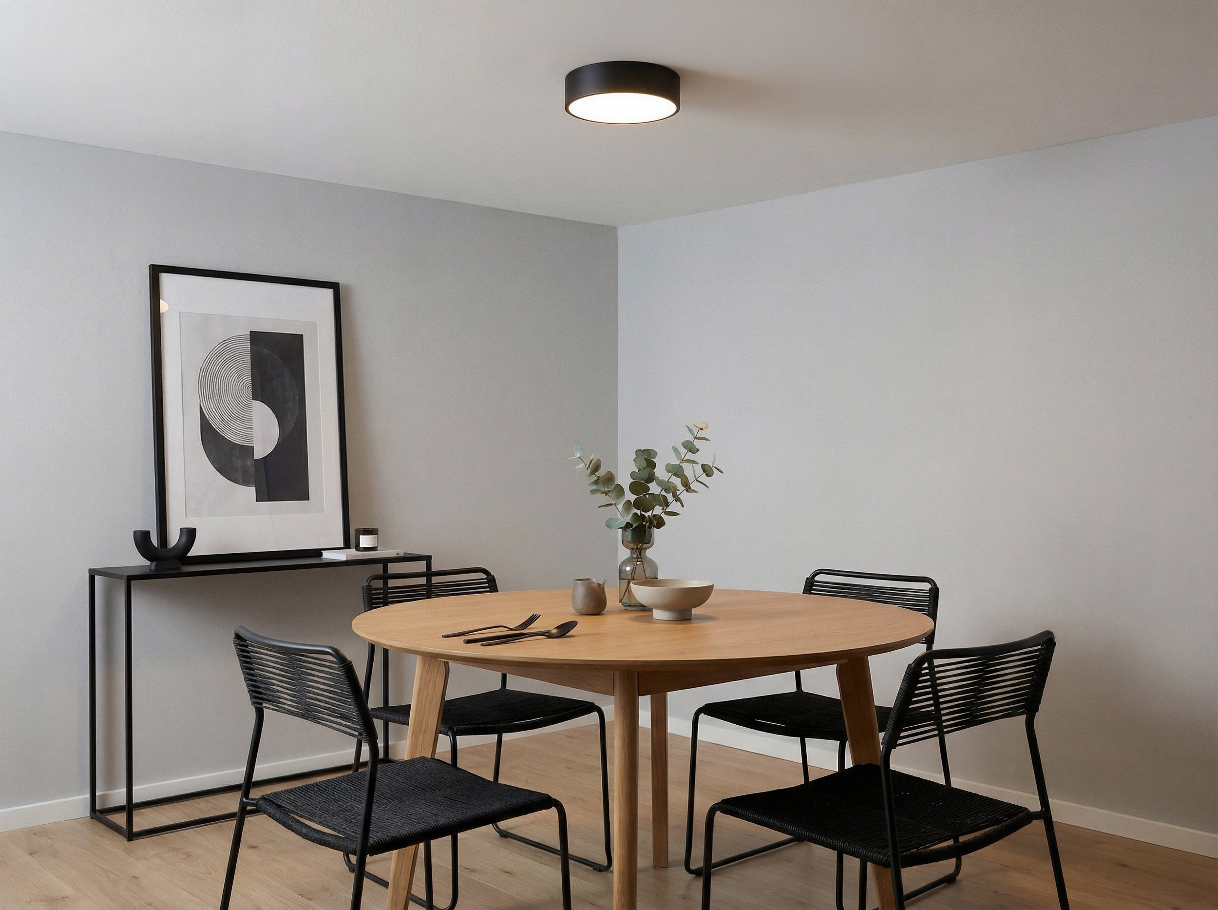 Plafon o tej średnicy może pełnić funkcję głównego oświetlenia w pomieszczeniach średniej wielkości lub elementu wielopunktowego światła. Jego uniwersalny charakter sprawia, że sprawdza się w mieszkaniach, przestrzeniach biurowych i wnętrzach komercyjnych - wszędzie tam, gdzie ważne jest komfortowe, równomierne oświetlenie. Czarna lampa wnosi nowoczesny akcent i dobrze komponuje się z dodatkami charakterystycznymi dla współczesnych aranżacji. Wyjątkowo pasuje do stylów: nowoczesny, minimalistyczny, loft i industrialny, ale odnajdzie się też we wnętrzach eklektycznych, japandi czy modern classic.