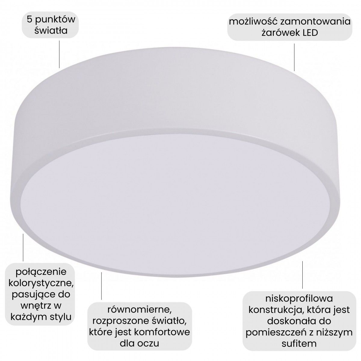 Biały plafon ORBO D40 to nowoczesny model, który cechuje się minimalistyczną formą i zapewnia wysoką funkcjonalność. Rozwiązanie doskonale pasuje do współczesnych wnętrz, które potrzebują stylowego designu i elegancji.