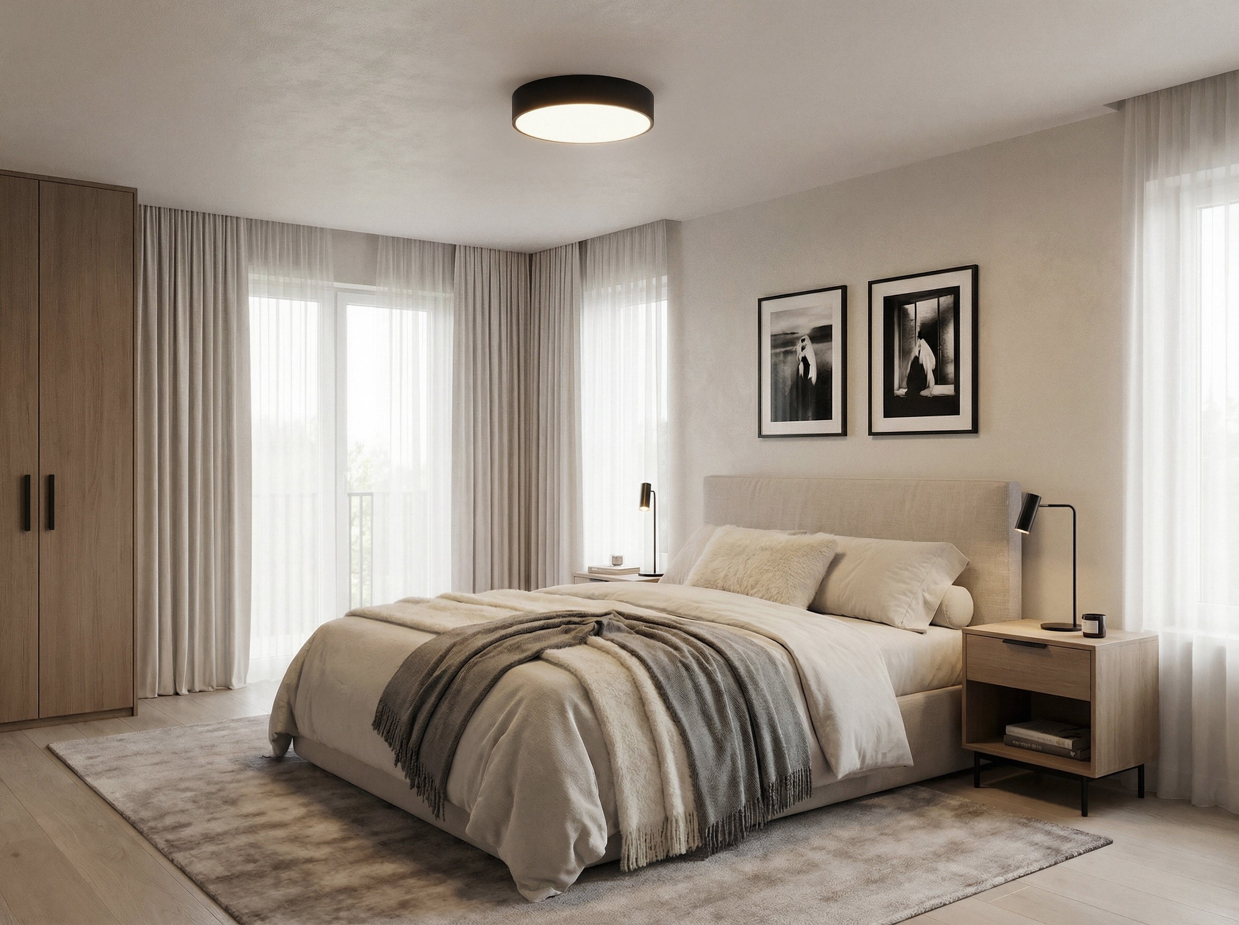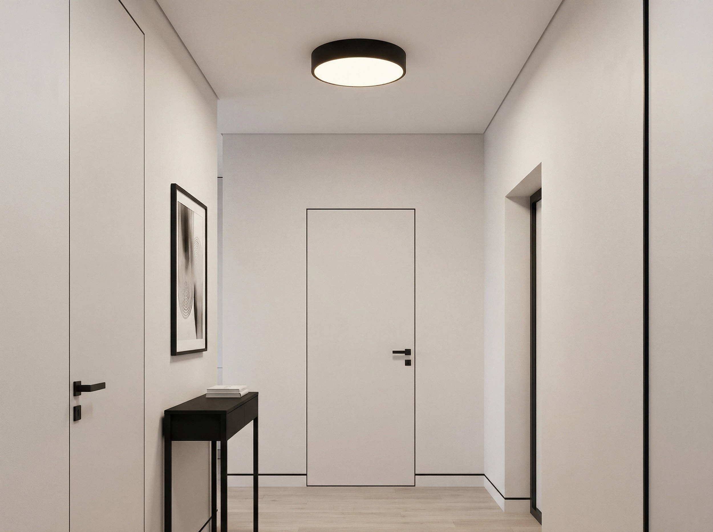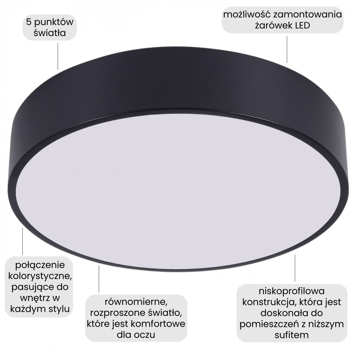 Czarna lampa sufitowa w matowym wykończeniu to rozwiązanie ponadczasowe, uniwersalne i bardzo modne. Wpisuje się w przestrzenie nowoczesne, minimalistyczne, industrialne, loft, modern classic - bez narzucania konkretnego stylu. Dobrze współgra z jasnymi oraz ciemniejszymi barwami, pozwalając stworzyć harmonijny układ oświetlenia zarówno w otwartych strefach dziennych, jak i w bardziej kameralnych pokojach.