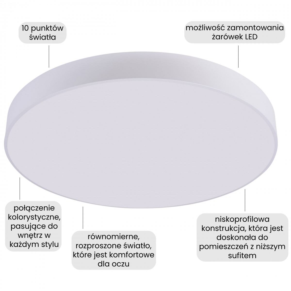 Plafon sufitowy ORBO D78 w białej wersji to nowoczesna lampa, która dzięki dużej średnicy skutecznie oświetla całe pomieszczenie. Klosz mlecznym wykończeniu zapewnia równomierne rozproszenie światła, co ma znaczenie w przestrzeniach o większym metrażu oraz w otwartych układach salonu z jadalnią lub kuchnią. To lampa do salonu, sypialni, kuchni czy przedpokoju, która zapewnia komfortowe warunki do codziennych czynności jak praca, odpoczynek czy spotkania przy stole.
