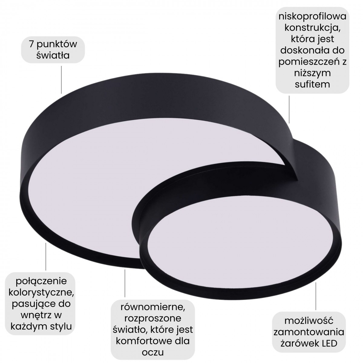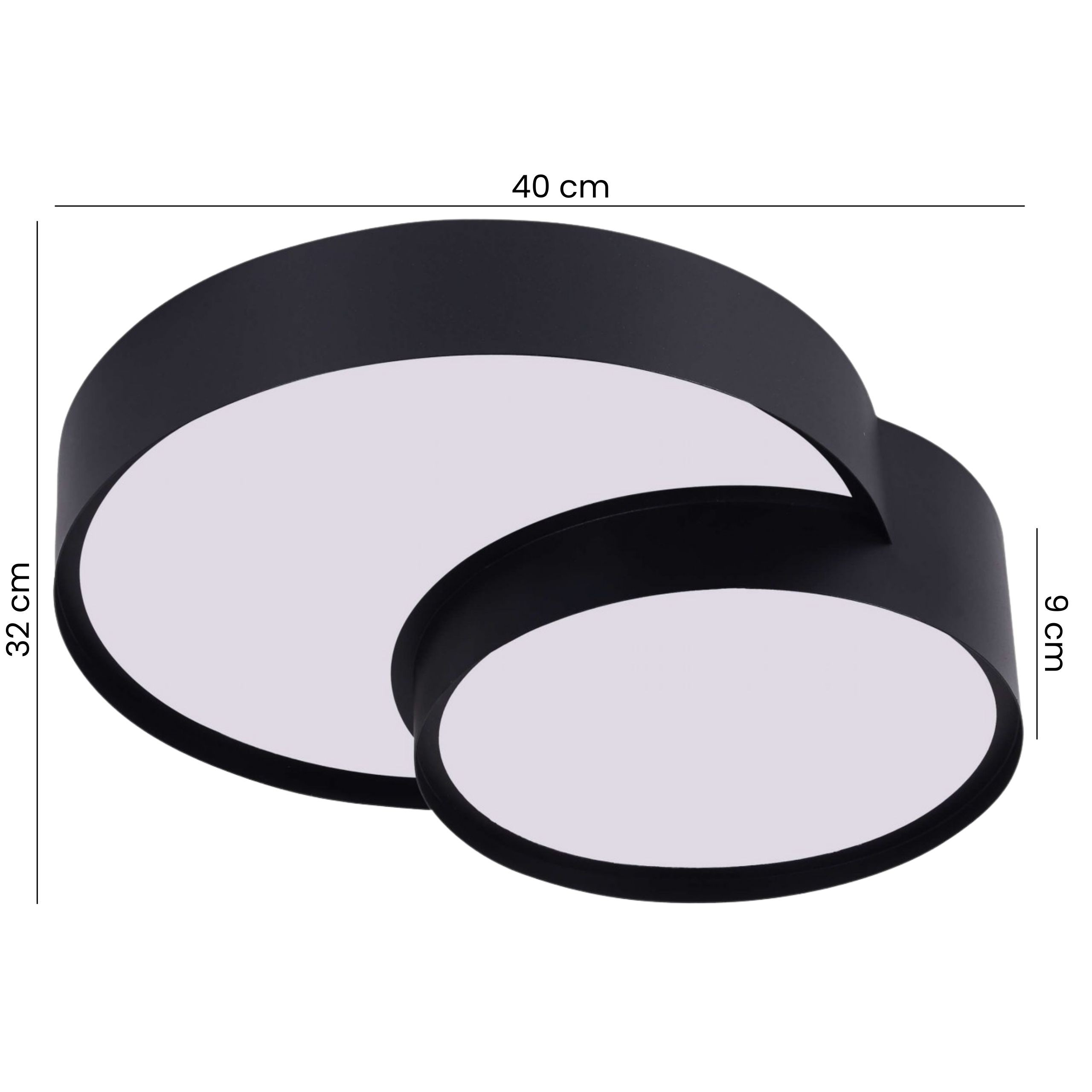 ORBO DUO D40 to czarna lampa sufitowa o nowoczesnej formie, w której dwa okręgi przenikają się i tworzą harmonijną, spójną kompozycję. Matowa czerń podkreśla minimalistyczny charakter lampy, dzięki czemu model prezentuje się nowocześnie w różnych wnętrzach.