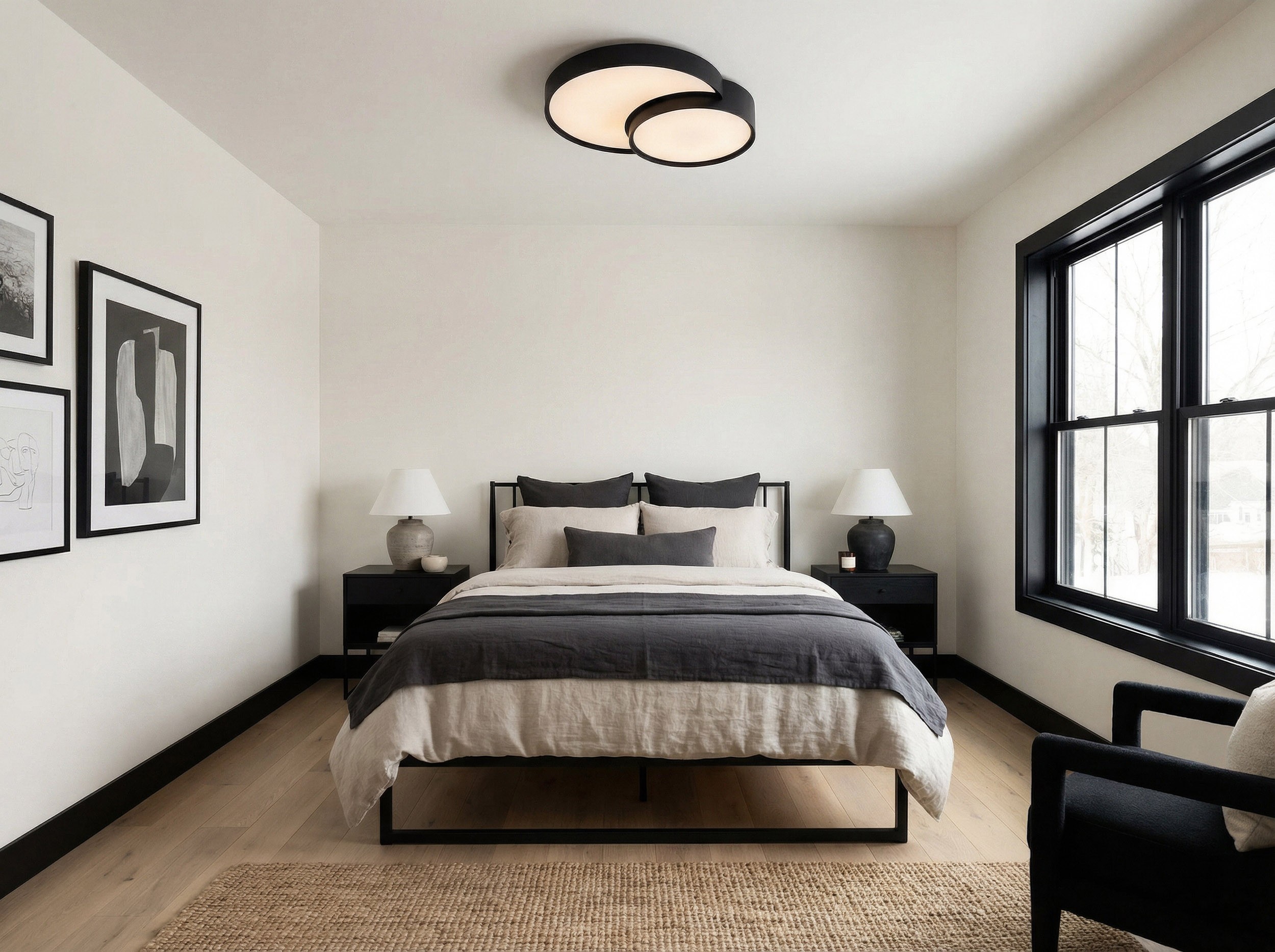 ORBO DUO D48 w wersji czarnej to nowoczesna lampa sufitowa zaprojektowana dla wnętrz, w których światło ma być równie efektowne, jak funkcjonalne. Dwa zachodzące na siebie okręgi tworzą układ o mocnym charakterze, a matowa czerń dodaje całości współczesnej elegancji. To model, który potrafi podkreślić proporcje pomieszczenia i wprowadzić do niego wyraźny akcent.