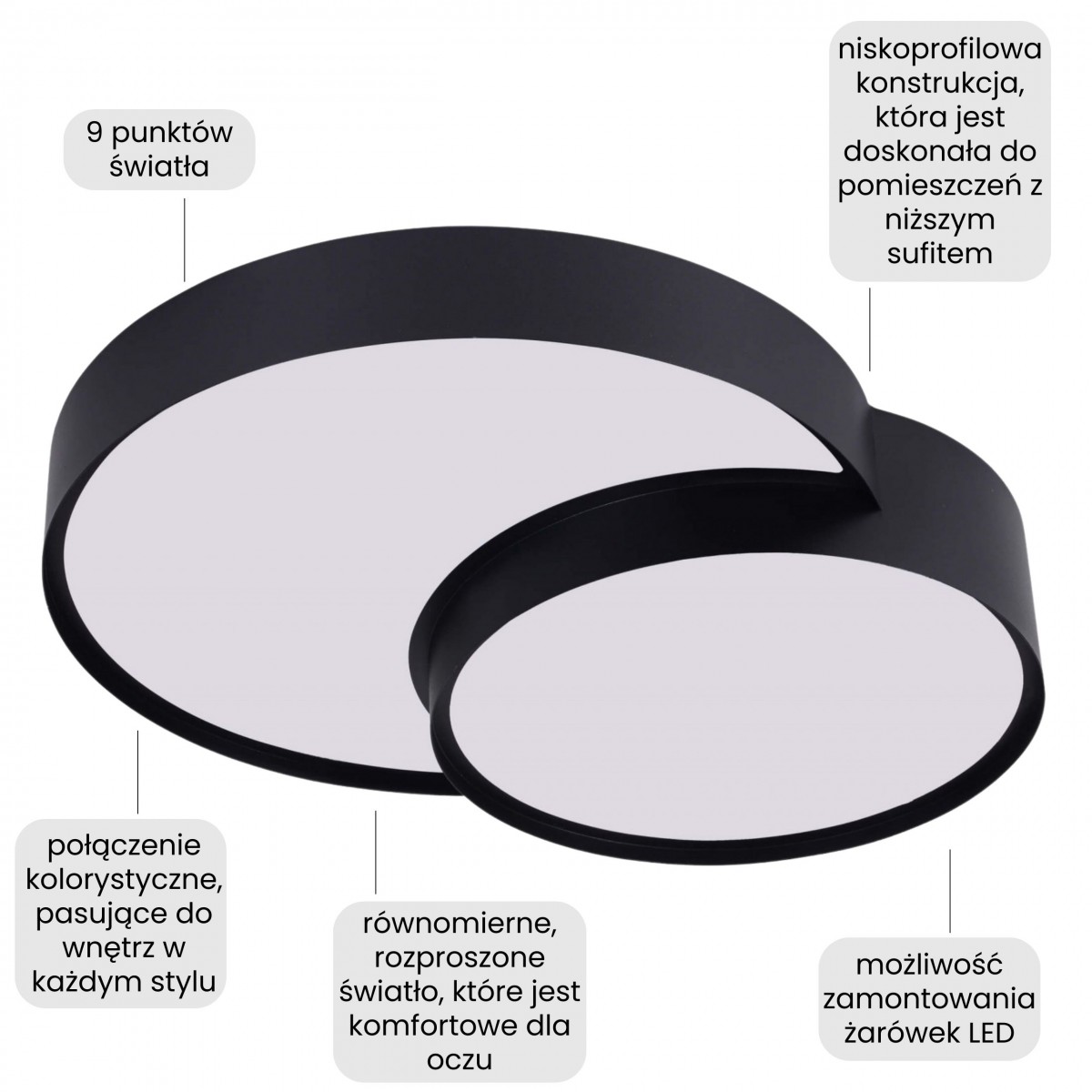 ORBO to kolekcja nowoczesnych plafonów dostępnych w wersjach pojedynczych i podwójnych, w kolorze czarnym i białym oraz w różnych rozmiarach. Wspólnym elementem wszystkich modeli jest geometria oparta na okręgach, równomierne panele świetlne i stylowy design dopasowany do współczesnych wnętrz.