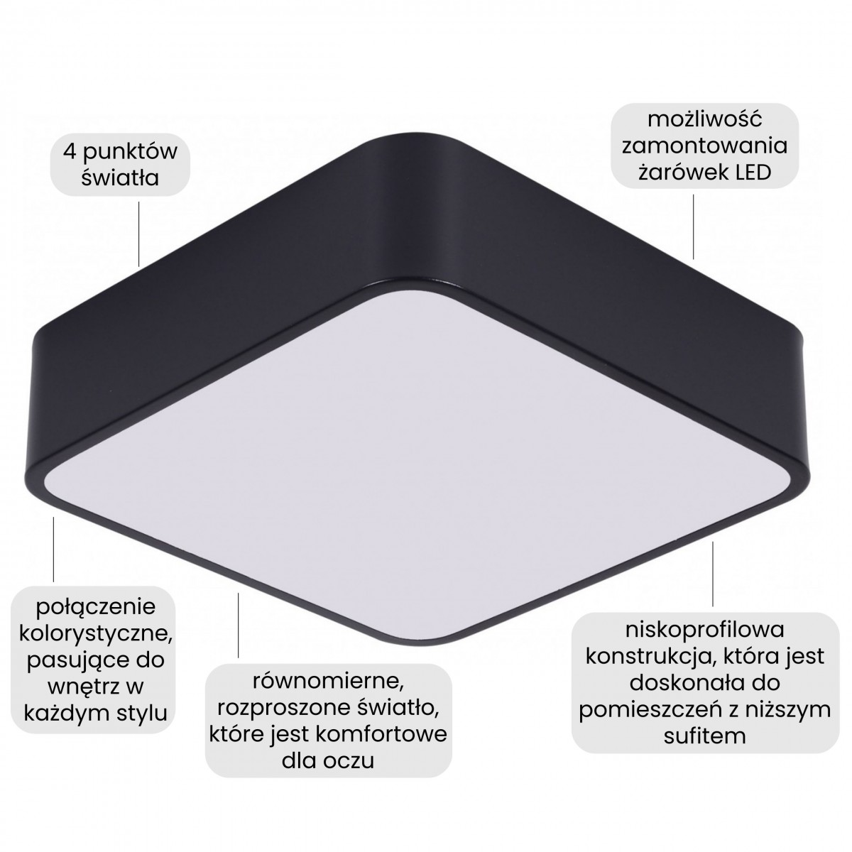 Nowoczesny plafon CUBO D30 to kwadratowa oprawa sufitowa w czarnym wykończeniu, posiadająca mleczny panel świetlny. Model sprawdza się jako główne oświetlenie w mniejszych pomieszczeniach lub jako uzupełniający punkt świetlny w większych metrażach. Kwadratowa forma i kompaktowy rozmiar pozwalają zastosować lampę tam, gdzie liczy się komfortowe światło bez zajmowania dużej powierzchni sufitu. Plafon zapewnia stabilne, komfortowe oświetlenie do codziennych czynności jako lampa do salonu, kuchni, sypialni czy przedpokoju.