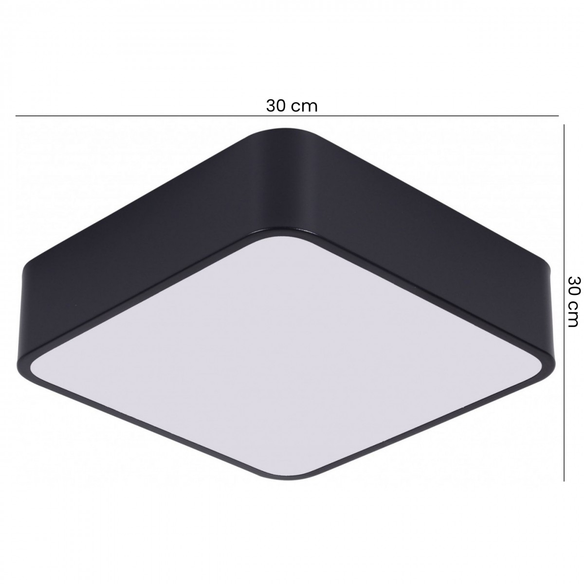 CUBO D30 to nowoczesna lampa sufitowa o kwadratowej formie i czarnym, matowym wykończeniu. Kompaktowe wymiary 30 x 30 cm sprawiają, że plafon doskonale sprawdza się w mniejszych pomieszczeniach, ale dobrze oświetli również wnętrza o średnich metrażach. Model posiada mleczny panel świetlny, który równomiernie rozprasza światło i kontrastuje z ciemną obudową, tworząc wyrazisty, nowoczesny wygląd, pasujący do wielu stylów.