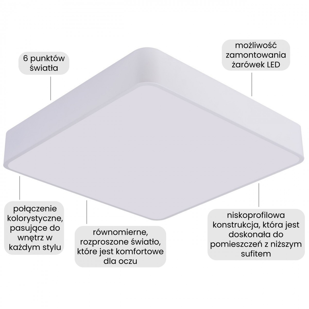 Biała lampa sufitowa o dużej, kwadratowej powierzchni doskonale sprawdza się jako główne oświetlenie w przestrzeniach, w których domownicy spędzają najwięcej czasu. Lampa zapewnia światło sprzyjające codziennym aktywnościom - od wspólnych posiłków, przez rozmowy, po spokojny odpoczynek po dniu pełnym obowiązków. To propozycja do wnętrz, w których światło ma towarzyszyć codzienności w roli lampy do salonu, sypialni czy kuchni, a także zapewniać wysoki komfort w przedpokoju lub garderobie.