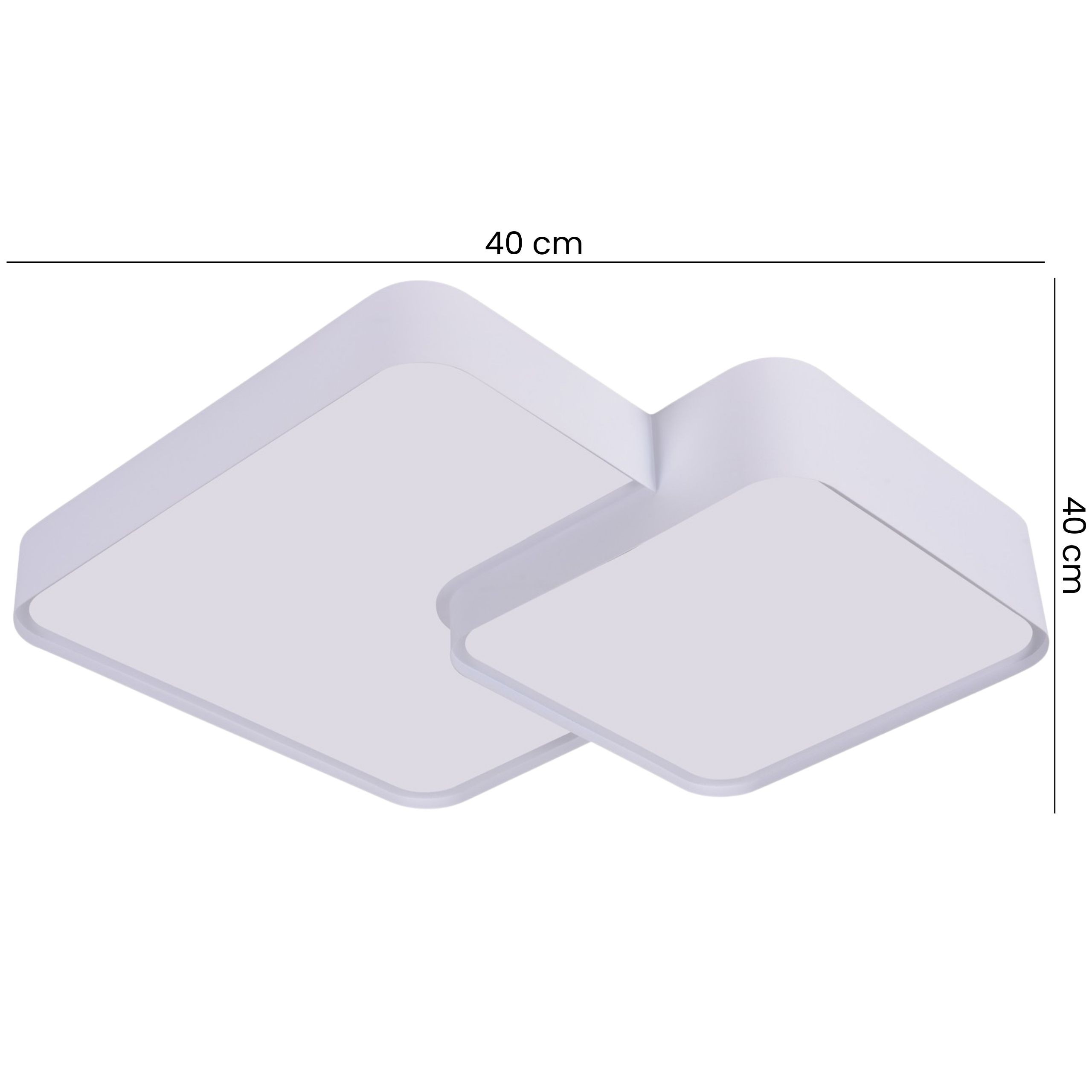 CUBO DUO D40 w kolorze białym to nowoczesna lampa sufitowa zbudowana z dwóch kwadratowych opraw połączonych w jedną kompozycję. Przesunięty względem siebie układ paneli tworzy wyraźną, geometryczną formę. Biała obudowa i mleczne panele świetlne nadają całości spójny, nowoczesny wygląd, pasujący do wielu aranżacji.