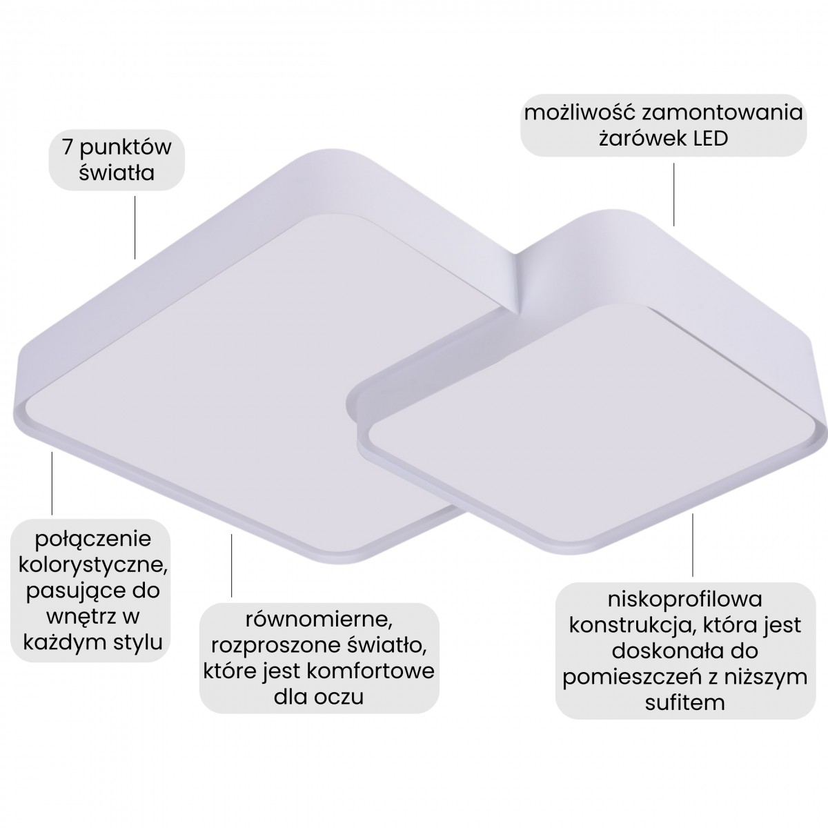Lampa sufitowa CUBO DUO D40 wyróżnia się układem dwóch kwadratowych paneli, które pozwalają skutecznie doświetlić nawet większe pomieszczenie. Taki rozkład światła sprawdza się w przestrzeniach, gdzie jedna lampa ma obsługiwać kilka stref jednocześnie. Model zapewnia komfortowe oświetlenie do takich czynności jak praca, gotowanie, wspólny czas przy stole czy odpoczynek, jako lampa do salonu, sypialni, przedpokoju i kuchni.