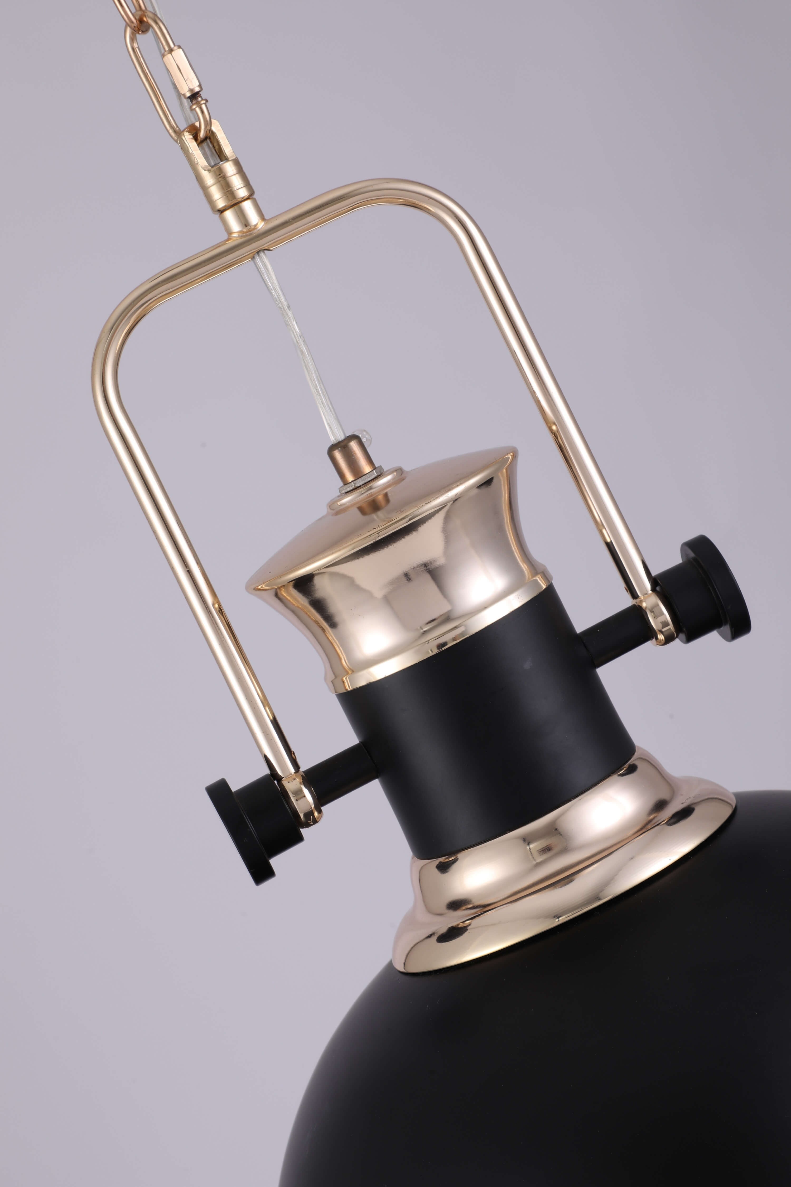 Oryginalna loftowa lampa wisząca stylizowana na lwowskie lampy naftowe. Wykonana z wytrzymałego metalu i dodającego jej sznytu szkła, zawieszona na dekoracyjnym złotym łańcuszku, łączącym się z jej industrialnym designem i pozwalającym dowolnie regulować jej wysokość. Dodatkowa dekoracja — czarna foremna podsufitka, oryginalnie kontrastująca z bielą sufitu.