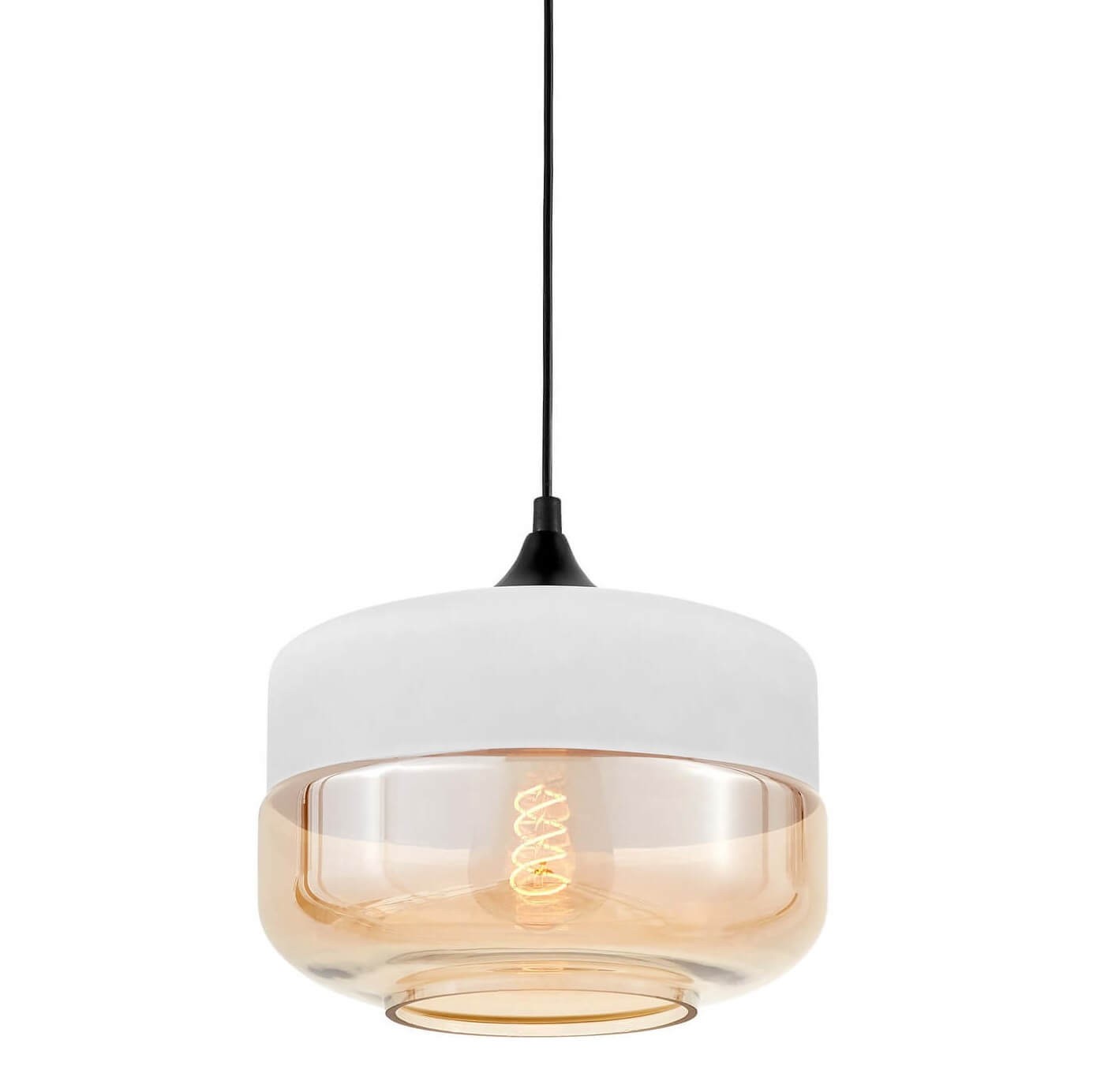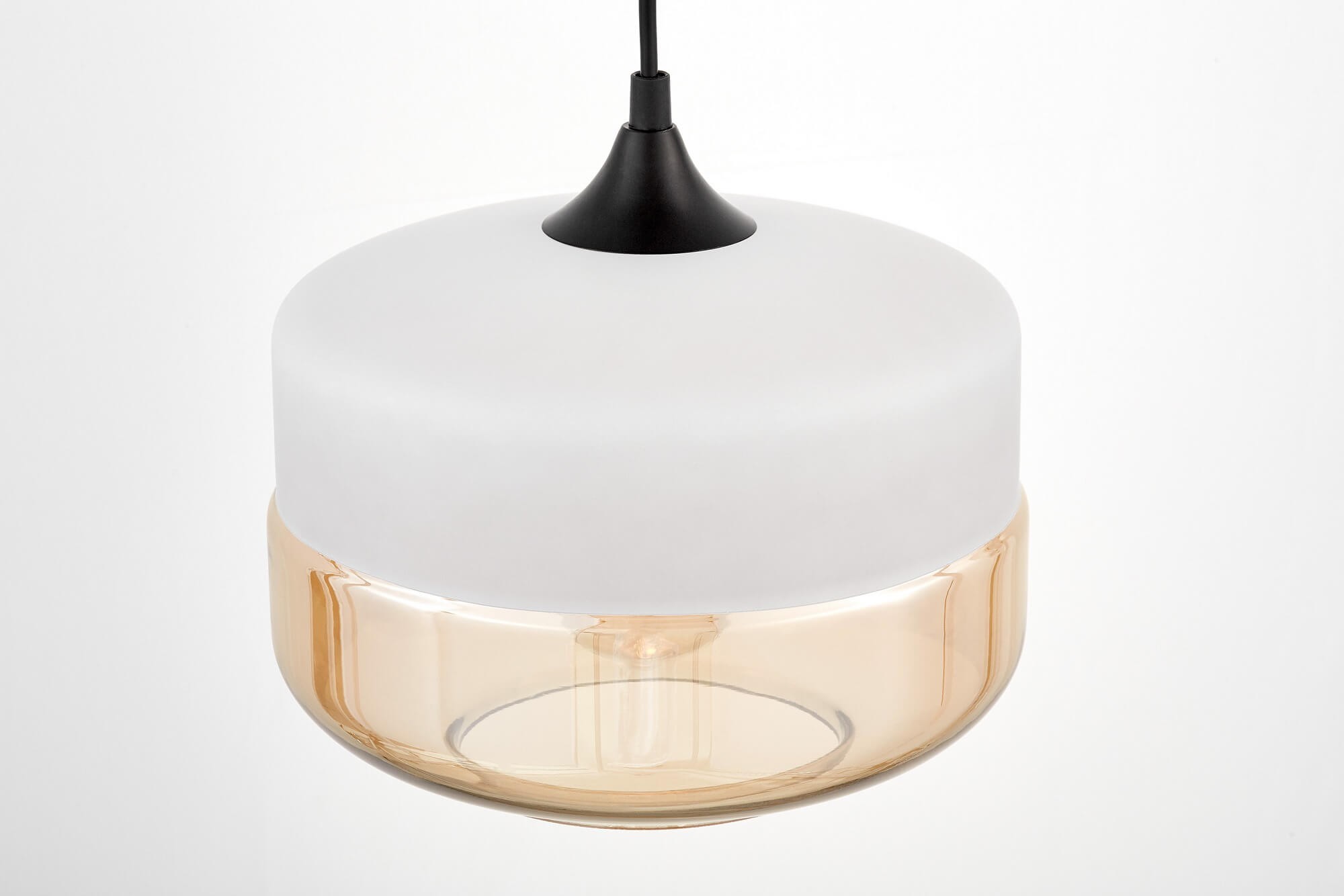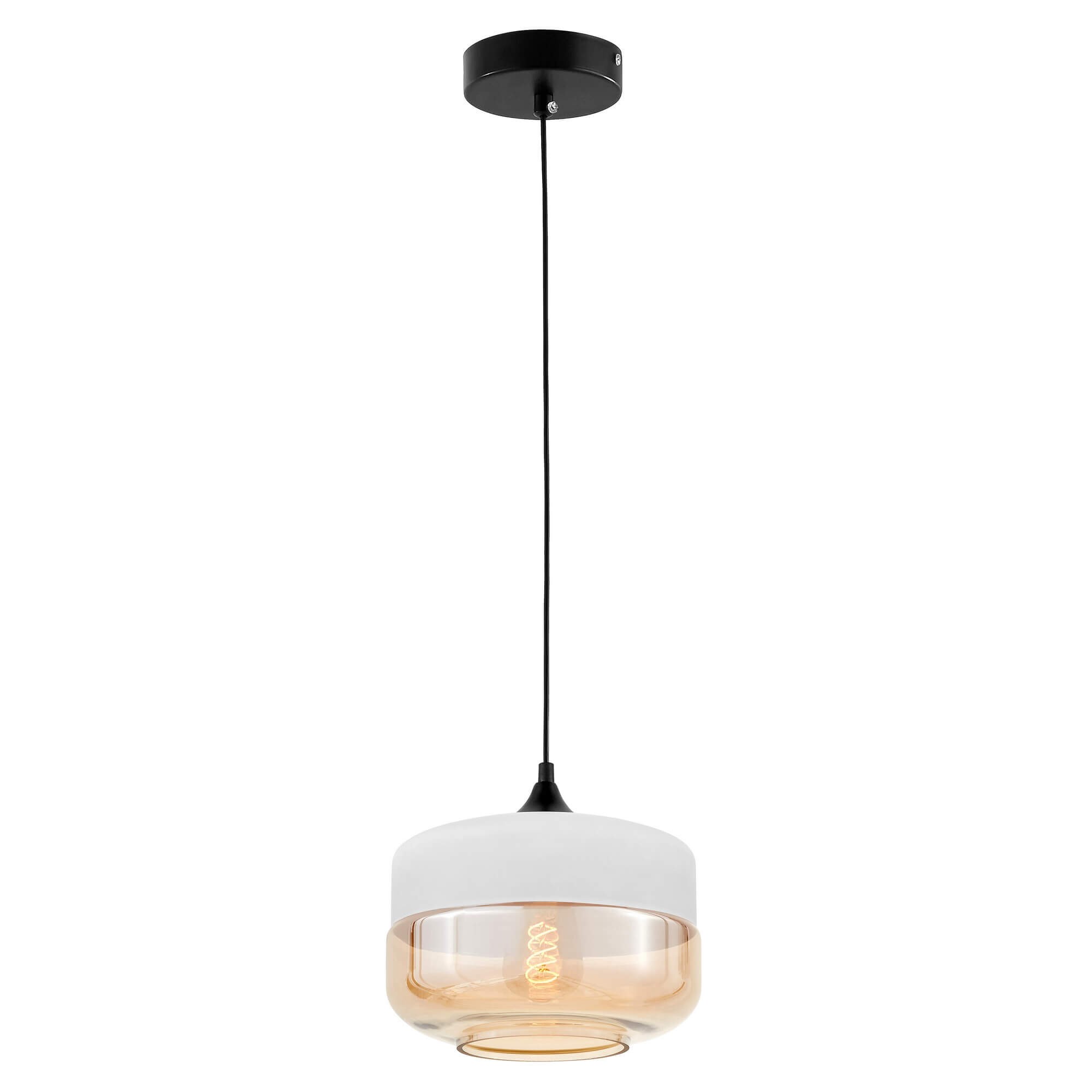 Na serię BARLET składają się projekty, które mocno nawiązują do modnego w dzisiejszych czasach nurtu industrialnego. Jego główne cechy, czyli prostota i surowość, wpisują się we współczesne upodobania i gusta, a jednocześnie w chęć posiadania rzeczy użytecznych, które nie atakują przepychem. Taka właśnie jest kolekcja oświetlenia, do której należy prezentowana lampa wisząca. Wyróżnia się ona zastosowaną kolorystyką oraz ciekawym projektem kształtu klosza. Kolory są bardzo kontrastowe – od czarnego kabla oraz podsufitki, przez biel górnej części klosza, aż po bursztynowo-transparentny jego szklany spód, który przyciąga do siebie swym ciepłem i przytulnością. Przestrzeń otulona nastrojowym i przyjemnym ciepłem światła dobiegającego z lampy jest jednocześnie doskonale rozświetlona, dzięki występowaniu otworu u dołu lampy, przez które dostaje się jeszcze więcej światła niż przez przezroczystą część klosza.
