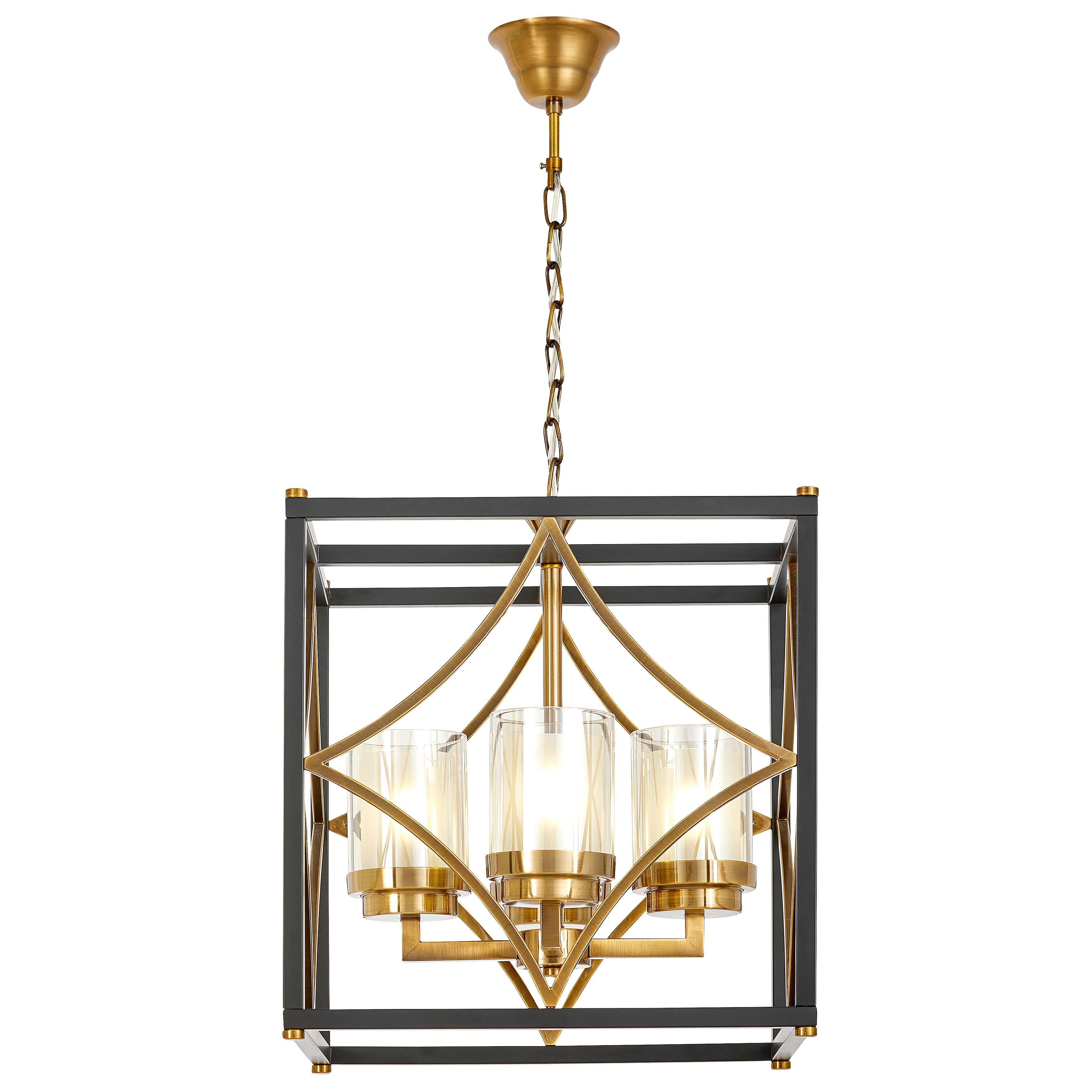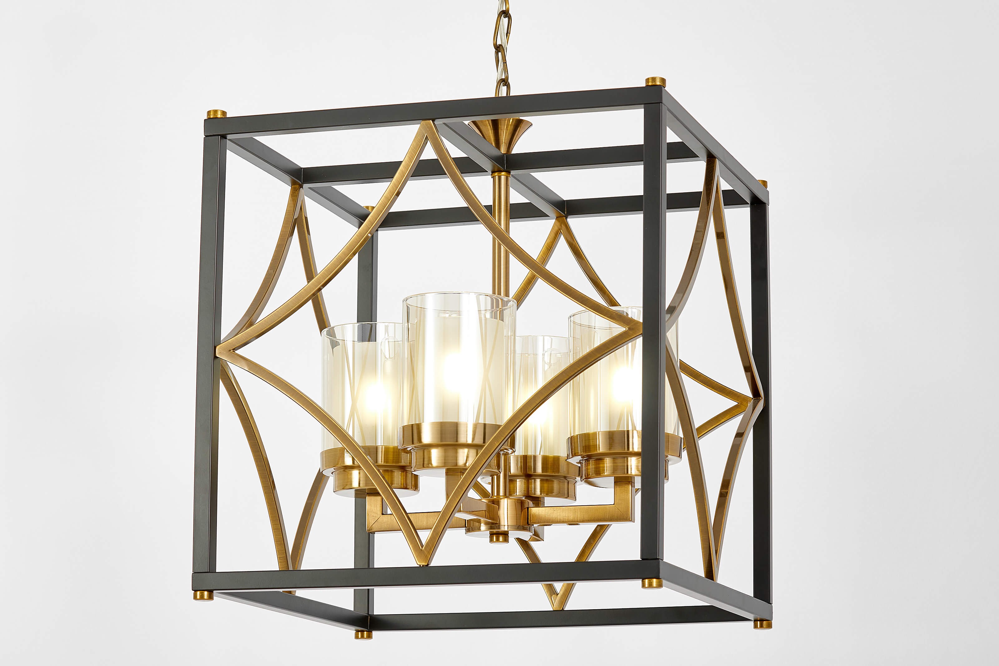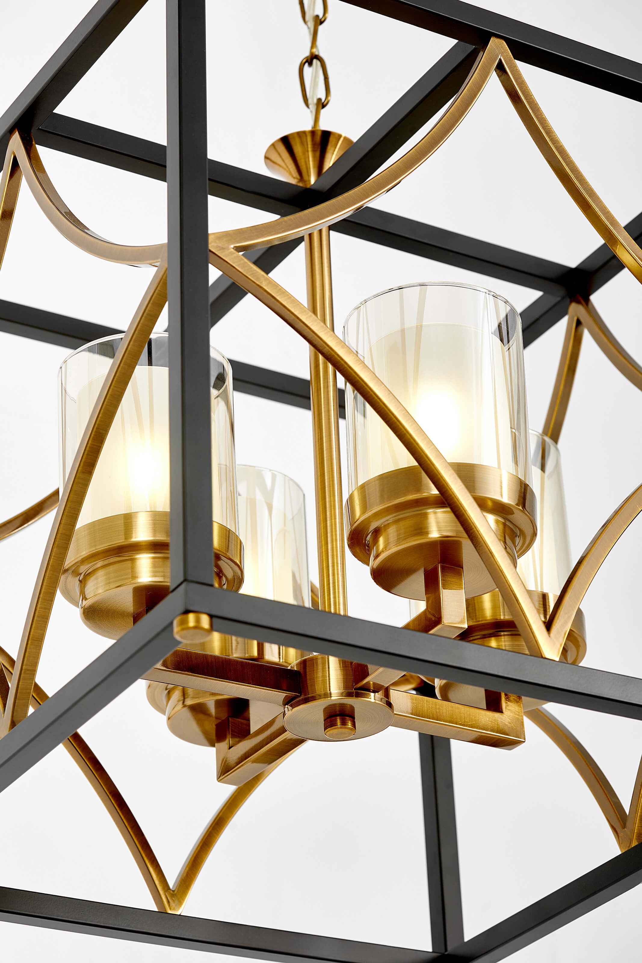 Metalowa rama w matowej czerni została zestawiona z mosiężnymi detalami, które wprowadzają do projektu szlachetność i ciepło. Szklane cylindry otaczające źródła światła subtelnie je rozpraszają, tworząc przyjemną, nastrojową iluminację. Starannie dopracowane wykończenie podkreśla luksusowy charakter lampy.