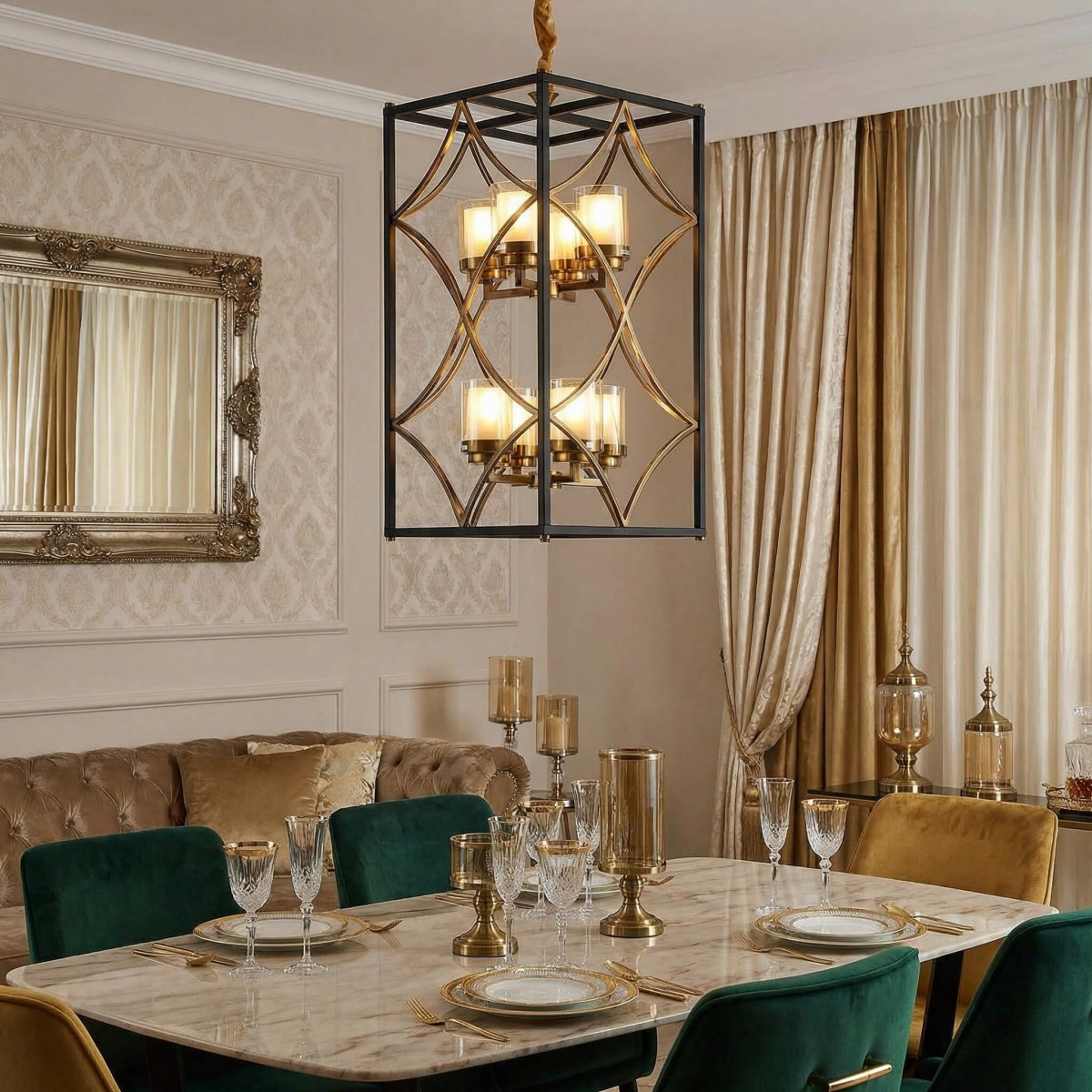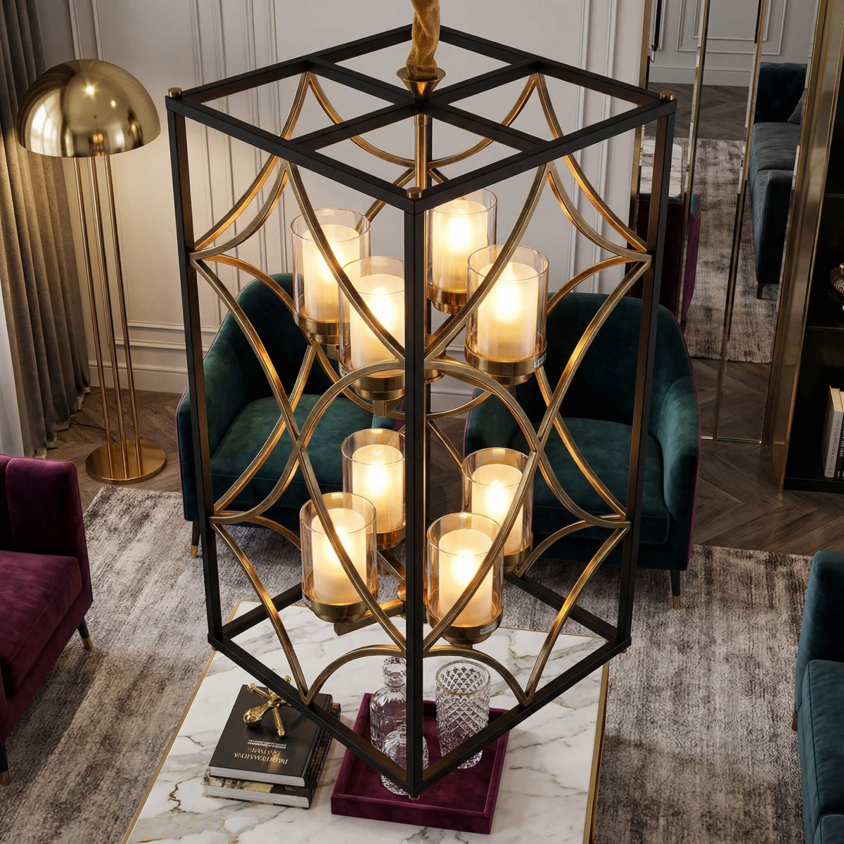 Podwójna, wydłużona konstrukcja przyciąga uwagę swoją skalą i architektoniczną precyzją. Geometryczna rama w czerni tworzy wyrazistą bryłę, a miękko poprowadzone, mosiężne linie wewnątrz nadają całości lekkości i dekoracyjnej finezji. QUADRATO DUO to połączenie loftowej formy z klasyczną elegancją.