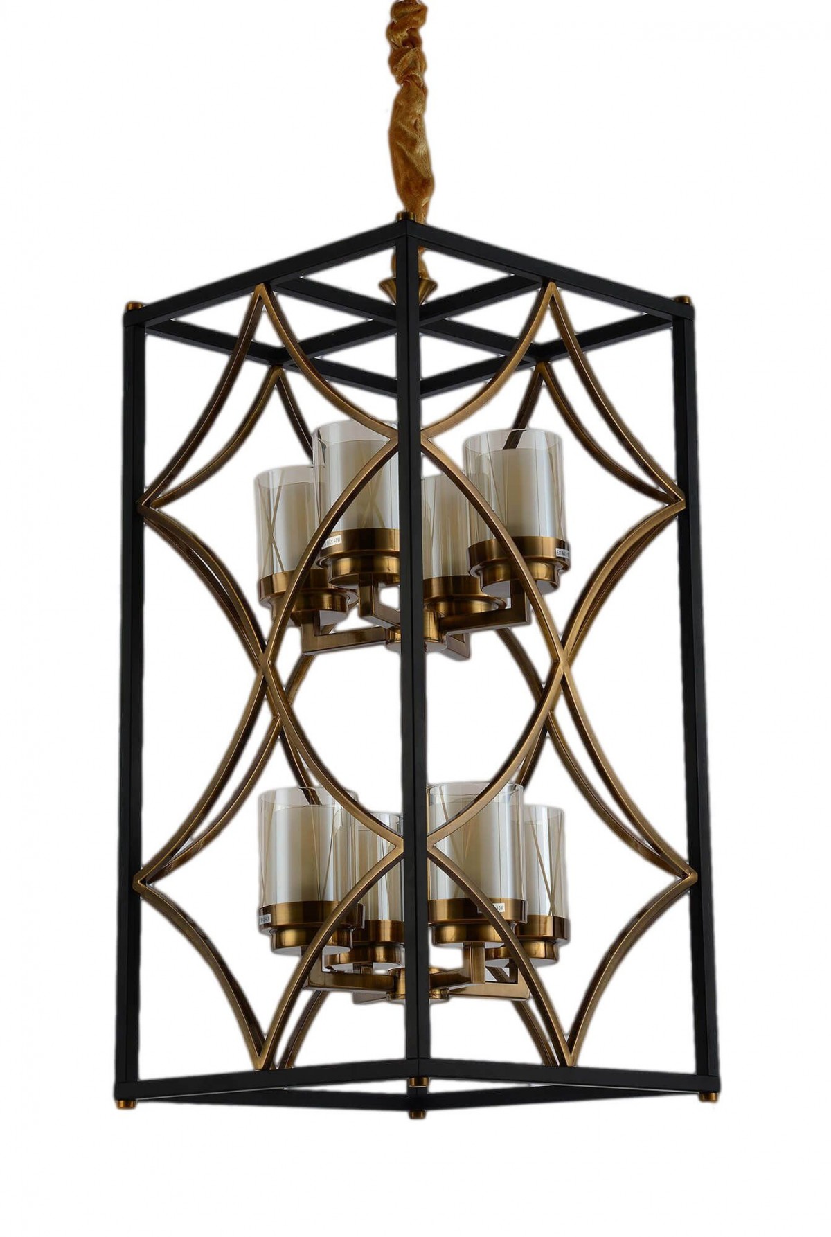 Kolekcja QUADRATO DUO jest ciekawym rozwiązaniem dla wszystkich tych, którzy chcą wkomponować w spokojne wnętrze nieco zadziorności i mocnych elementów dekoracyjnych w postaci oświetlenia. Lampa wisząca z tej serii jest nie tylko bogatym źródłem światła, ale też sama w sobie tworzy ozdobę pomieszczenia. Czarno-mosiężna prostokątna konstrukcja z mosiężnymi motywami skrywa we wnętrzu osiem kloszy, podzielonych na dwie kondygnacje. Szklane klosze stworzone są na zasadzie podwójnej tuby, od wewnątrz matowej, mlecznego koloru, z zewnątrz przezroczystej, co potęguje nastrojowość oświetlenia.