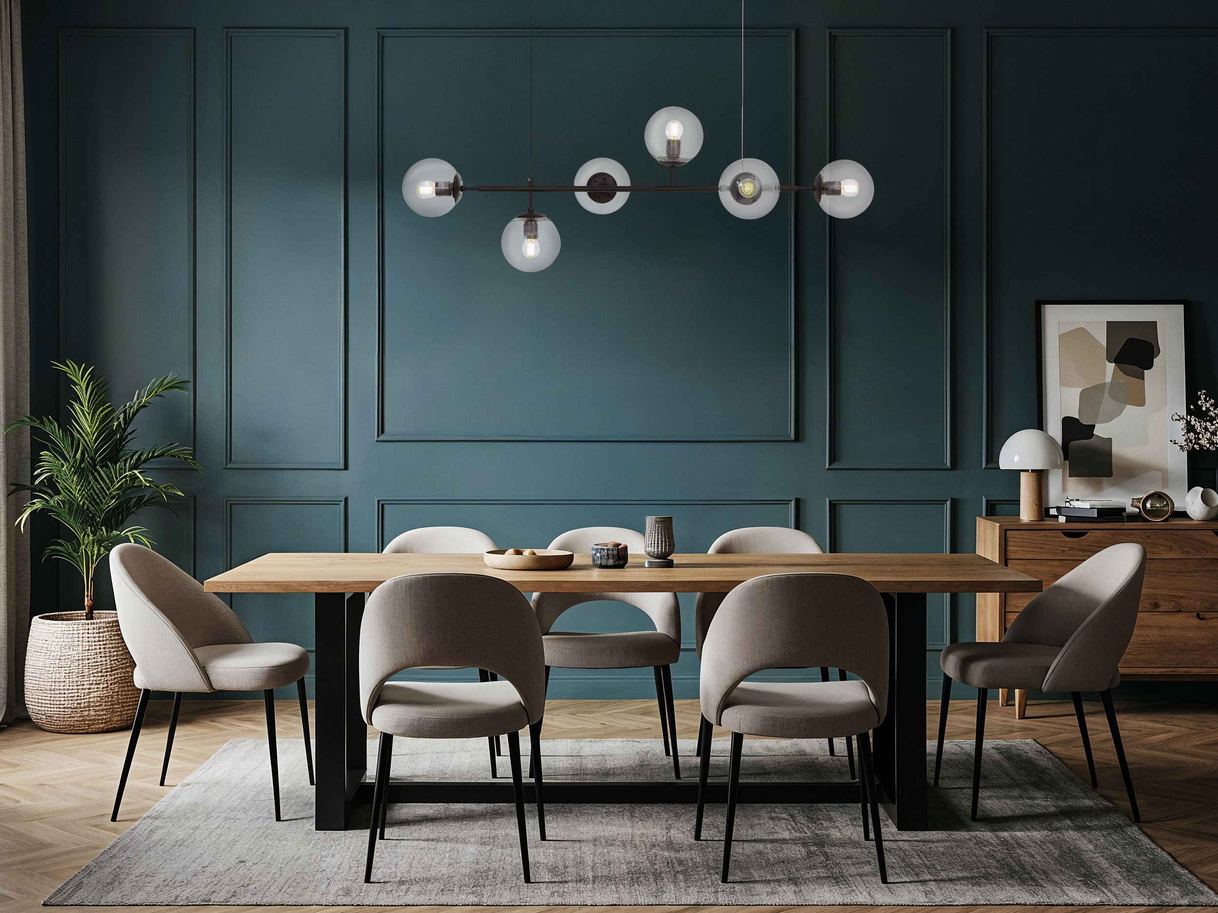 Nowoczesna stylistyka przebijająca się z każdego detalu lampy wiszącej CEREDO W6 wzmocniona została kolorystyką produktu, którego metalowa, czarna oprawa zestawiona została z sześcioma, przezroczystymi kloszami. Proste, ale wdzięczne w swej uniwersalności i wysublimowaniu oświetlenie nada nonszalancji salonowi, sypialni, a swój funkcjonalizm podkreśli w jadalni oraz kuchni.