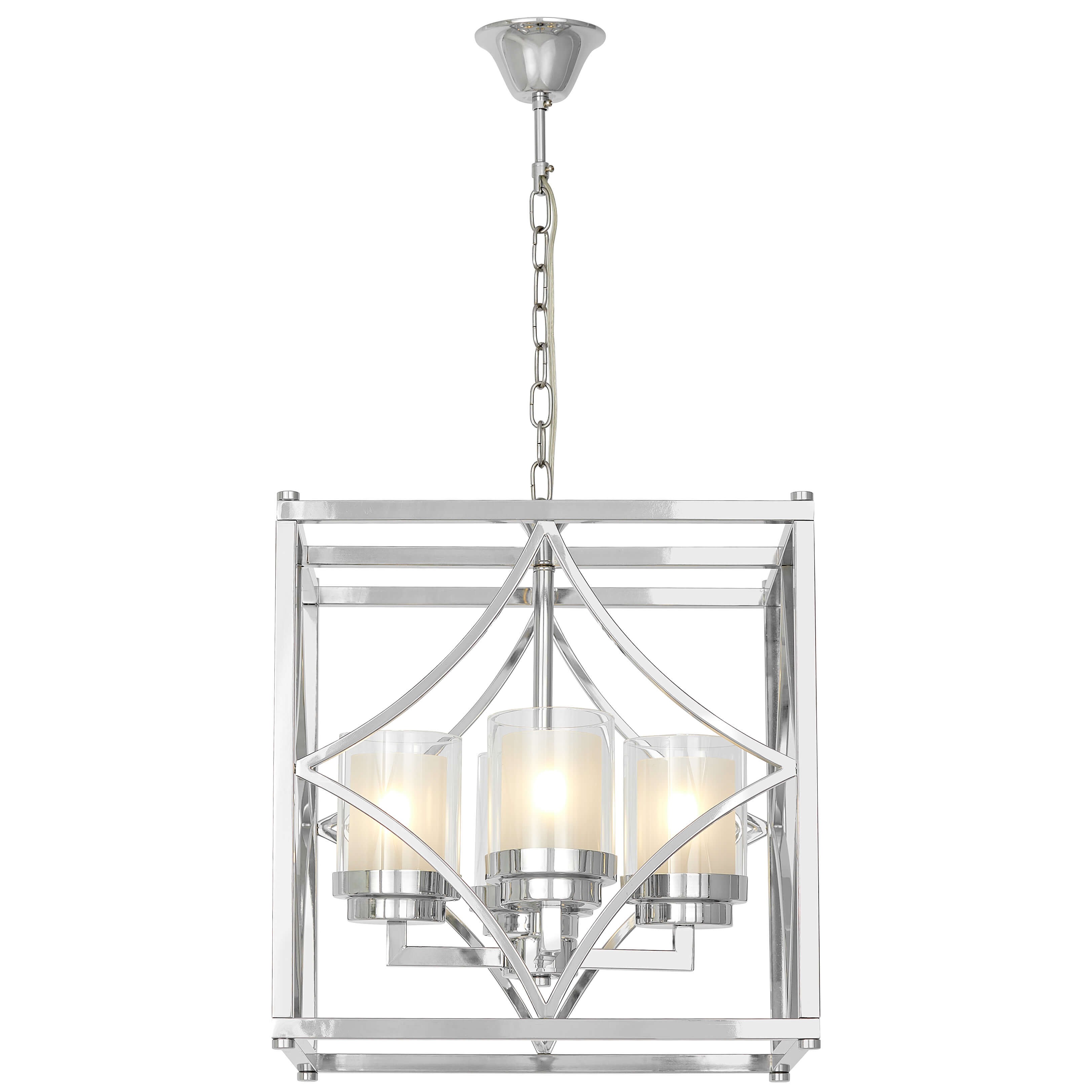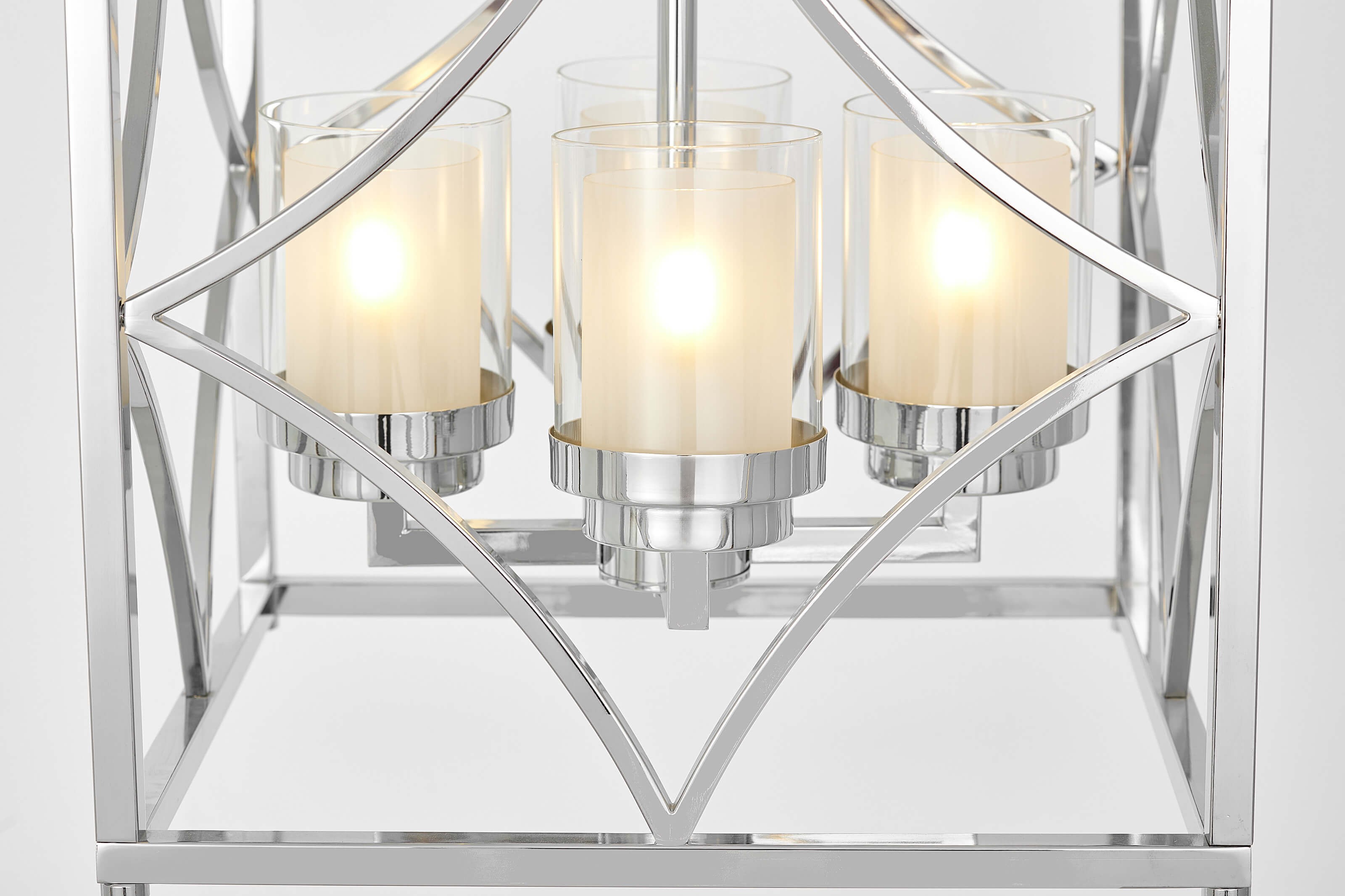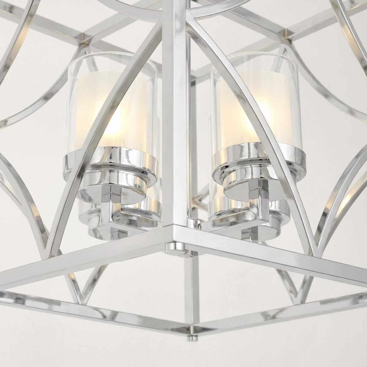 Metalowa rama w lśniącym chromie pięknie odbija światło, optycznie rozjaśniając przestrzeń i nadając jej lekkości. Szklane cylindry osłaniające źródła światła delikatnie je rozpraszają, tworząc przyjemną, ciepłą iluminację. Precyzyjne wykończenie detali podkreśla luksusowy charakter lampy.