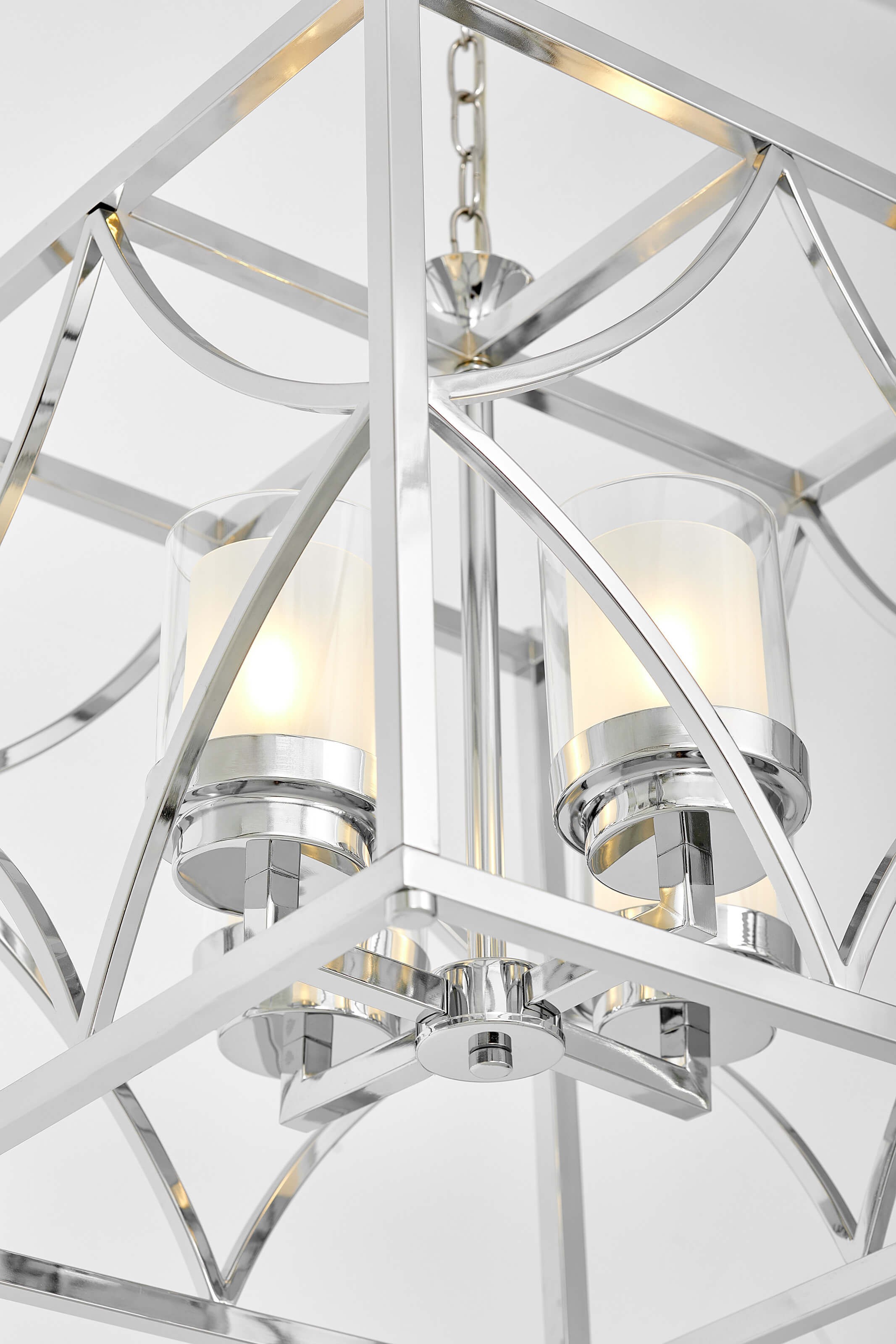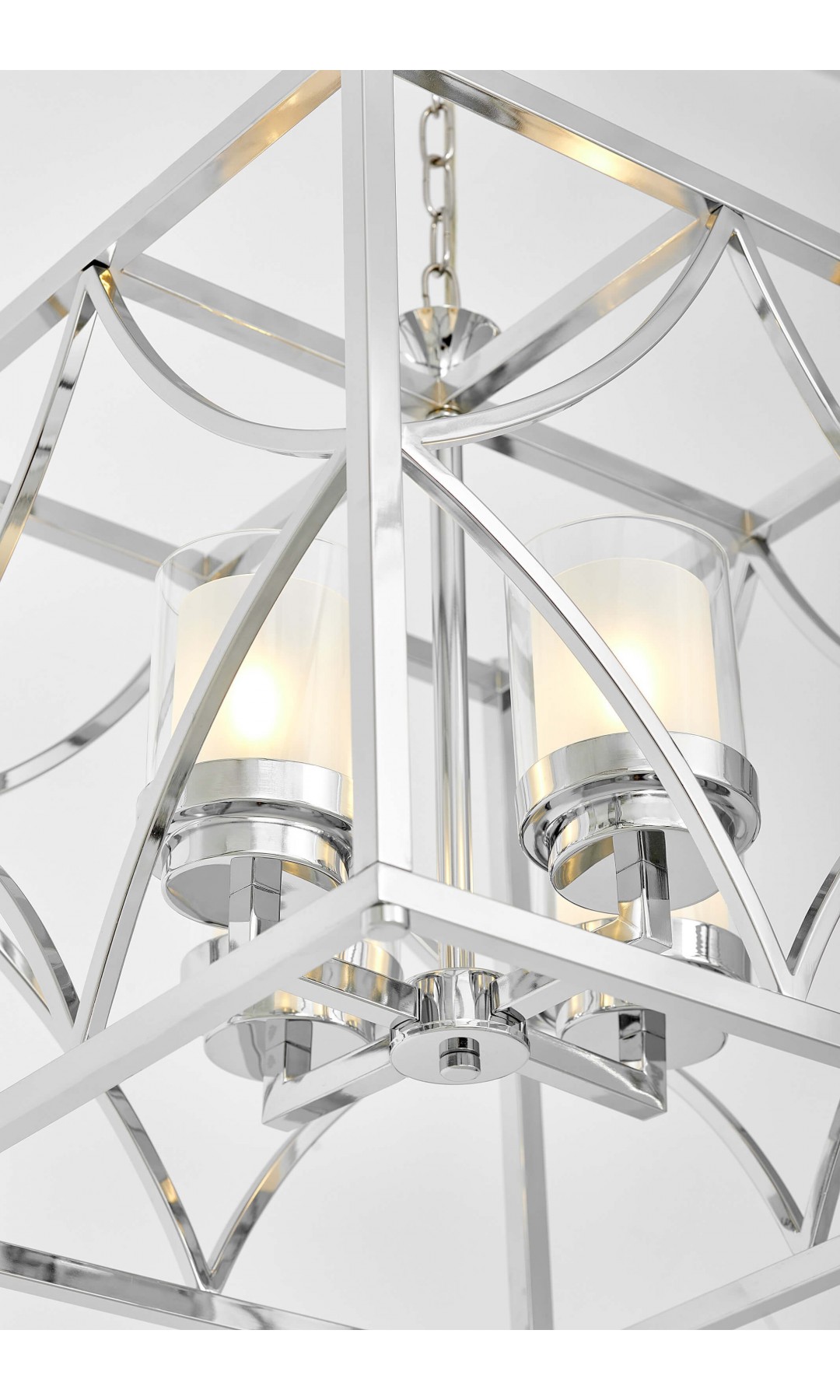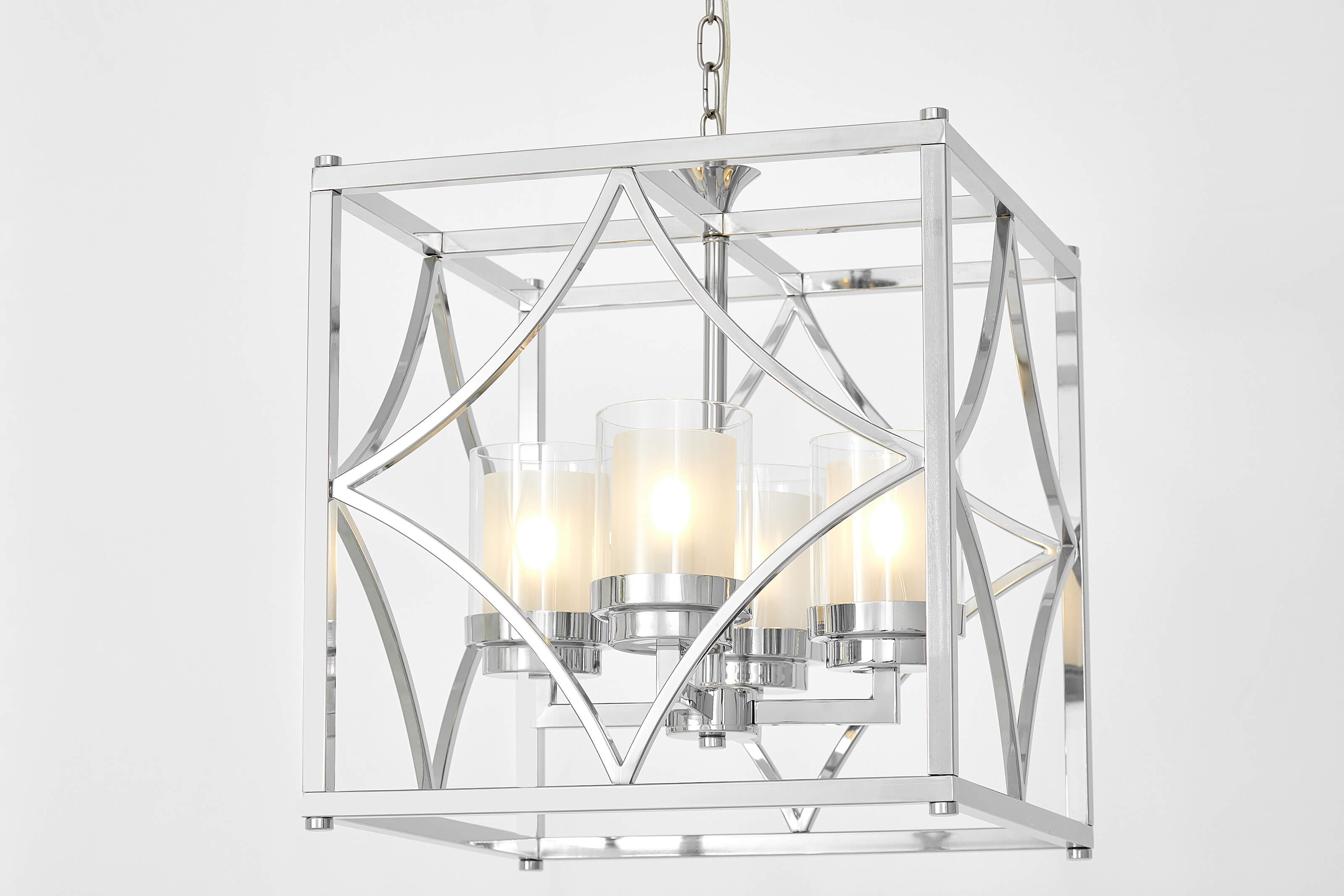 Regularna, kubiczna konstrukcja nadaje lampie wyrazisty i uporządkowany charakter. Smukłe linie ramy oraz dekoracyjne łuki wewnątrz bryły tworzą harmonijną całość, która łączy nowoczesną geometrię z ponadczasową elegancją. QUADRATO w chromie doskonale podkreśla reprezentacyjny charakter wnętrza.