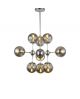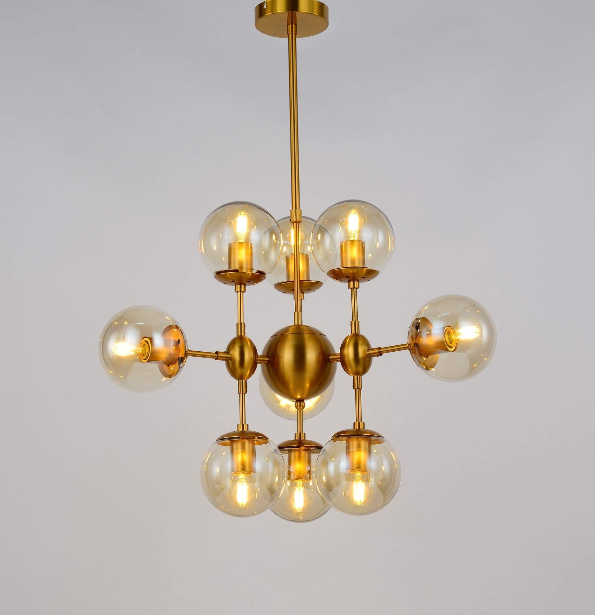Tym, co zachwyca w kolekcji GALA, jest połączenie ciepłego odcienia mosiądzu, który zastosowano w całej metalowej konstrukcji, ze szkłem o barwie szlachetnego bursztynu. Nie tylko zmysłowa kolorystyka, ale i oryginalny kształt przyciągają wzrok i sprawiają, że lampa wisząca jest dostrzegalna w każdej przestrzeni. Spore gabaryty mieszczą w sobie metalowy układ powiązanych ze sobą rurek i kul, które razem tworzą ciekawą architektonikę lampy. W centralnej części lampy występują od góry: podsufitka, a dalej długa, metalowa rurka łącząca górę lampy z wielką kulą pośrodku. Ramiona klosza rozchodzą się we wszystkie strony i zakończone są podstawami pod kuliste klosze, które dzięki subtelnej, bursztynowej barwie stają się idealnym dopełnieniem całości.