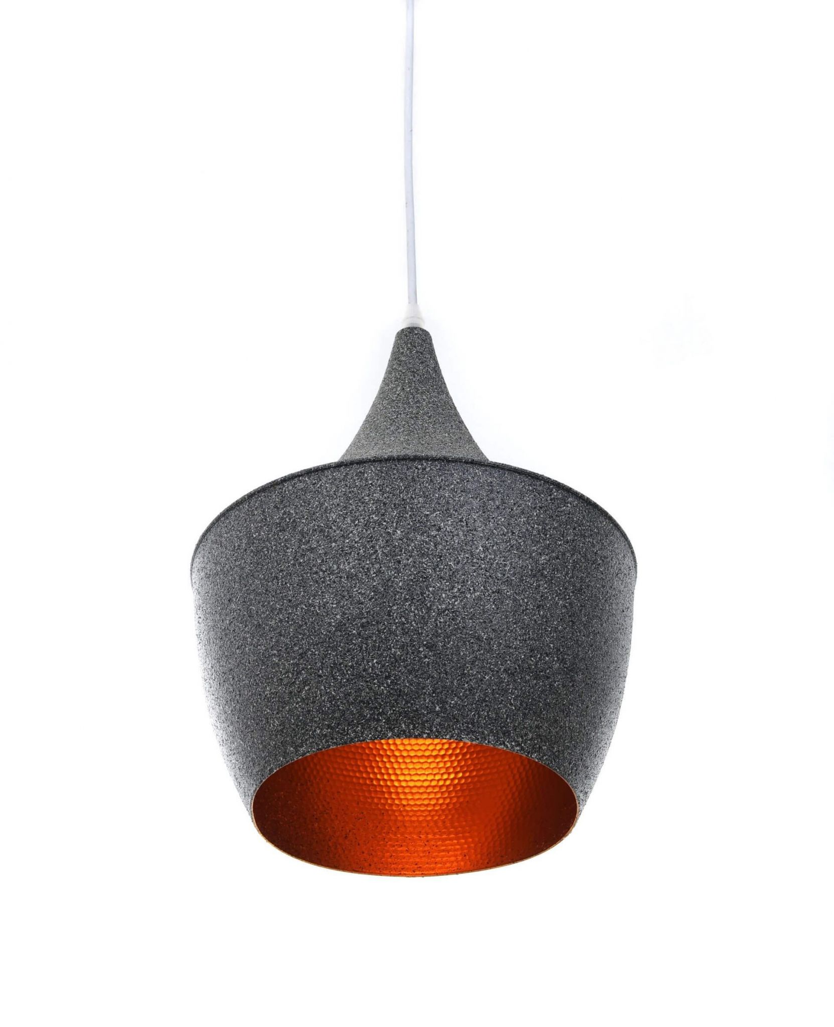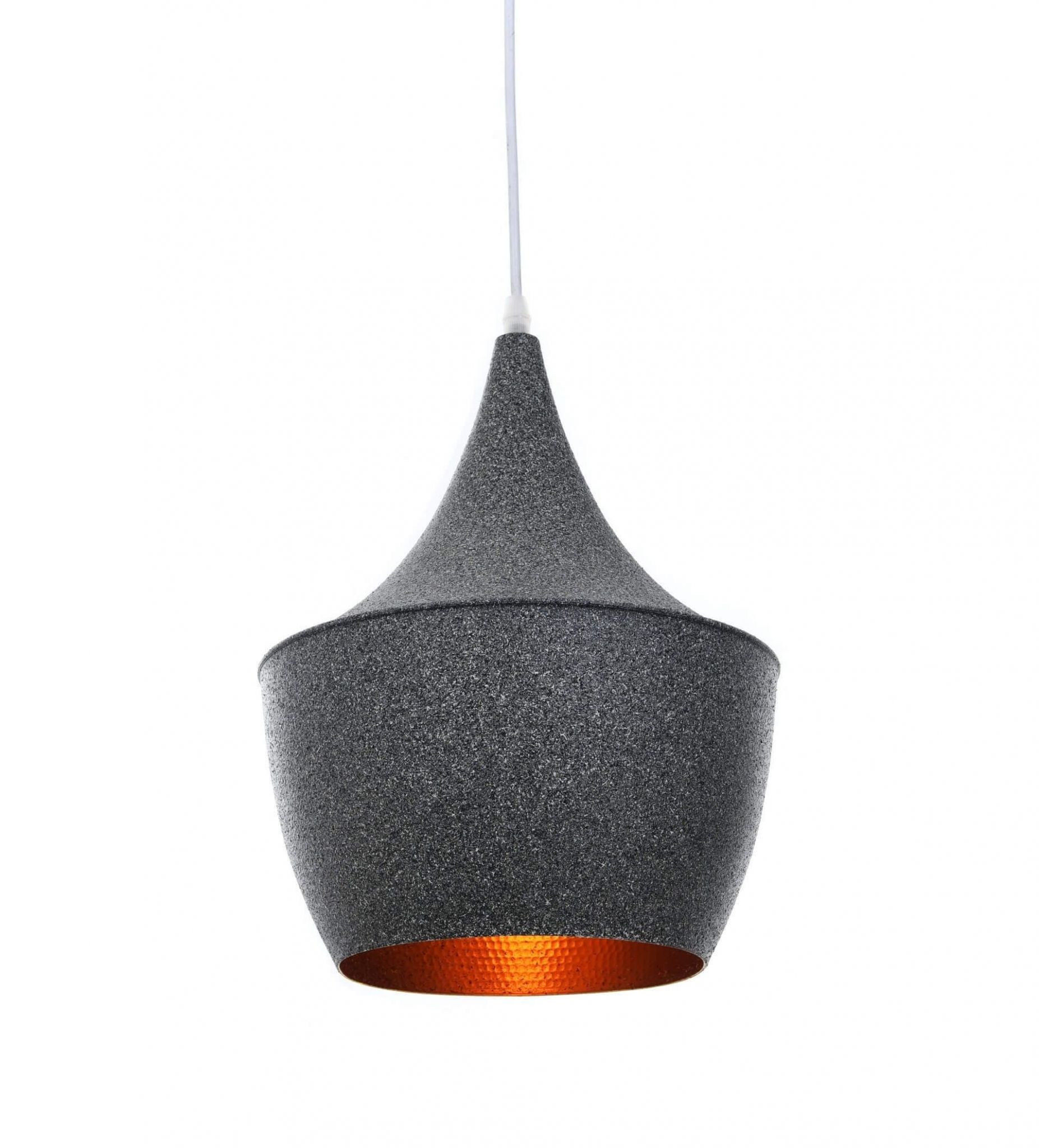 Kolekcja FOGGI 12B prezentuje oświetlenie o mocno zaakcentowanych cechach ery przemysłowej, gdzie produkty wystroju wnętrz były surowe, minimalistyczne, bez nadmiaru dekoracji. Lampy wiszące posiadają jeden główny punkt, który skupia całą uwagę, a jednocześnie jest jej najważniejszym elementem. Chodzi tutaj o klosz – perfekcyjnie dopracowany kształt, wykonanie oraz dobór materiału sprawiają, że wszystkie pozostałe części lampy podkreślają jego oryginalność. W modelu tym klosz posiada nierównomierną bryłę, która u góry tworzy bardzo wąski lej rozszerzający się ku dołowi, następnie pojawia się łączenie elementu górnego z dolnym oraz dolna część o dość regularnym, okrągłym kształcie. Aluminiowa konstrukcja klosza pokryta jest z zewnątrz barwą imitującą granit, zaś wnętrze pokryto fakturą w złotym kolorze, zjawiskowo uzupełniającym i podkreślającym elegancję granitu.