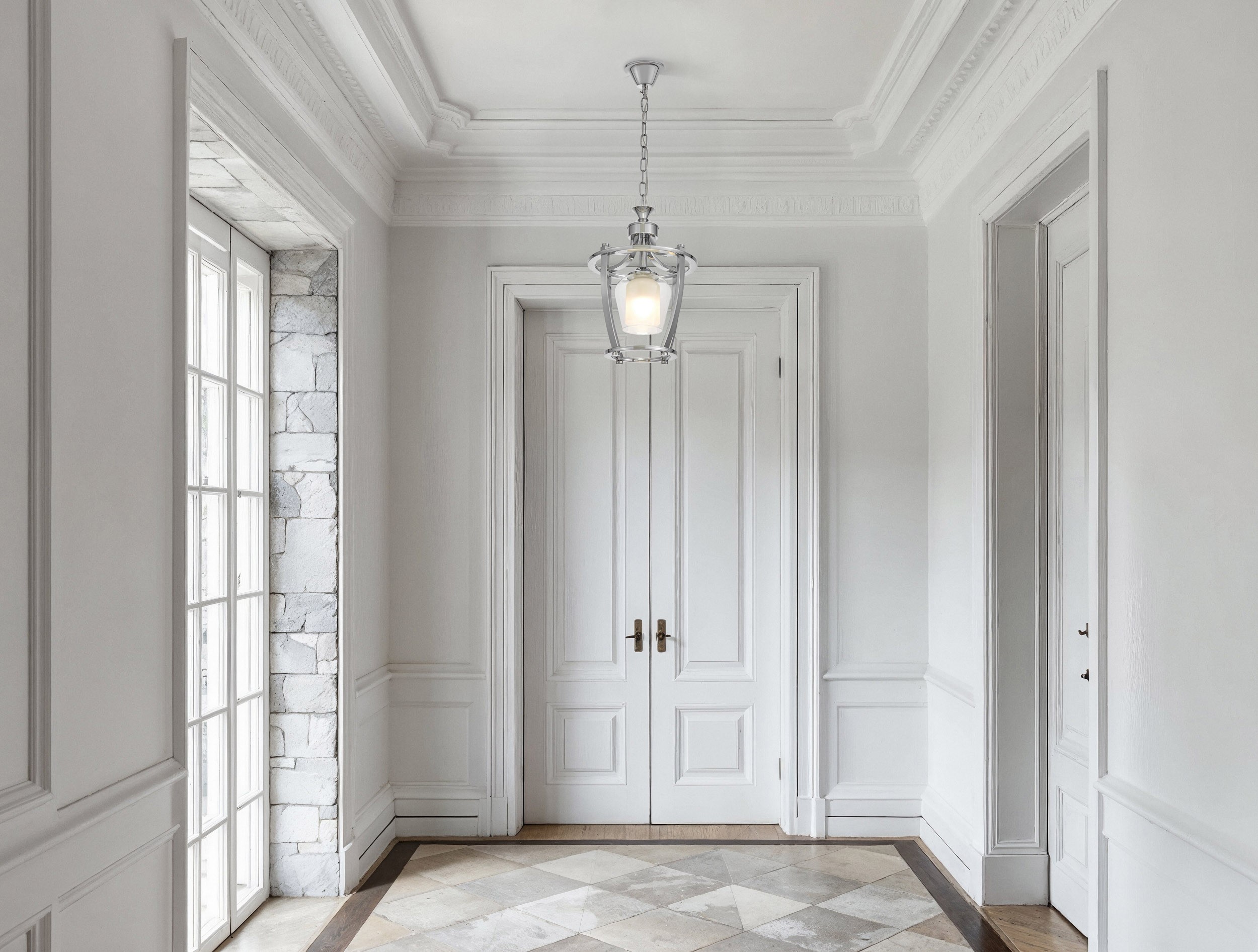 Kolekcja BROOKLYN zawiera w sobie wszystkie cechy, jakie powinno posiadać oświetlenie stworzone w duchu artystycznego stylu glamour, połączonego z przepełnionym bogactwem i nowoczesnością art deco. Rozpoczynając od najmocniejszego, najbardziej wyróżniającego się elementu lampy, czyli metalowej konstrukcji o chromowanej barwie, można dostrzec, że mimo względnego spokoju formy, dużo się tutaj dzieje. Dwa okręgi, połączone prostymi łącznikami, a wszystko to na górze scalone kolejnymi metalowymi pręcikami, zostało zwieńczone eleganckim uchwytem, z którego wysuwa się klasyczny, metalowy łańcuch. Prowadzi on prosto do chromowanej podsufitki, a przeplatany jest przezroczystym kablem, którego długość można wyregulować. W środku tej wyjątkowej konstrukcji znajduje się szklany, wykonany z podwójnych ścianek klosz o kształcie odwróconego kielicha. Całość sprawia wrażenie fantastycznego żonglowania pomysłami i sztuką użytkową.