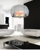 Precyzyjna, dopracowana w każdym szczególe konstrukcja to hołd dla nowoczesnej geometrii. Niebanalny kształt uciętej z dwóch stron kuli skrywa trzy chromowane klosze, będące jednocześnie punktami światła. Ich ciepła barwa równoważy chłód bijący od przejrzystego szklanego klosza. Całość zawieszono na cienkich przezroczystych kablach, przymocowanych do chromowanej podsufitki.