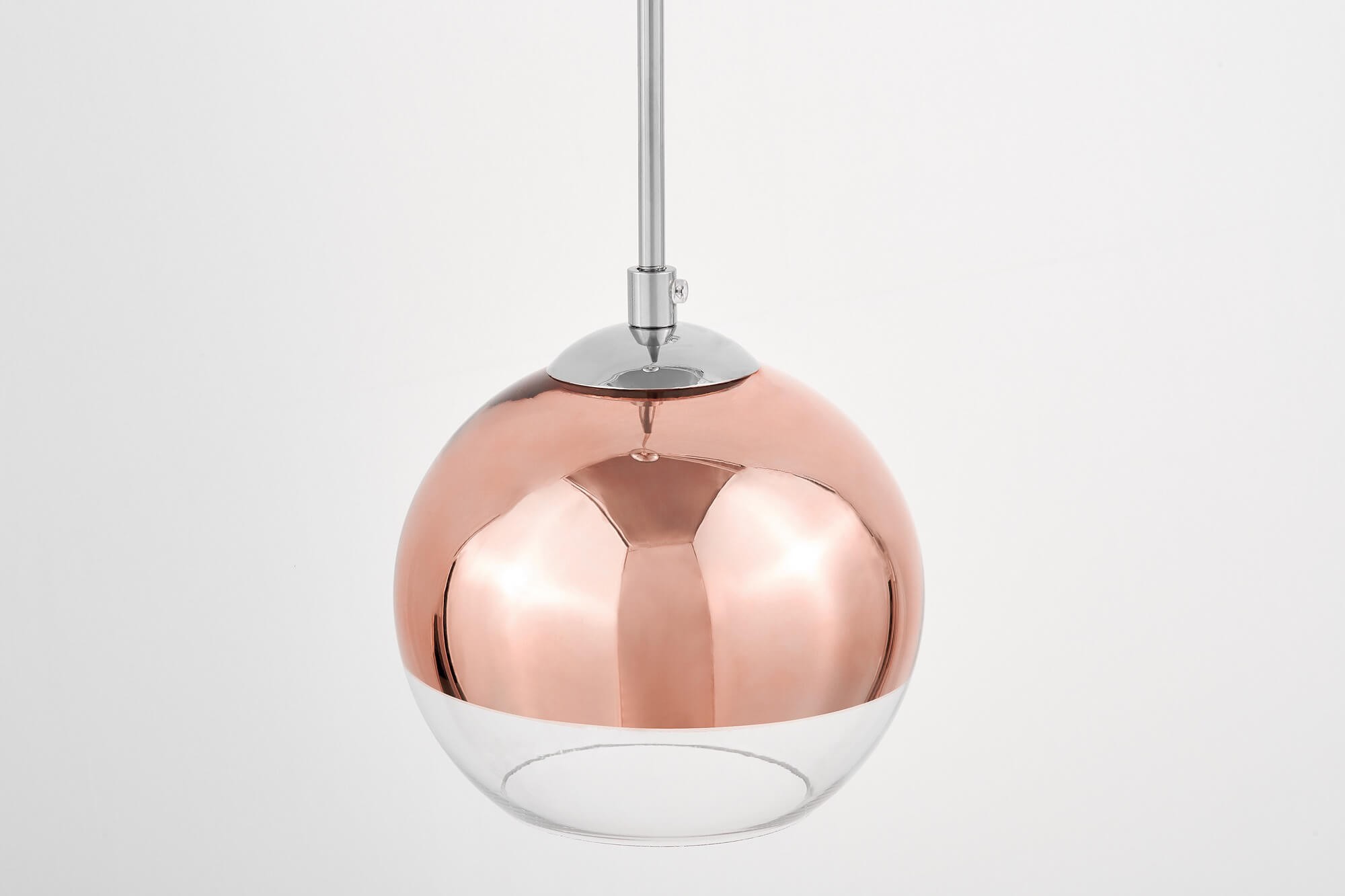 Seria produktów VERONI to estetyczna, a zarazem elegancka odsłona modnego oświetlenia, które pozwala w innowacyjny sposób udekorować przestrzeń oraz doświetlić ją za sprawą funkcjonalnych rozwiązań w projekcie. Główną częścią składową lampy wiszącej jest sporej wielkości szklany klosz, od góry ozdobiony metaliczną, różowo złotą barwą, która wypełnia jego powłokę do połowy. Dół klosza jest przezroczysty oraz otwarty, co pozwala światłu wydostać się na zewnątrz i dostarczyć dzięki temu więcej jasnego blasku. Na funkcjonalizm lampy ma również wpływ przezroczysty kabel, którego regulacja wysokości jest na tyle szeroka, że pozwala umieścić lampę zarówno 30, jak i 120 centymetrów pod sufitem. Mocowanie kabla to delikatna, metalowa rurka połączona z płaskim uchwytem klosza na dole oraz bezpośrednie przytwierdzenie do podsufitki w kształcie kopuły.