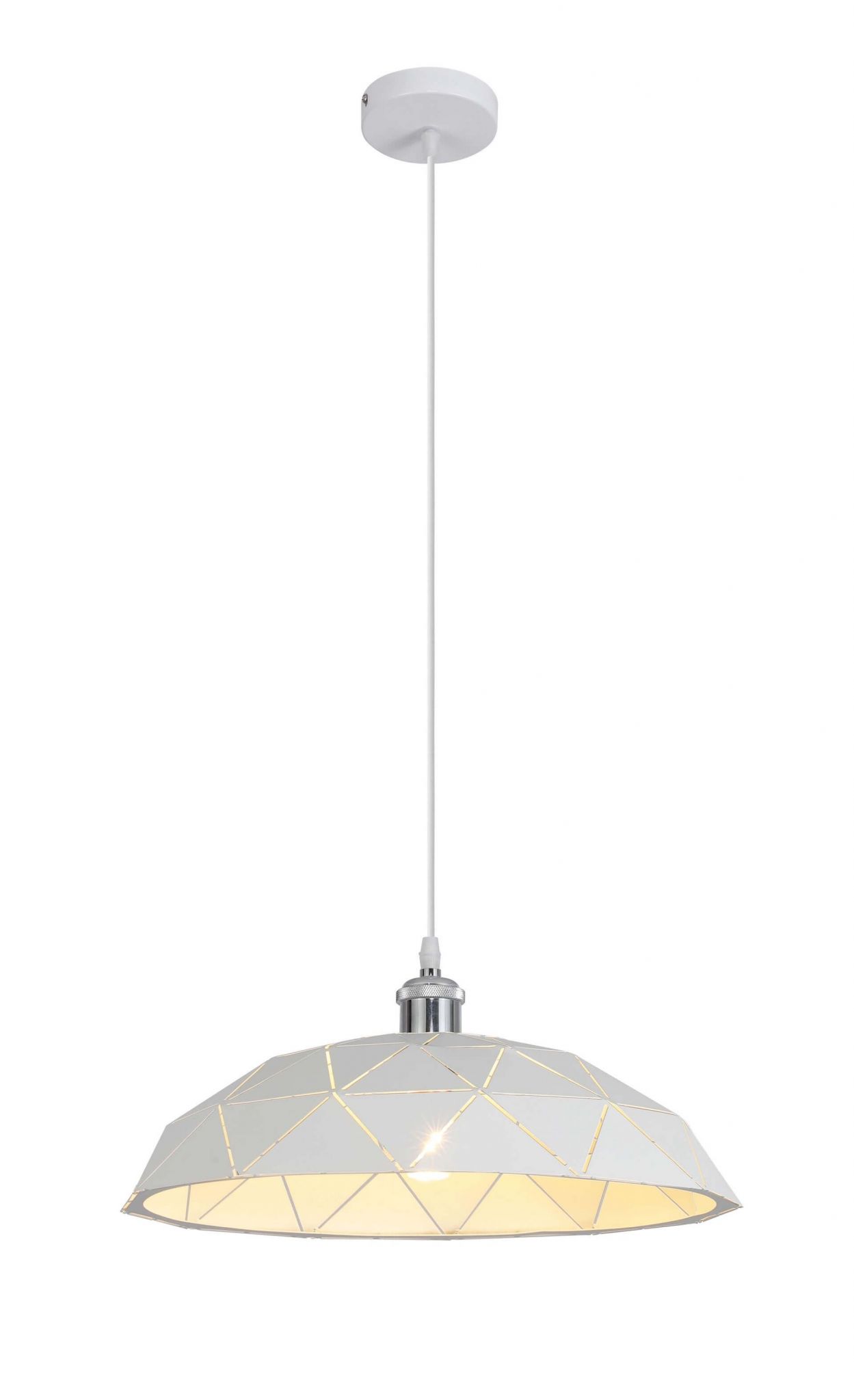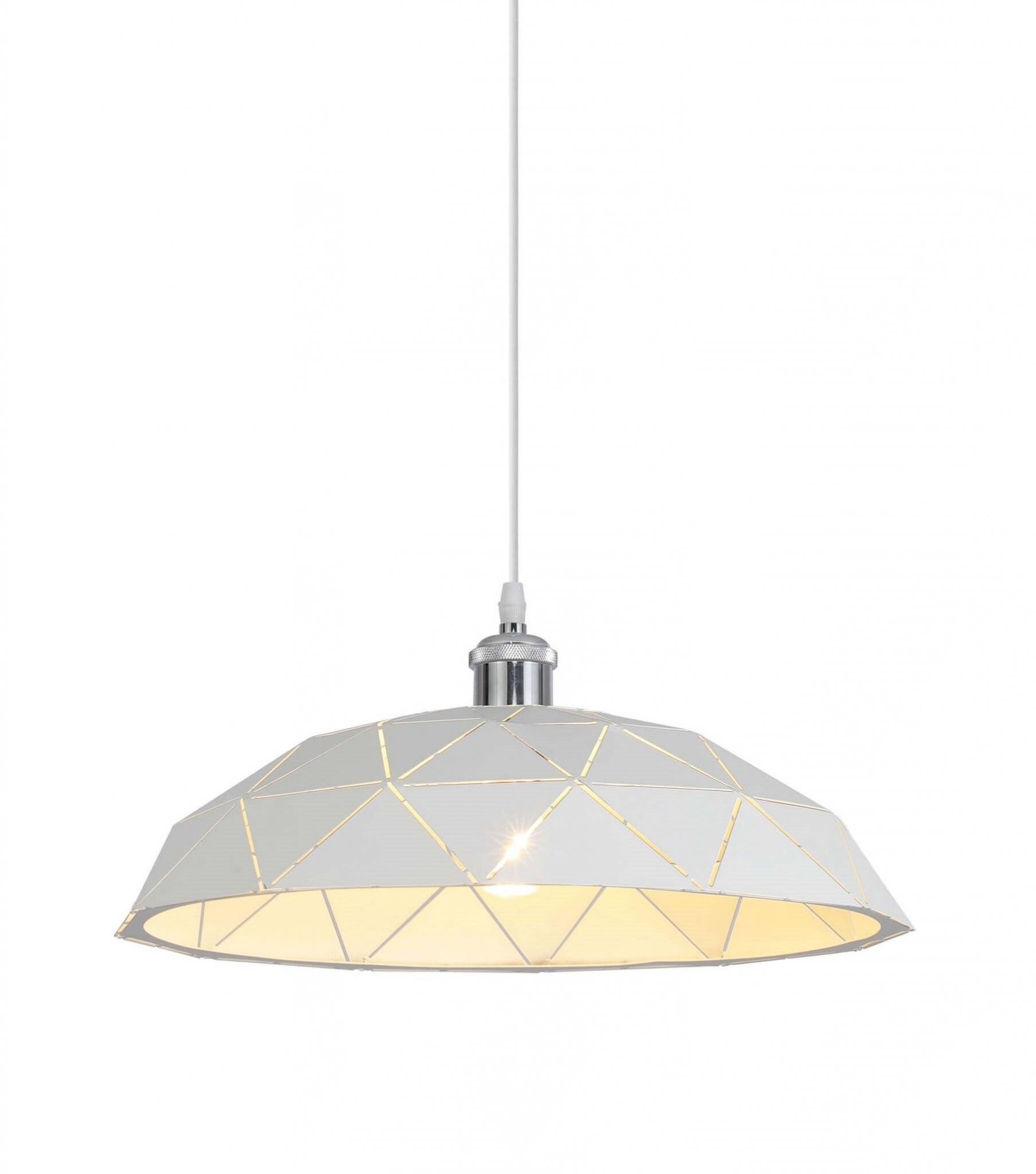 We współczesnej architekturze wnętrz króluje moda na prostotę, a jedną z jej przedstawicielek jest wykonana w nowoczesnym, skandynawskim stylu lampa wisząca GROSETTO. Aranżacja białej oprawy o geometrycznej strukturze wraz z metalem, jako głównym budulcem produktu powodują, że solidna, a jednocześnie odporna na wszelkie niedogodności, będzie perfekcyjnym źródłem światła w jadalni czy kuchni. Nowoczesna, a zarazem stylizowana na wzór skandynawski kolekcja GROSETTO będzie fantastycznym pomysłem nie tylko na oświetlenie dużych przestrzeni domu czy mieszkania, ale także na wkomponowanie w aranżację wnętrza produktu niebagatelnego, interesującego oraz funkcjonalnego. Klosz lampy powstał w całości z metalu i pokryty został białą barwą. Charakterystyczne linie cięcia metalu tworzą geometryczny wzór oparty na trójkątach, które komponują się w trzy równe rzędy zbiegające ku górze. Kształt klosza jest kopułą z mocno zaakcentowanym, chromowanym detalem u górze, pełniącym rolę uchwytu. Jego prostota i brak upiększeń, a także zwykły, biały kabel zakończony płaską, okrągłą podsufitką podkreślają innowacyjny charakter oświetlenia. Pomimo swoich znacznych rozmiarów lampa pozostaje lekka, co spowodowane jest techniką obróbki metalu wykorzystanego do produkcji klosza. We współczesnej architekturze wnętrz króluje moda na prostotę, a jedną z jej przedstawicielek jest wykonana w nowoczesnym, skandynawskim stylu lampa wisząca GROSETTO. Aranżacja białej oprawy o geometrycznej strukturze wraz z metalem, jako głównym budulcem produktu powodują, że solidna, a jednocześnie odporna na wszelkie niedogodności, będzie perfekcyjnym źródłem światła w jadalni czy kuchni.