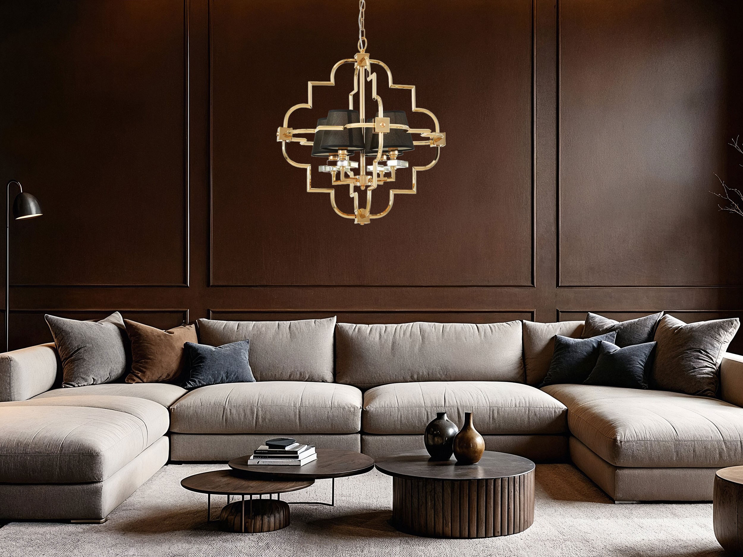 Pierwszy rzut oka na kolekcję BALTIMORE obrazuje, czego można spodziewać się po prezentowanym zbiorze lamp wiszących. Szyk, klasa i wyrafinowane kompozycje produktów pozwolą w prosty sposób przekształcić zwykłe pomieszczenie w pełne luksusu i wyjątkowości wnętrze. Wśród zalet lampy wiszącej tej serii znaleźć można przede wszystkim liczbę punktów świetlnych pod postacią klasycznych abażurów, spod których światło wydostaje się w formie przytłumionego, nieco przygaszonego blasku, co pozostawia w pomieszczeniu klimatyczną poświatę. Dzięki temu nastrój wnętrz pozwala na niczym niezakłócony odpoczynek i relaks. Podkreślająca głęboką czerń abażurów złota kompozycja utworzona z metalowej, ciekawie zaaranżowanej ramy, tworzy z lampy małe dzieło sztuki nowoczesnej. Jej minimalizm, a jednocześnie wyszukana forma i zastosowane kształty kreują produkt wielowymiarowy i spójny zarazem.